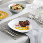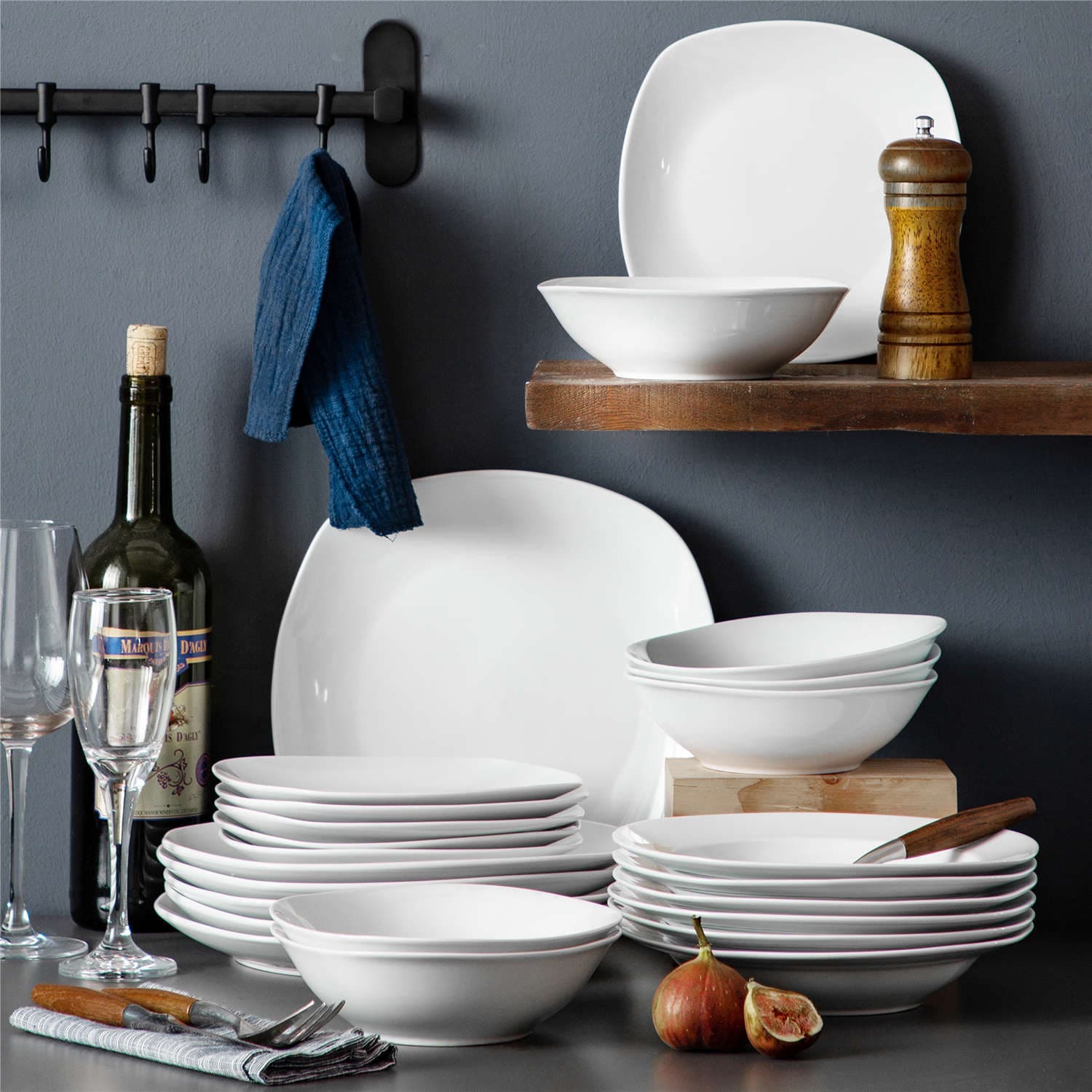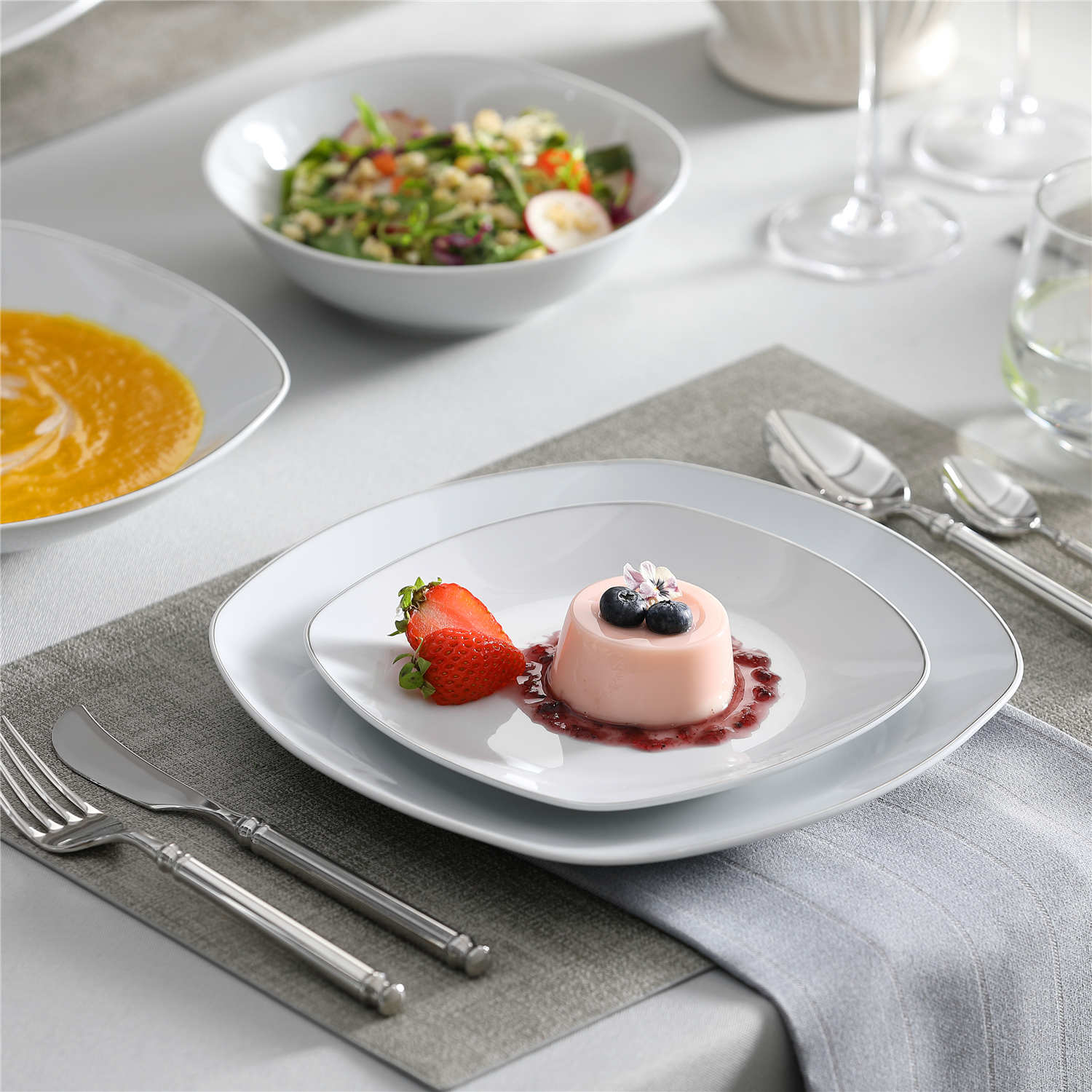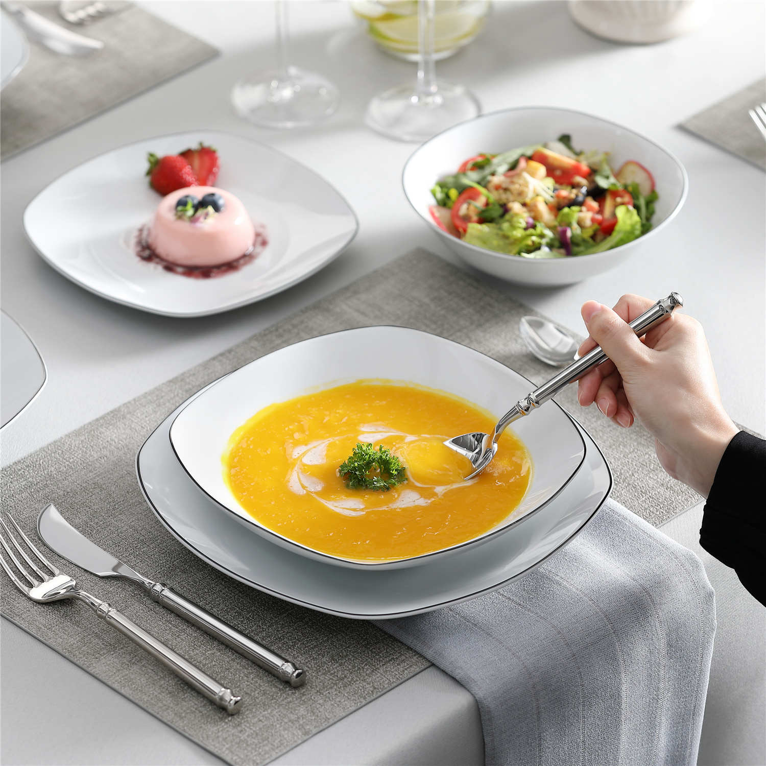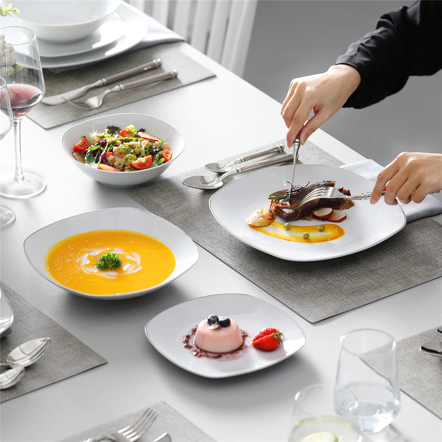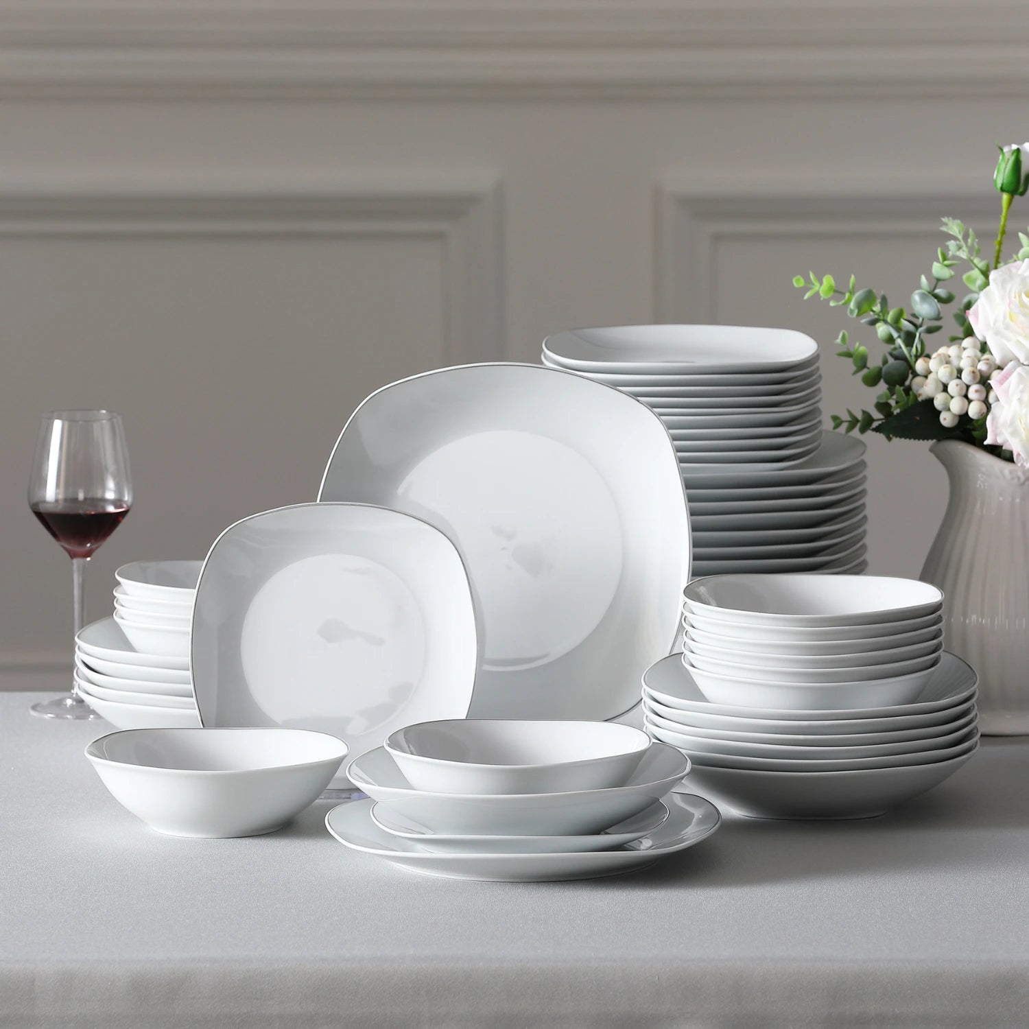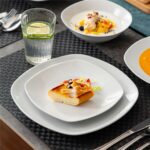 • Fine porcelain square dinnerware set, service for 6, neutral white