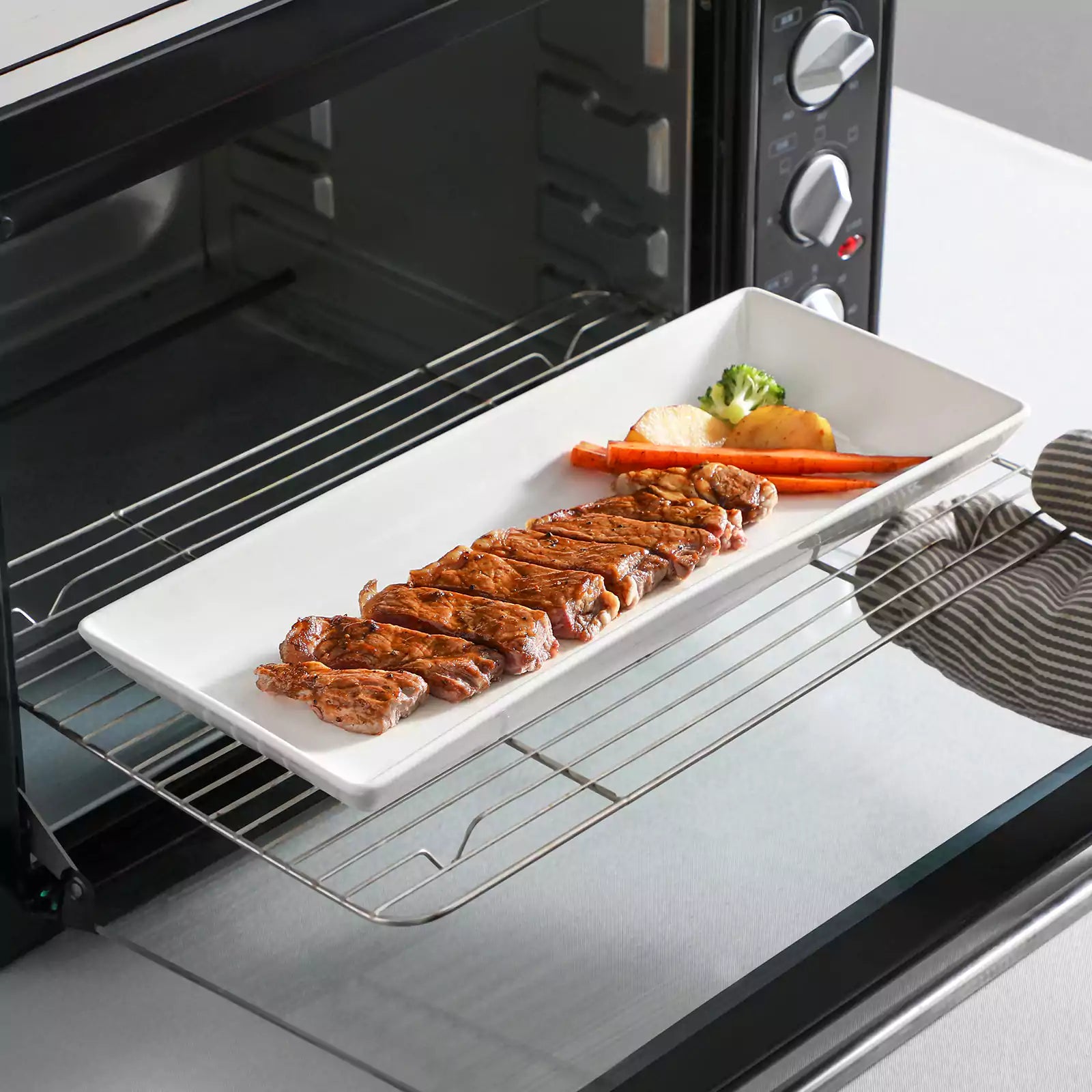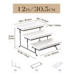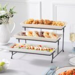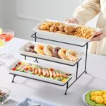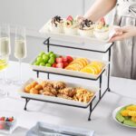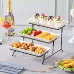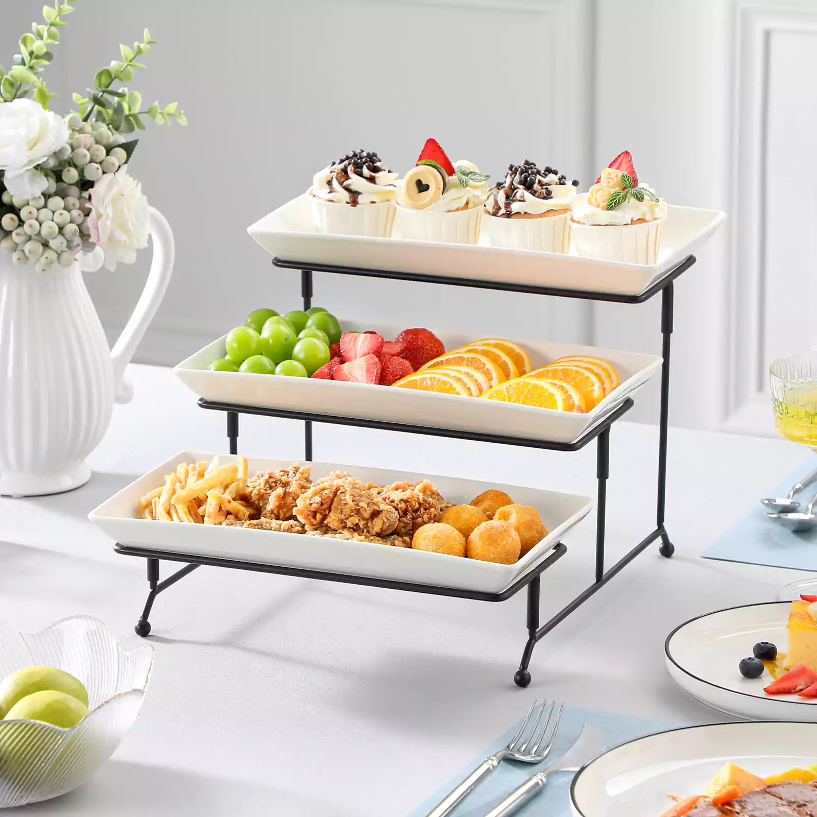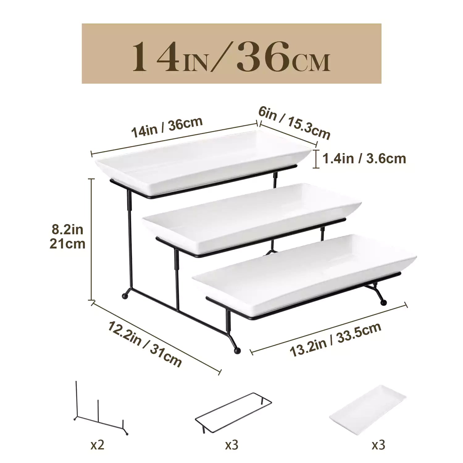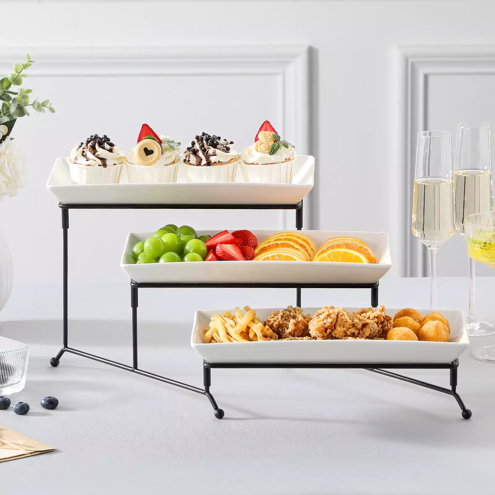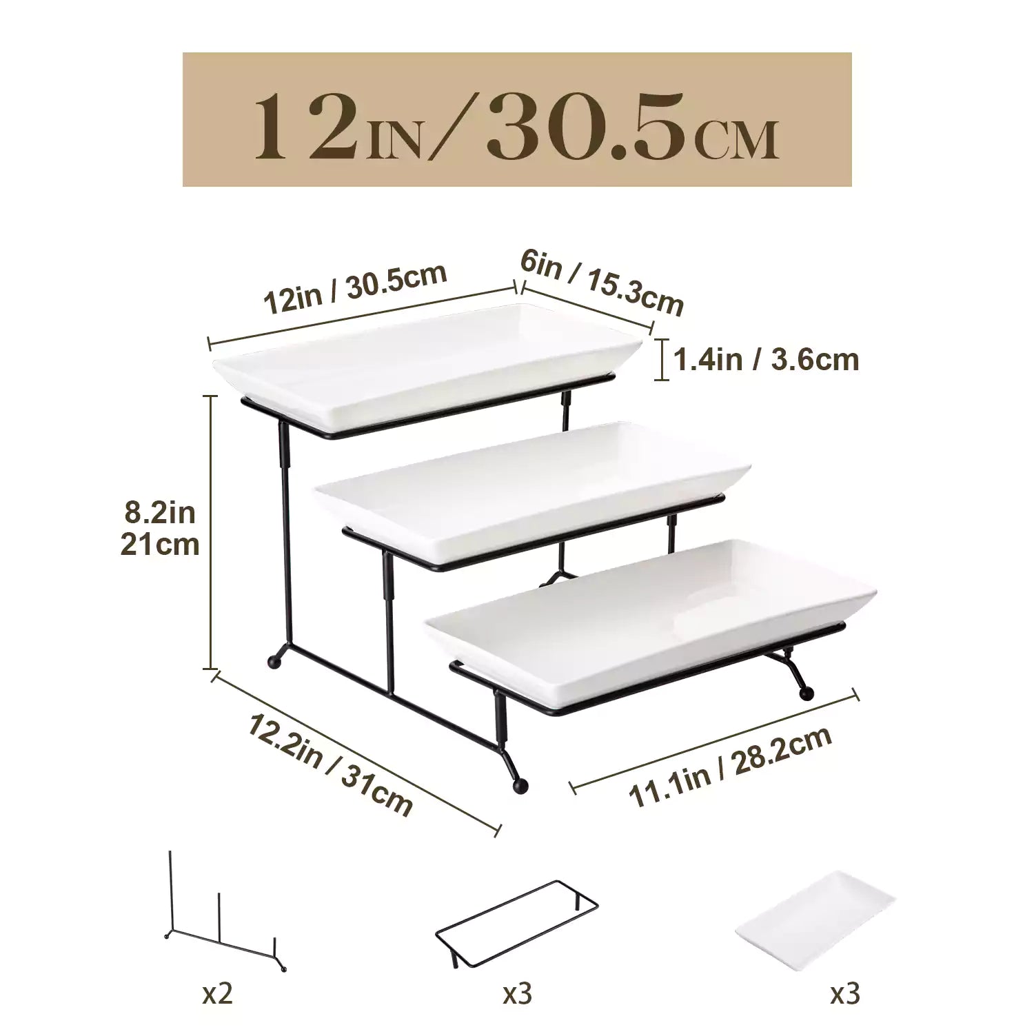 This glossy white 3-tier server blends modern design with practical versatility, available in 12-inch and 14-inch sizes to suit any occasion. The sturdy cast iron stand holds three rectangular porcelain plates, featuring a smooth, glossy white finish and gently tilted rims to prevent spills. Perfect for serving appetizers, fresh fruit, pastries, and more, it adds a refined touch to buffet tables and kitchen counters. The porcelain plates are microwave, oven, and dishwasher safe, while the stand should be wiped clean. Also great as a stylish organizer for jewelry and office essentials.