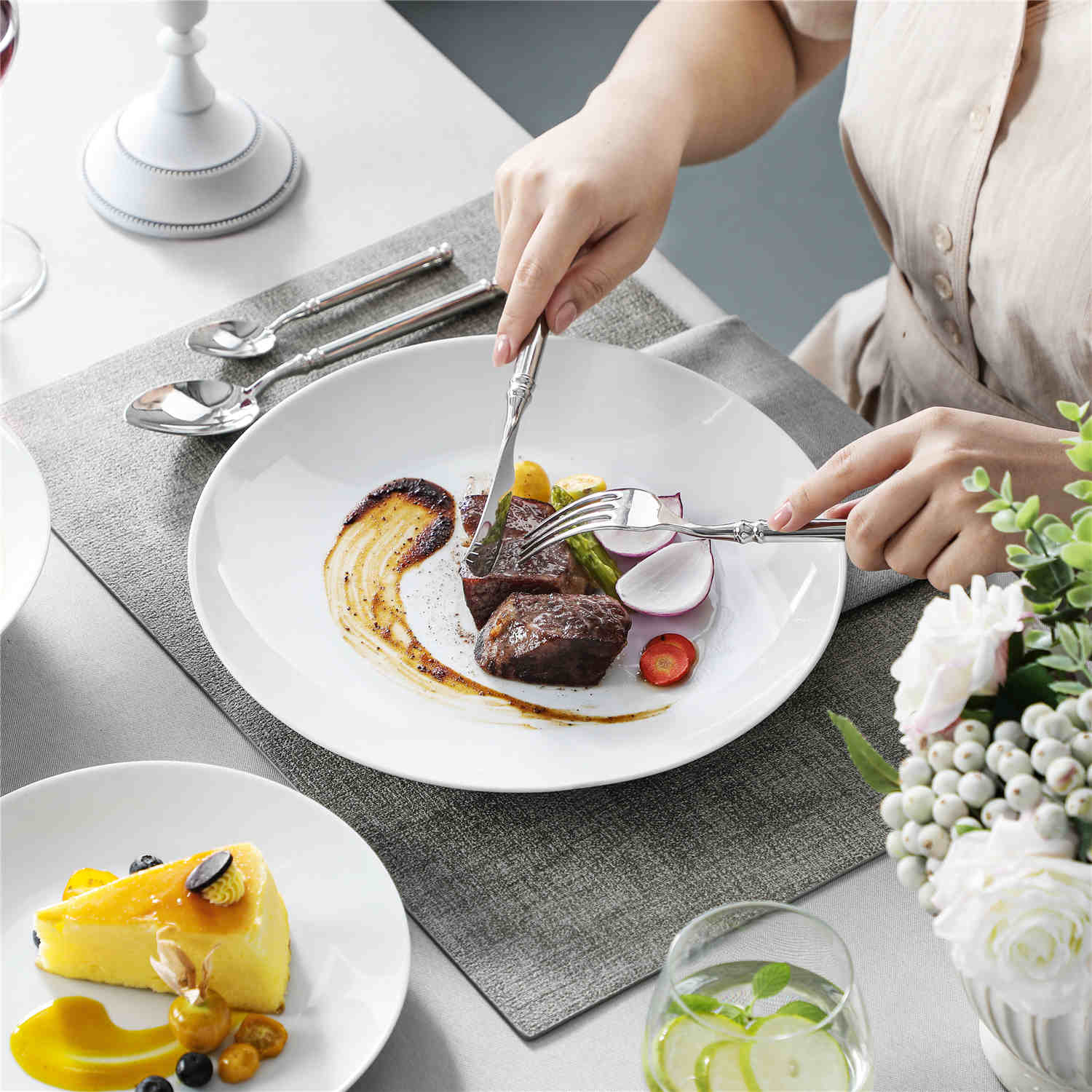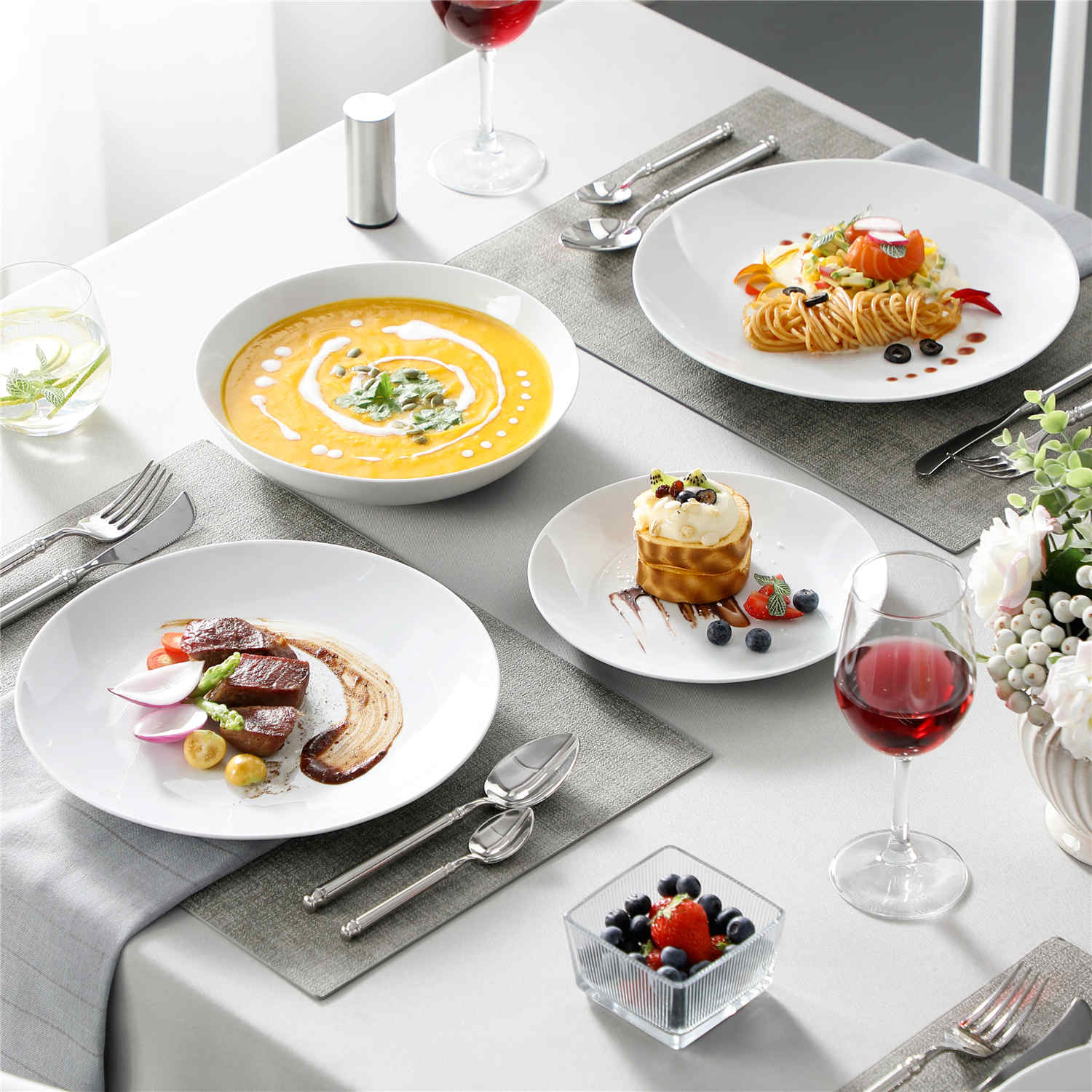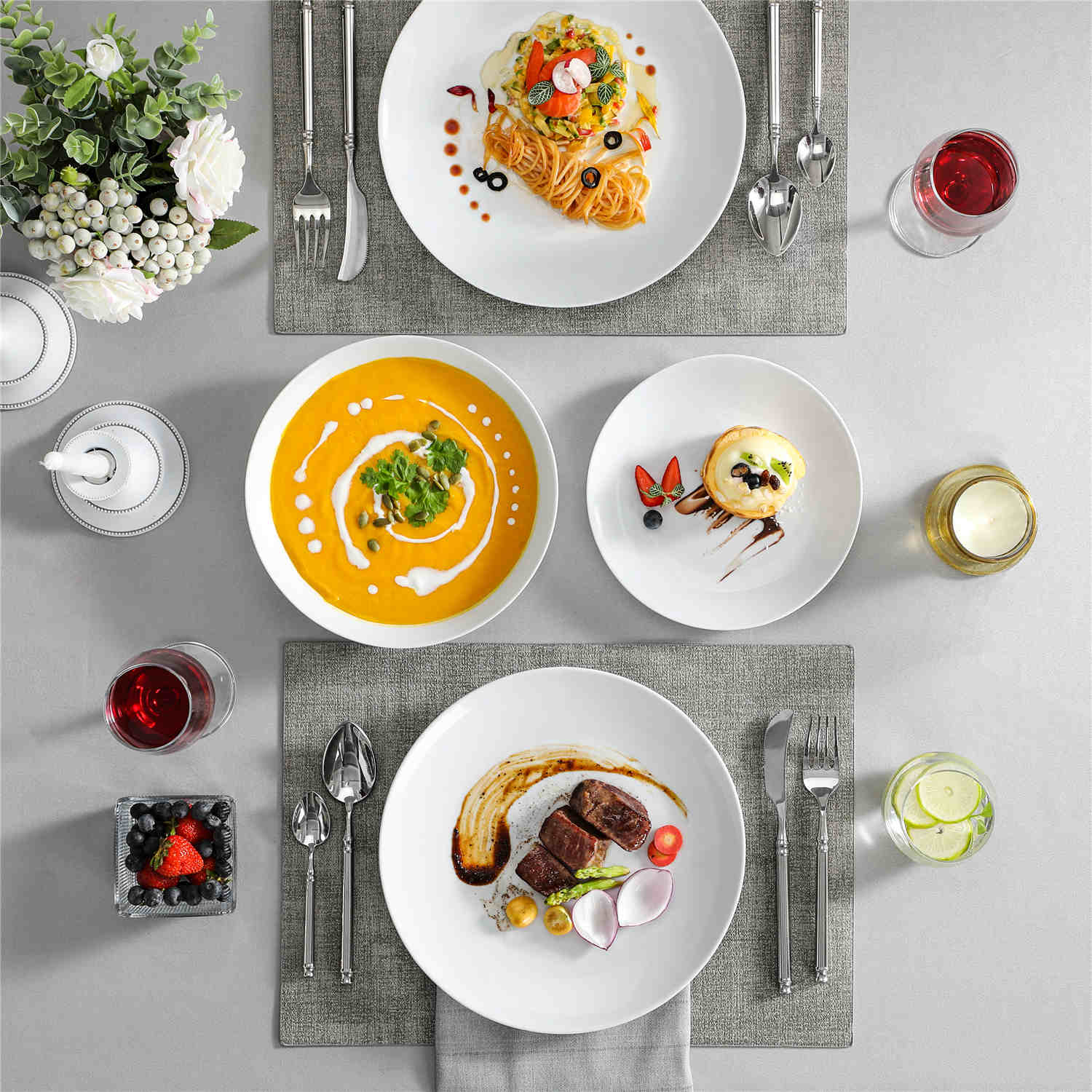 Crafted from premium gourmet porcelain, the Amelia 18-Piece Set offers scratch resistance and lasting durability, ideal for home dining or the hospitality industry. Serving six, it includes dinner plates, salad plates, and soup plates in a versatile off-white hue. The classic round design adds sophistication, while the stackable, space-saving structure ensures easy storage. Microwave, oven, and dishwasher safe, the Amelia set combines timeless style and practicality for modern table settings and everyday use.