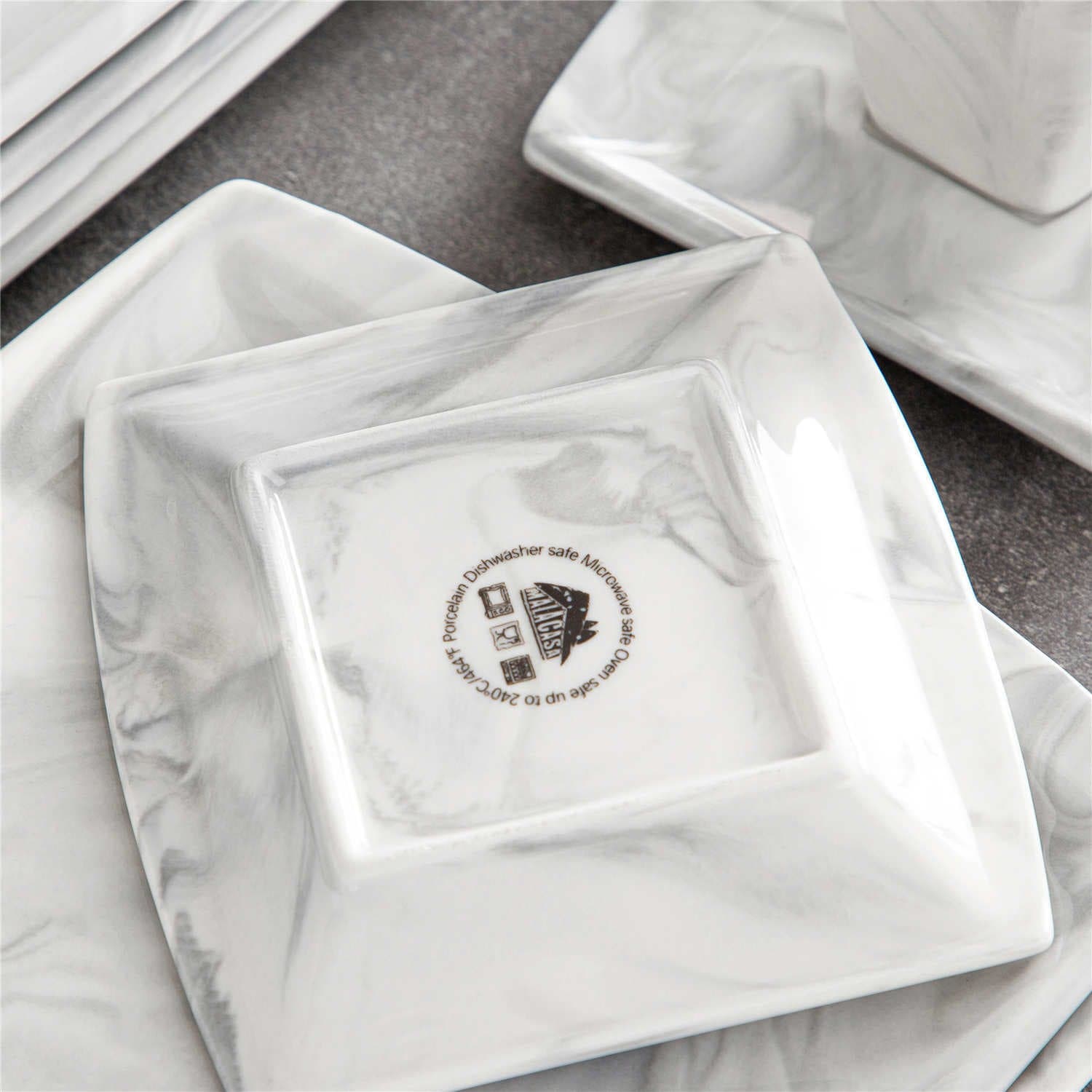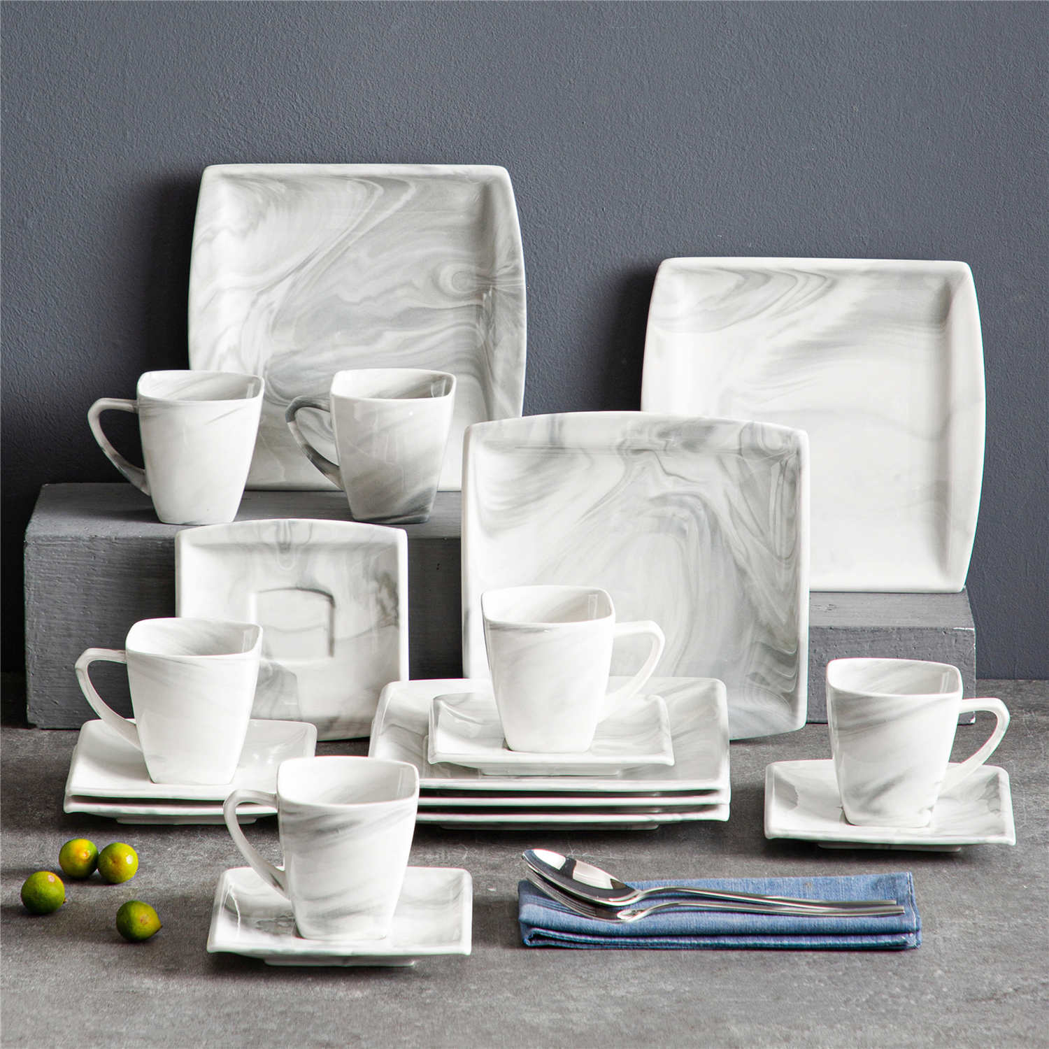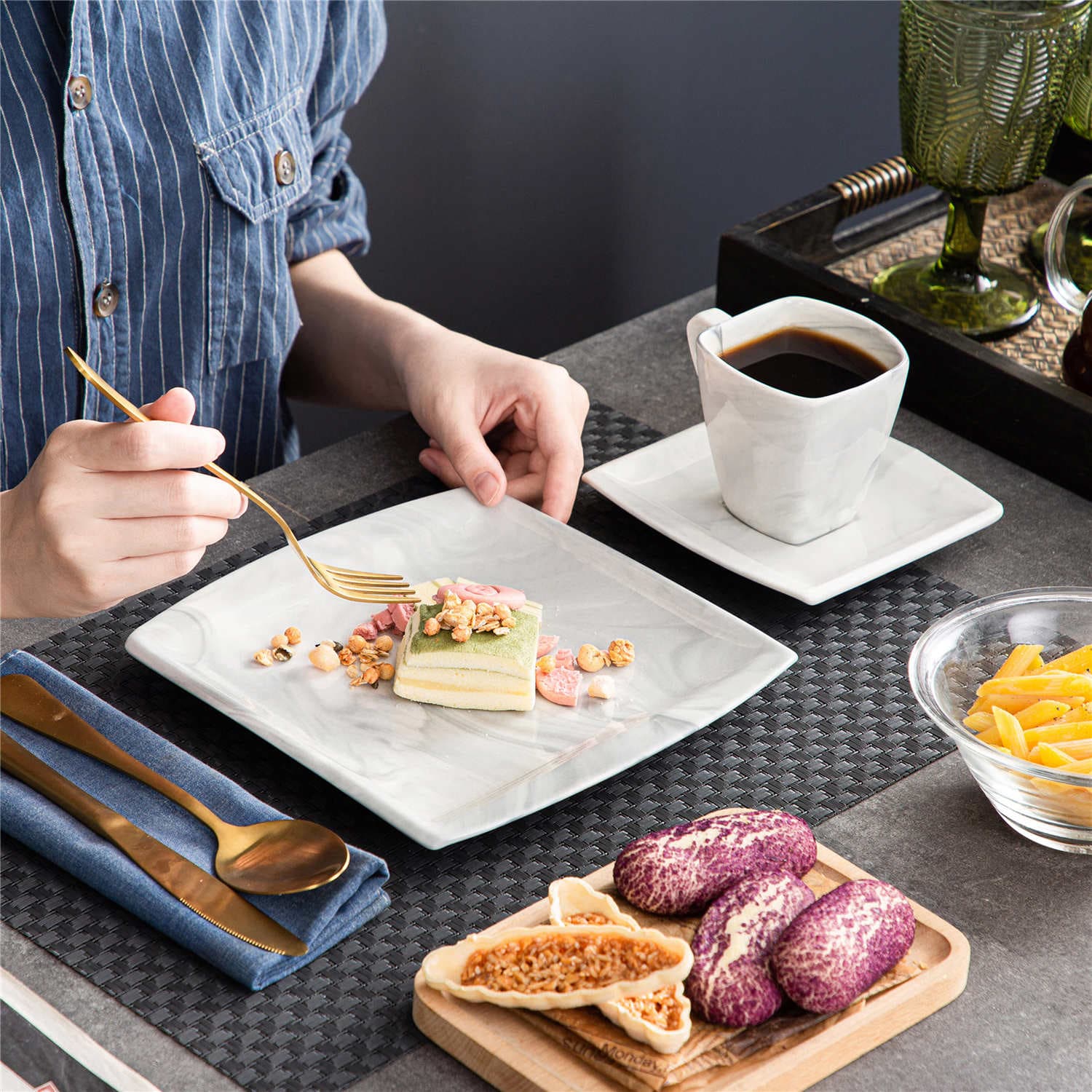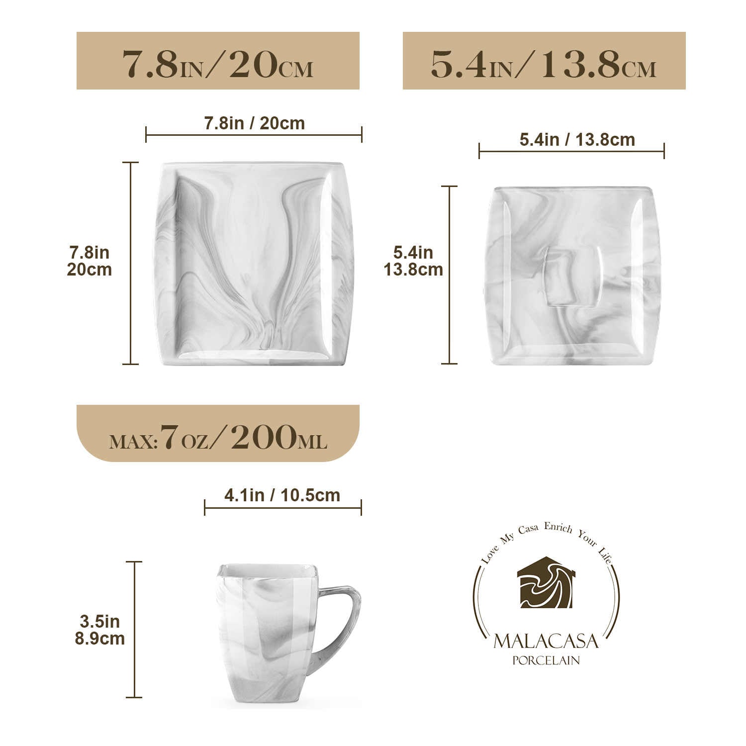 - Fine porcelain square dessert coffee set, service for 6, ivory white/marble grey