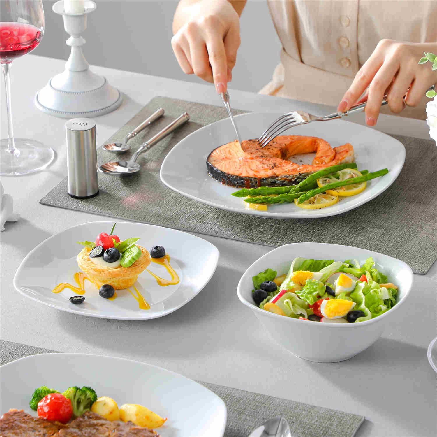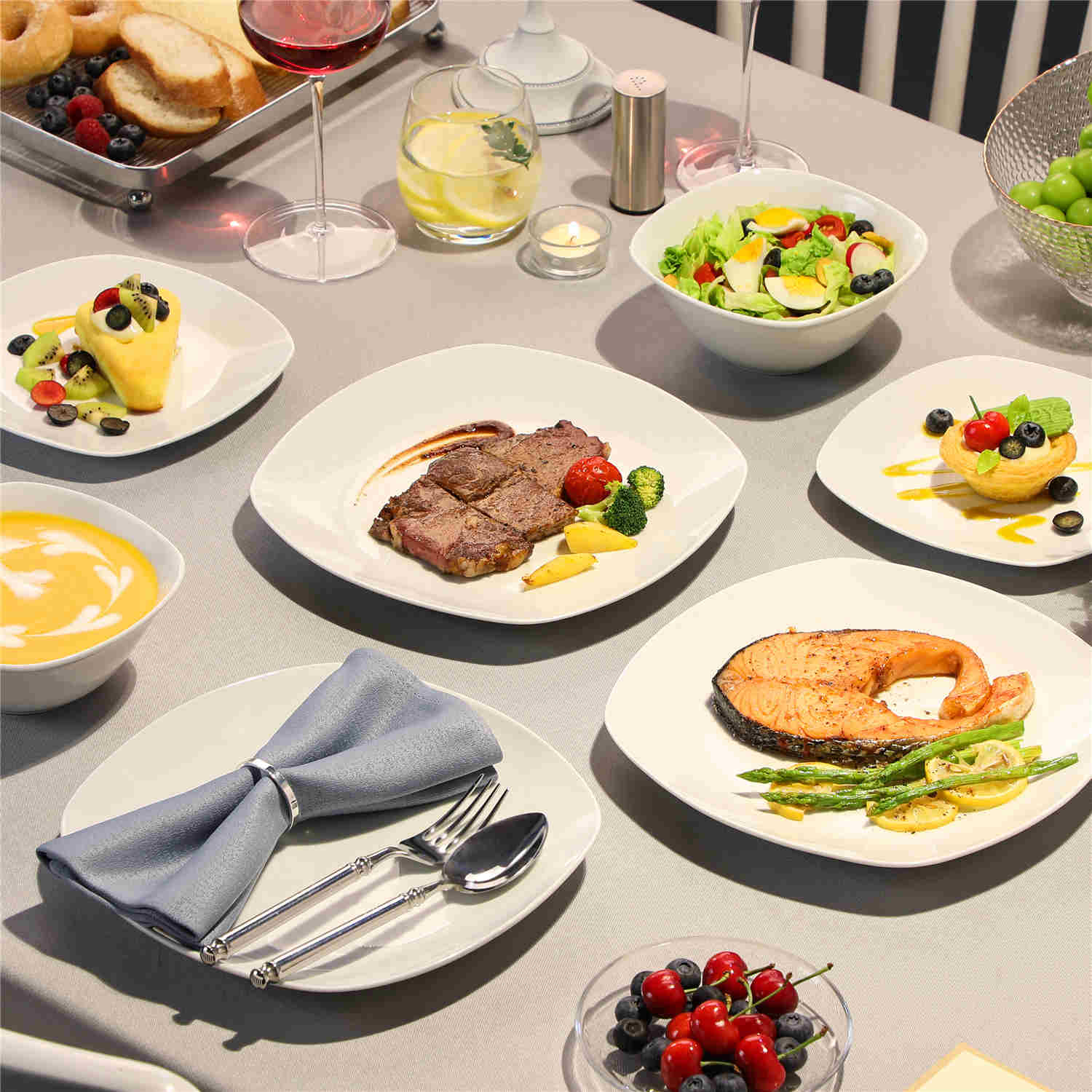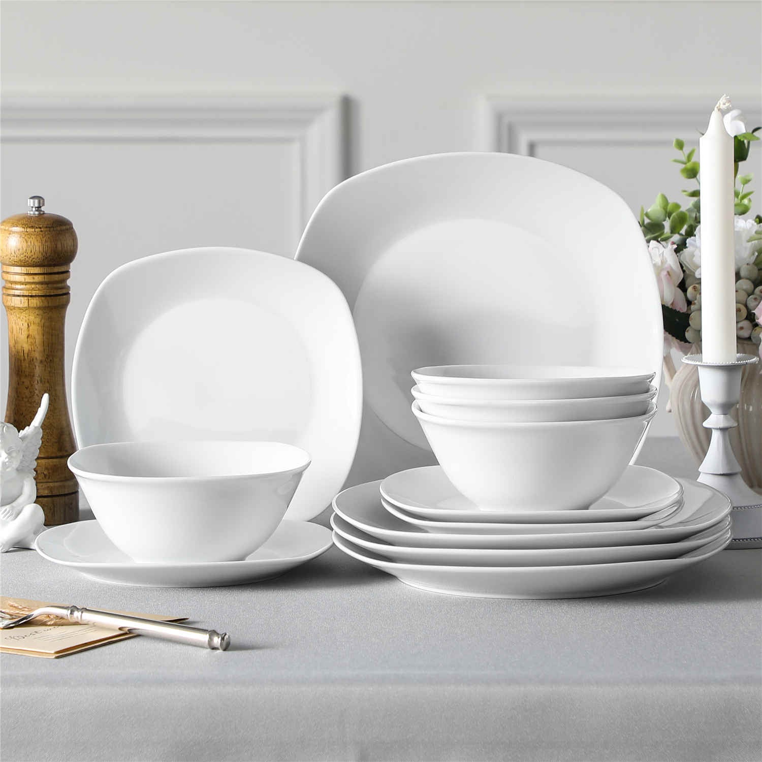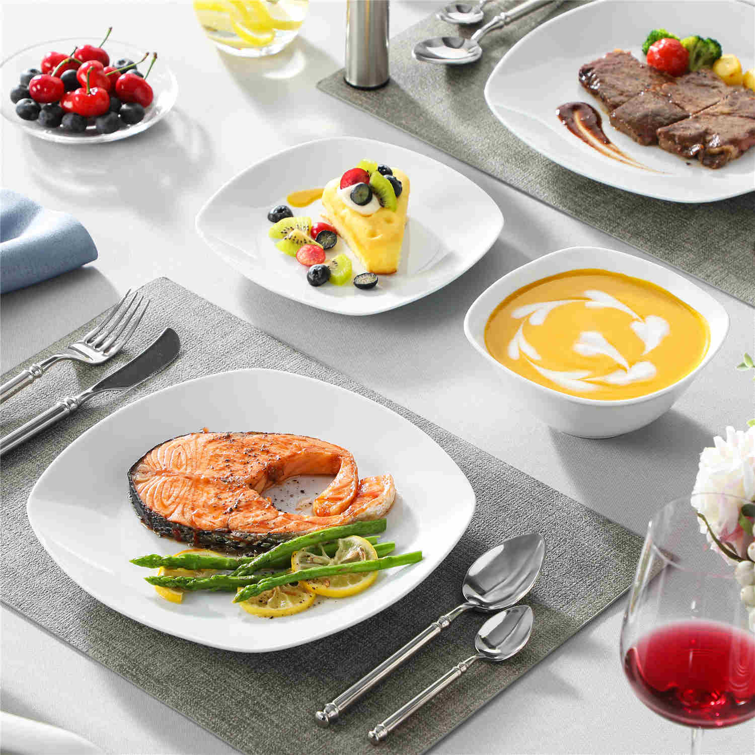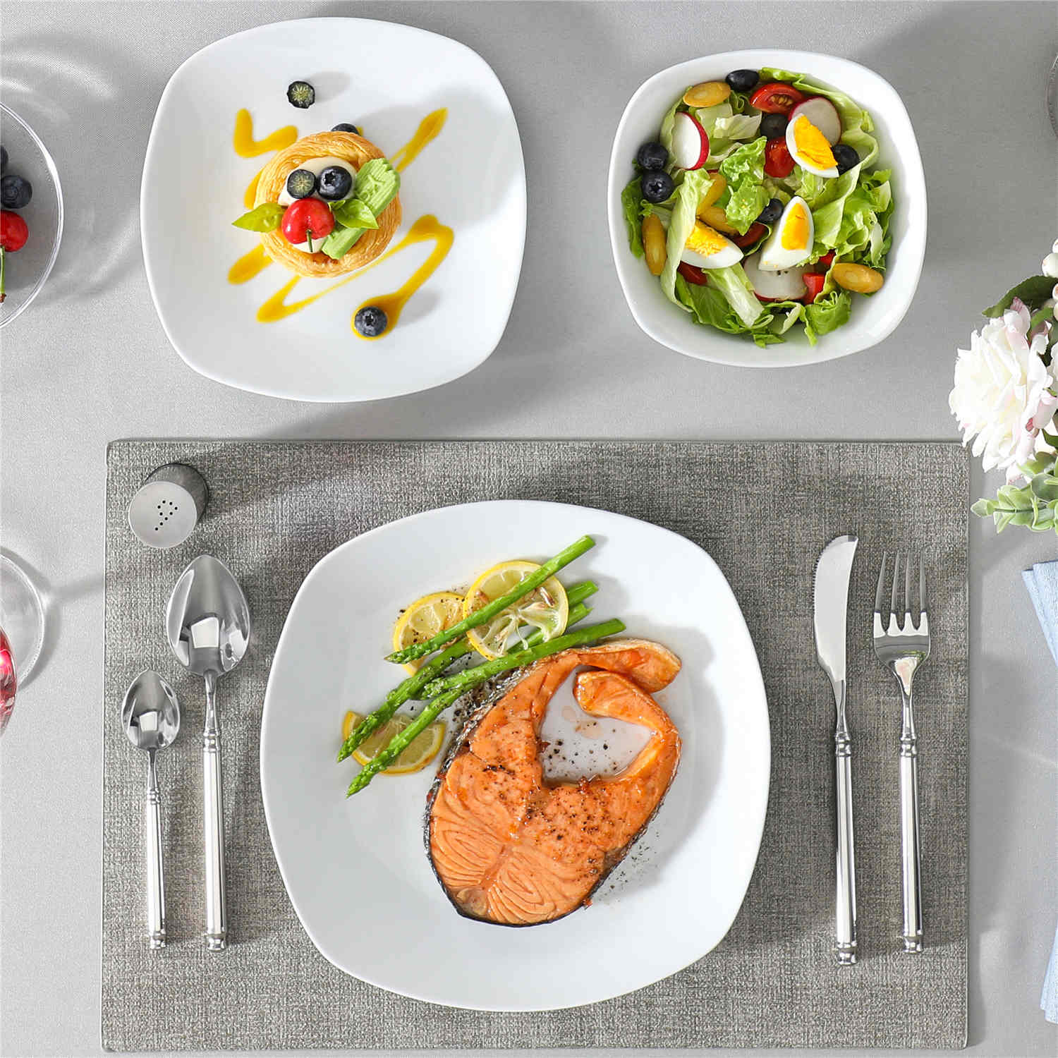 Featuring a contemporary rounded square silhouette in a sophisticated grey-white palette, this dinnerware set includes dinner plates, dessert plates, and uniquely designed cereal bowls, distinct from the traditional Elisa series. Crafted from resilient porcelain, it ensures robust durability and is both microwave and dishwasher safe for convenient maintenance. Certified lead and toxin-free, it embodies safety and sustainability. From casual brunches to refined dinner settings, this set effortlessly elevates every dining occasion with its sleek, versatile design.