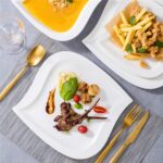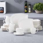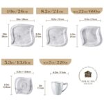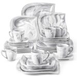 - Fine porcelain leaf-shaped square dinnerware set, service for 6, ivory white/marble grey