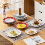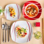 Crafted from fine porcelain, this dinnerware set for 6 features a sleek grey-white glaze with delicate red line decals. The unique design blends square and round edges, offering a modern yet elegant look. Including dinner plates, dessert plates, and soup bowls, it’s versatile for various dining needs. Sturdy and non-toxic, perfect for everyday use and special occasions alike. The high-temperature firing process ensures durability and crack resistance, making it safe for oven, microwave, and dishwasher use. This set brings a refined touch to any dining experience.