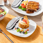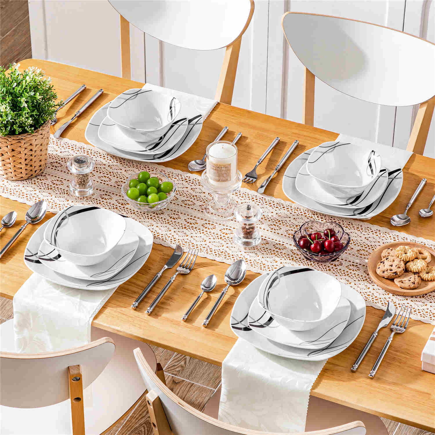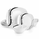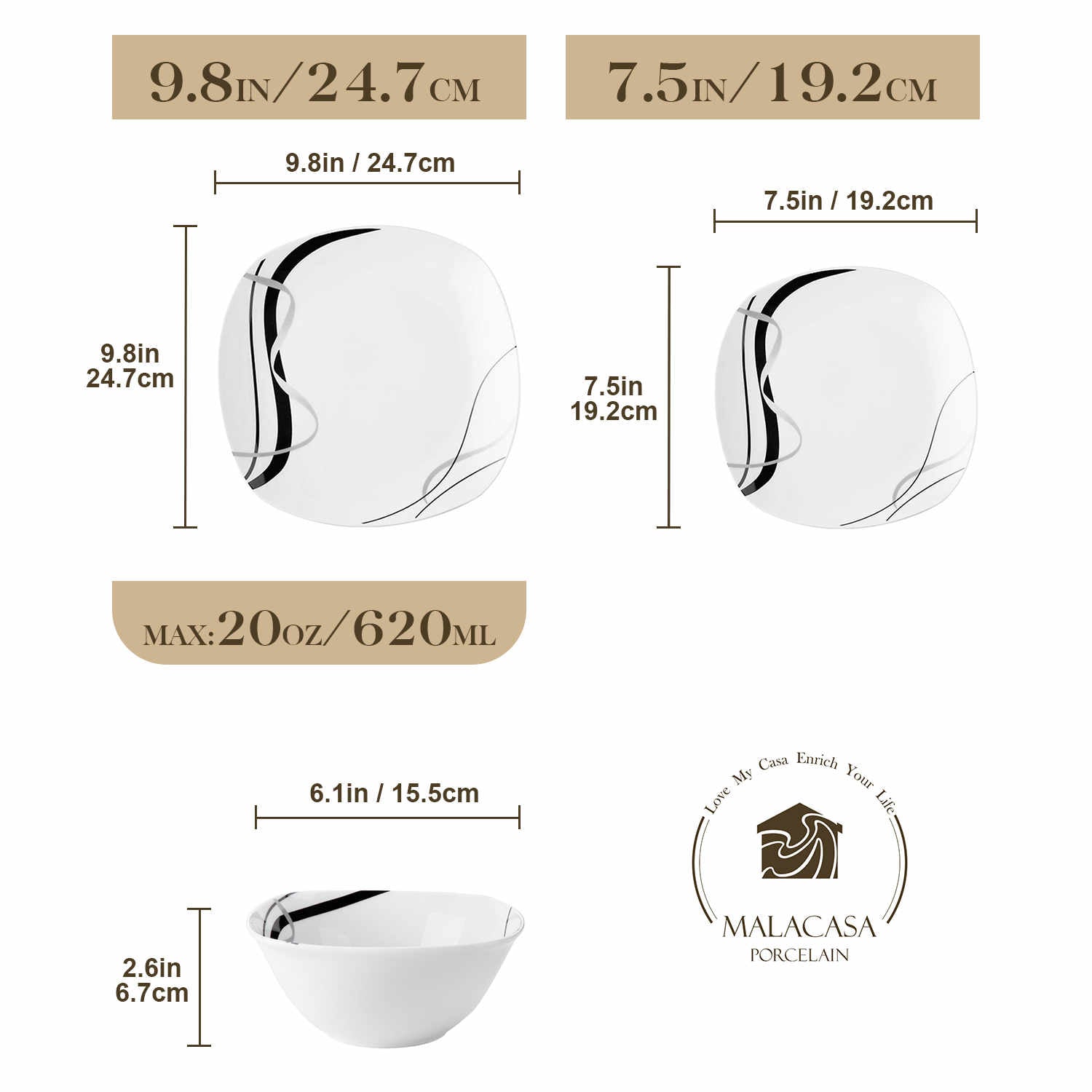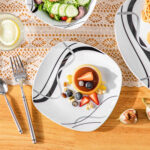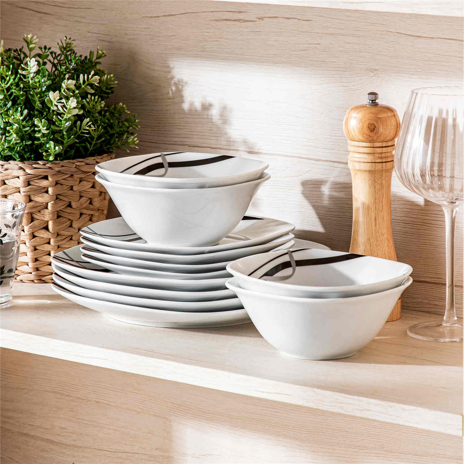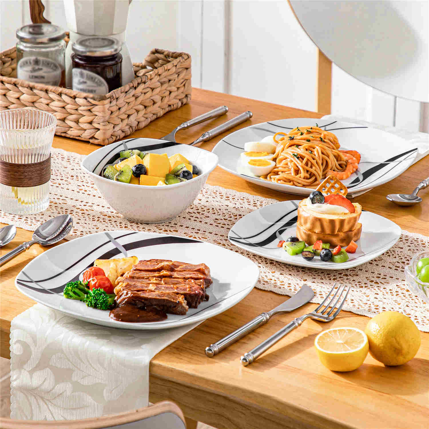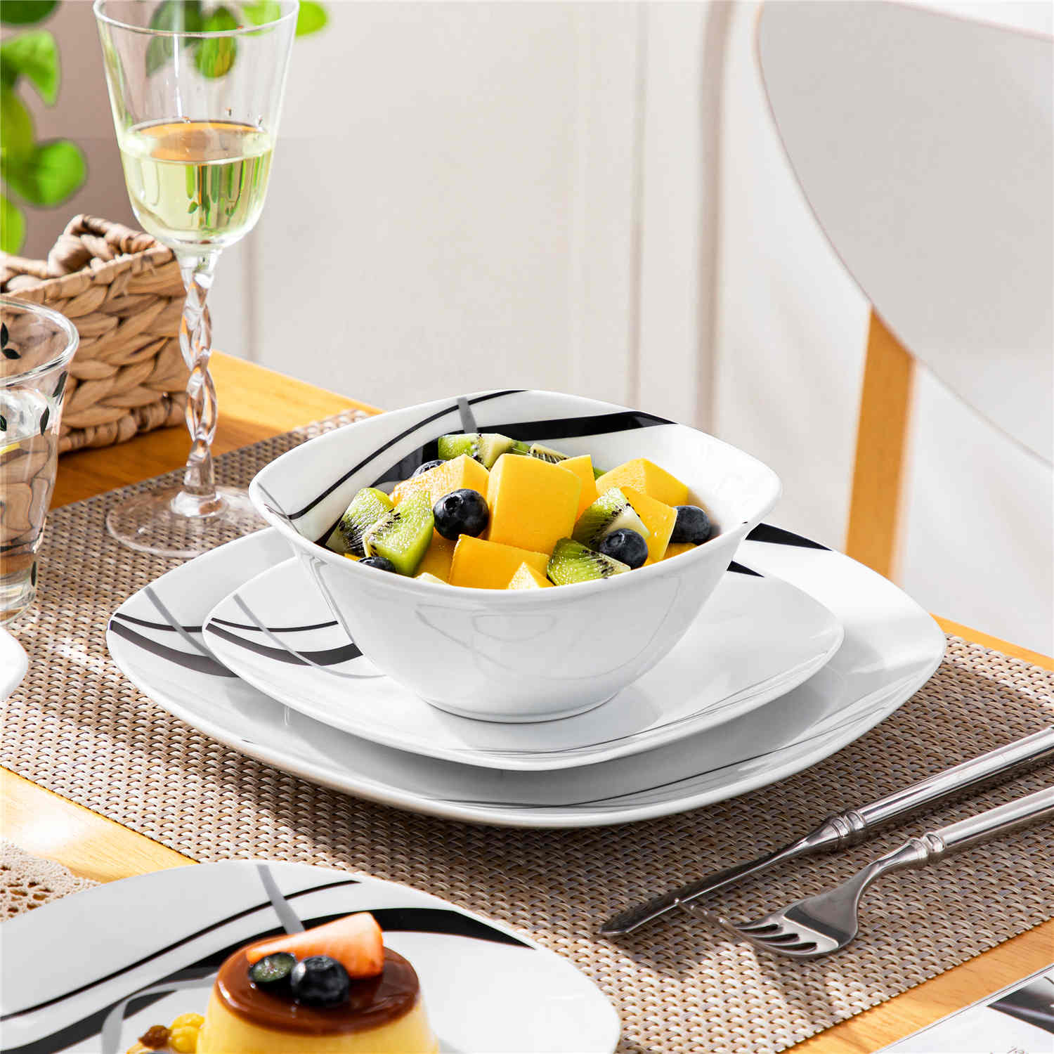 The Fiona collection combines modern style with lasting durability, crafted from high-temperature fired porcelain. Its rounded square design blends classic curves with contemporary lines, perfect for minimalist settings. The off-white color with black and silver-gray wavy accents adds a natural charm. This set includes 4 dinner plates, 4 salad plates, and 4 cereal bowls, all microwave, dishwasher, and oven safe. Non-porous, stain-resistant, and stackable for easy storage, the Fiona set is a perfect blend of style and practicality for modern homes. (Not available in the US market)