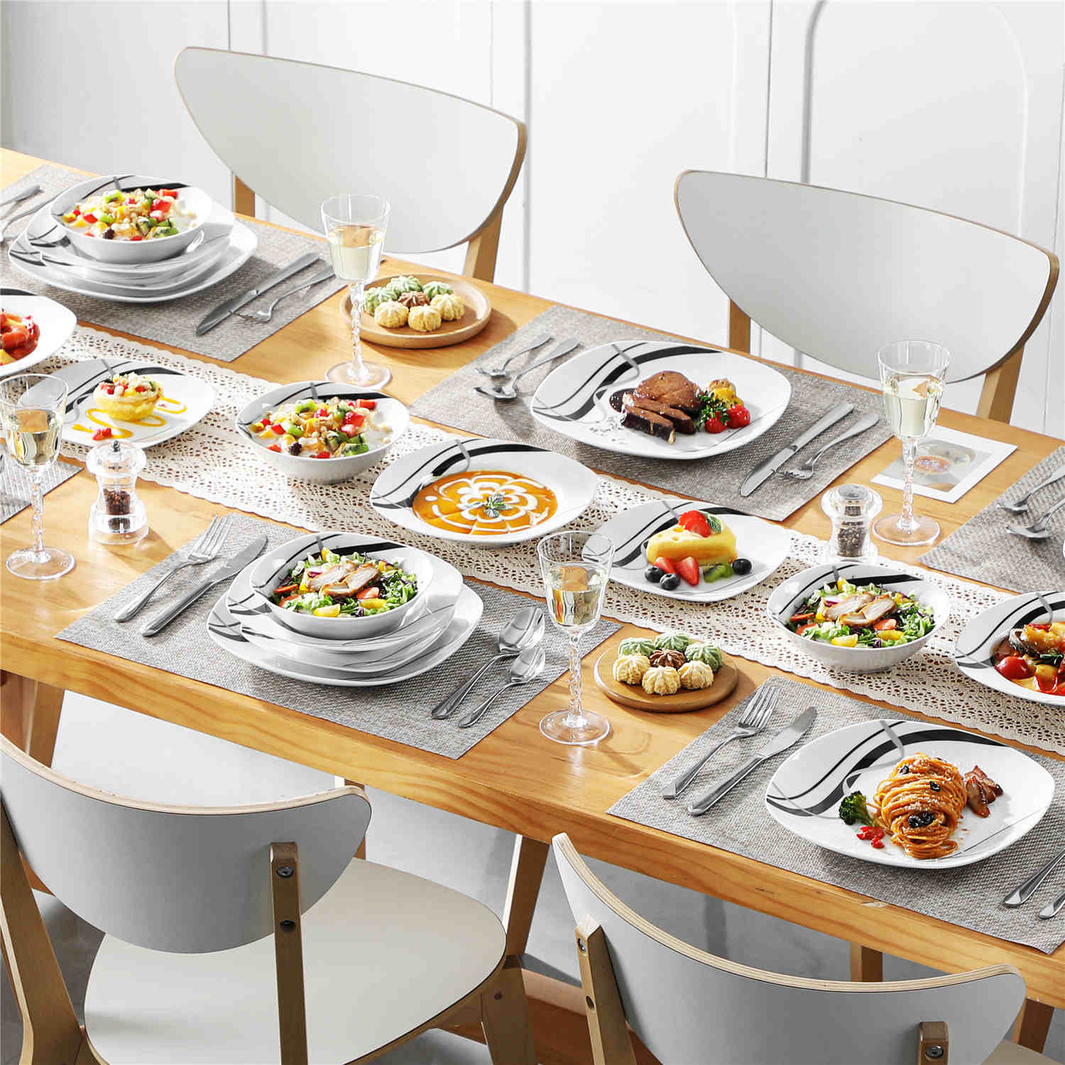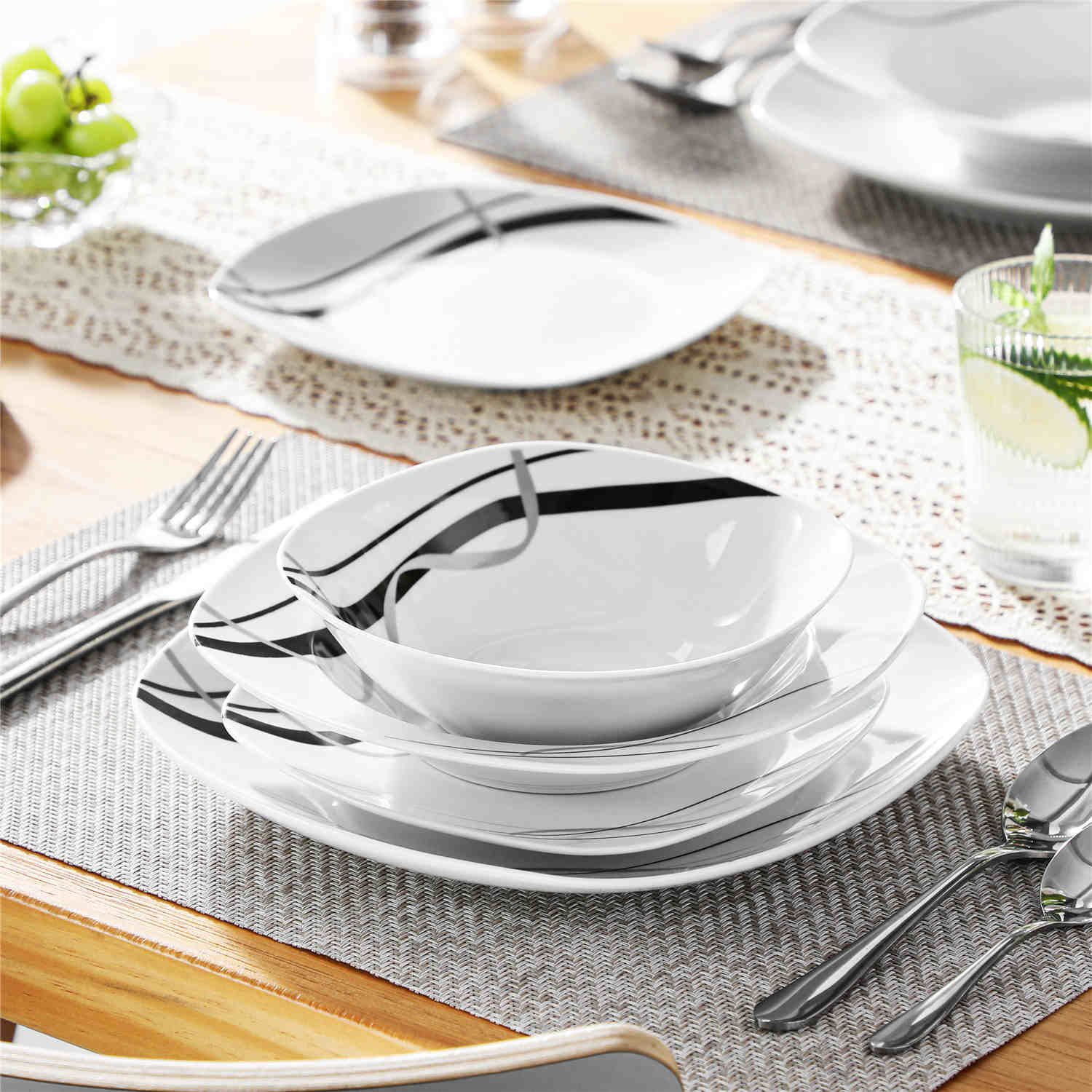 • Fine porcelain square dinnerware set, service for 6, black and gray stripes