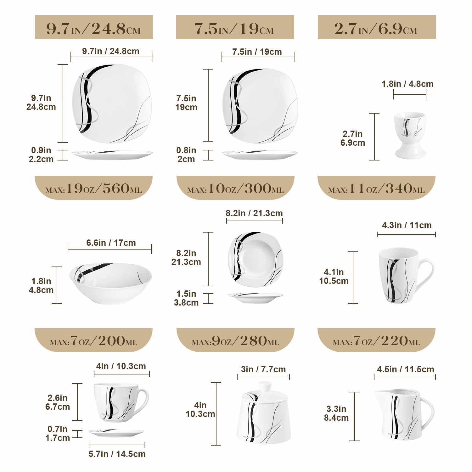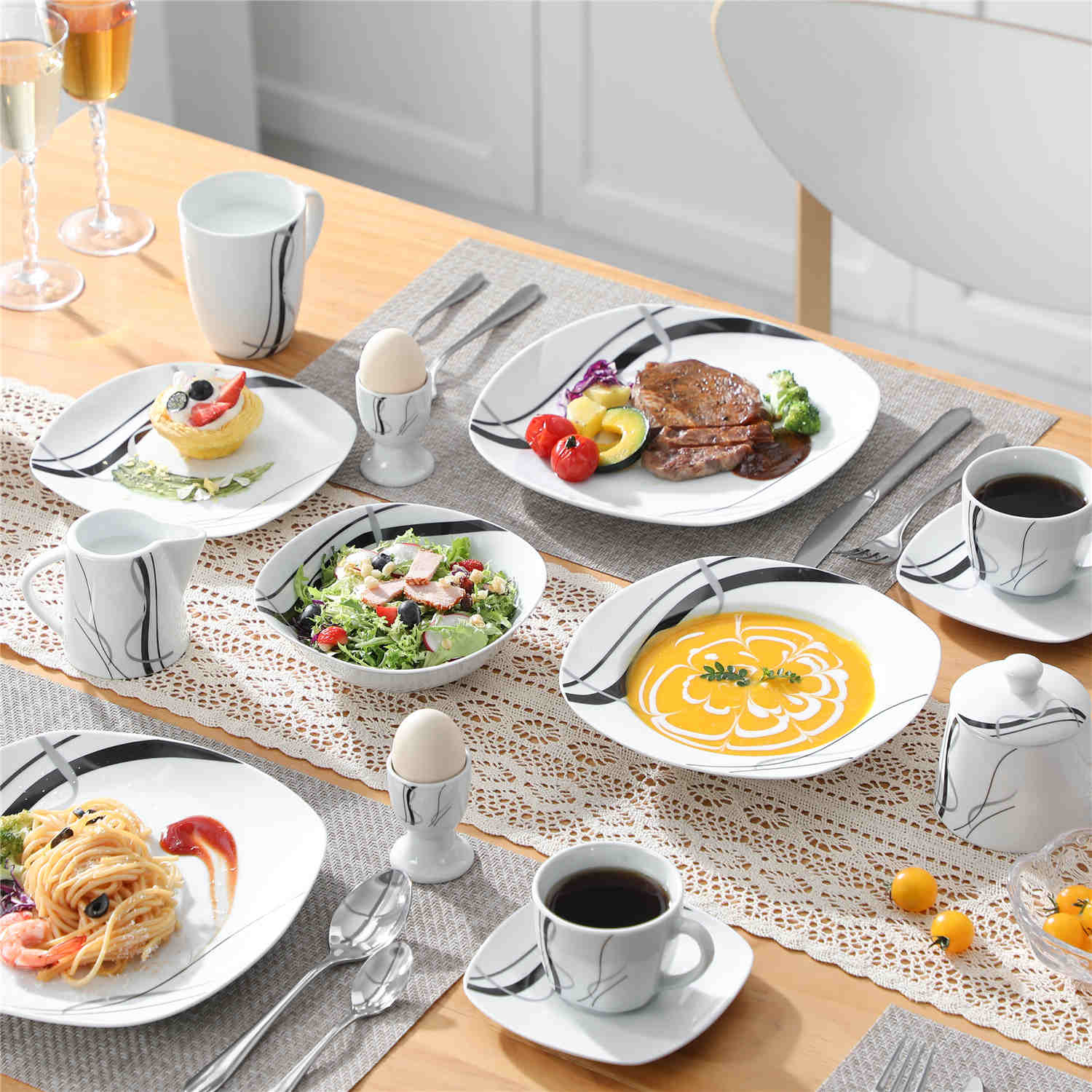 • Fine porcelain square dinnerware set, service for 6, black and gray stripes