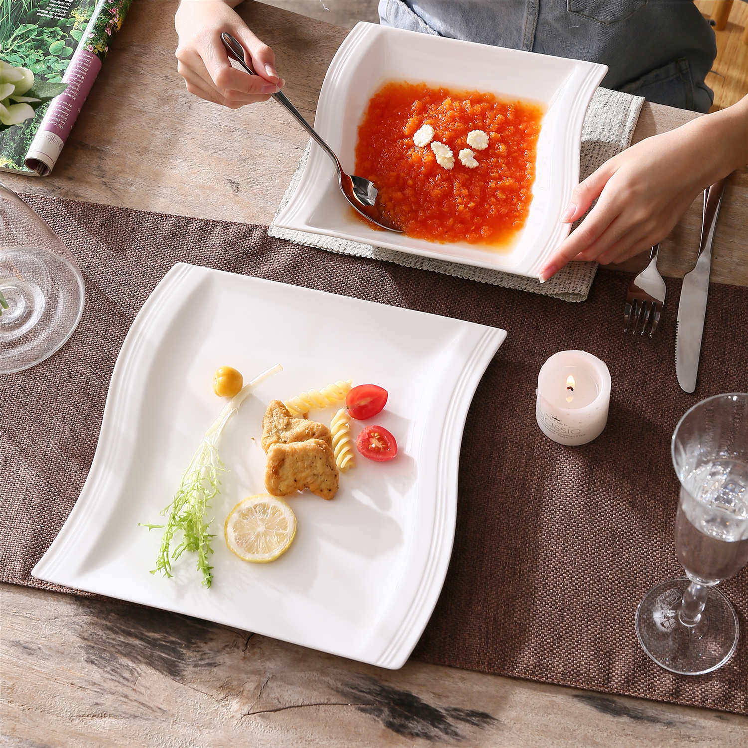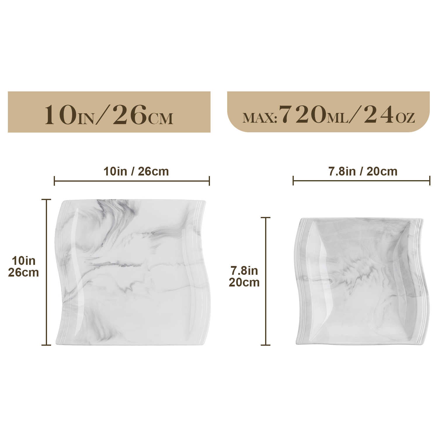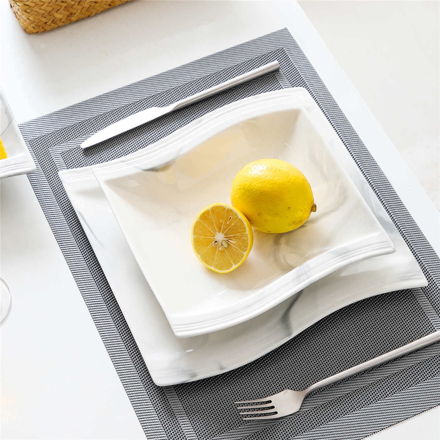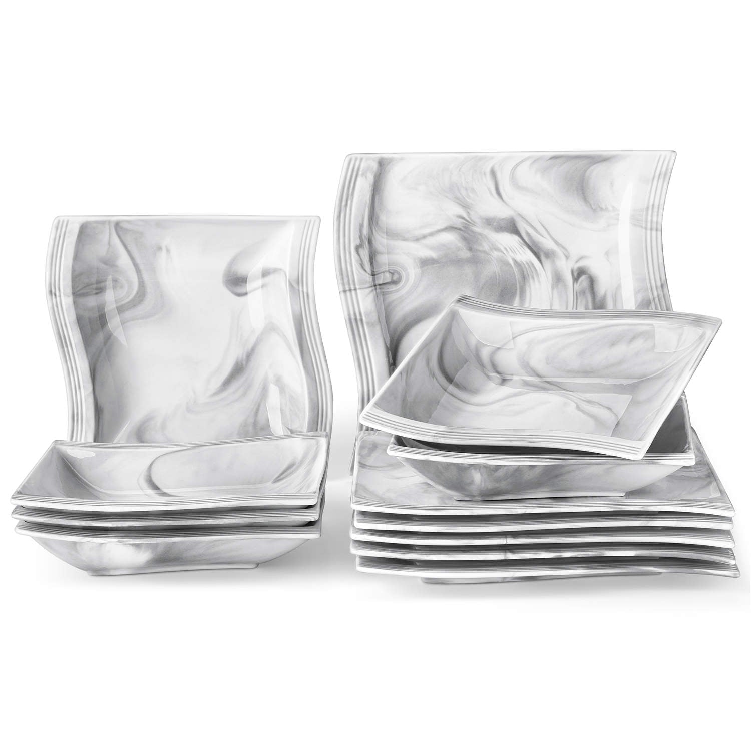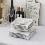 This 12-piece set is ideal for everyday dining or small gatherings, featuring 6 dinner plates and 6 soup plates with elegant wave-edge detailing and geometric accents. Available in ivory white or marble grey, it brings a modern flair to any table. Crafted from durable porcelain, it’s microwave and dishwasher safe, offering both style and convenience for any meal.