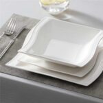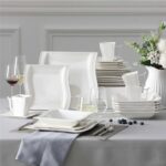 The Flora 30-Piece Dinnerware Set blends modern design with practical versatility, showcasing a wave-edge silhouette and sleek geometric patterns. Crafted from durable porcelain, it serves six with dinner plates, salad plates, soup plates, cups, and saucers. Available in ivory white or marble-inspired grey, blue, and pink, it brings understated elegance to everyday meals and special occasions. Microwave, oven, and dishwasher safe, this set ensures both convenience and long-lasting style.