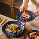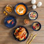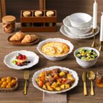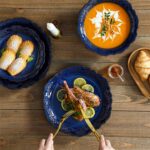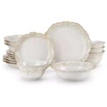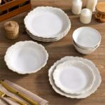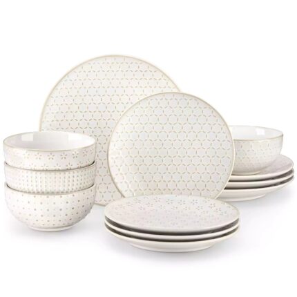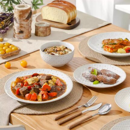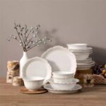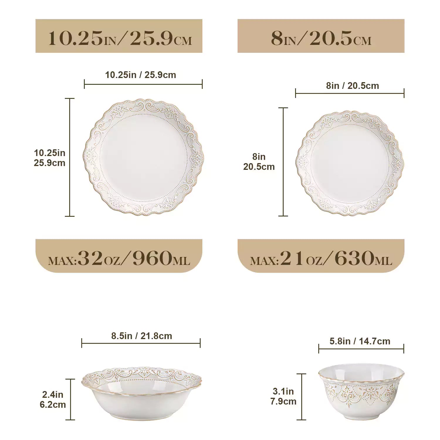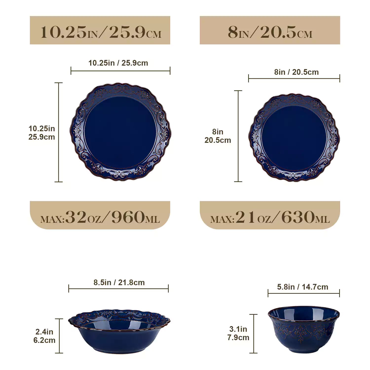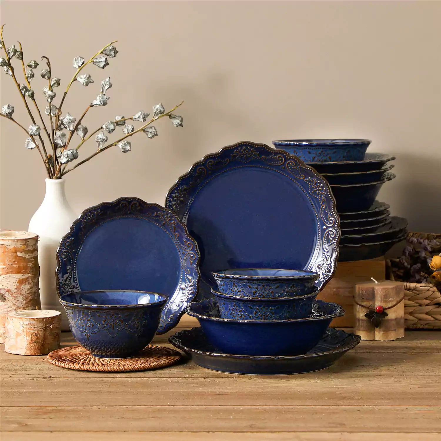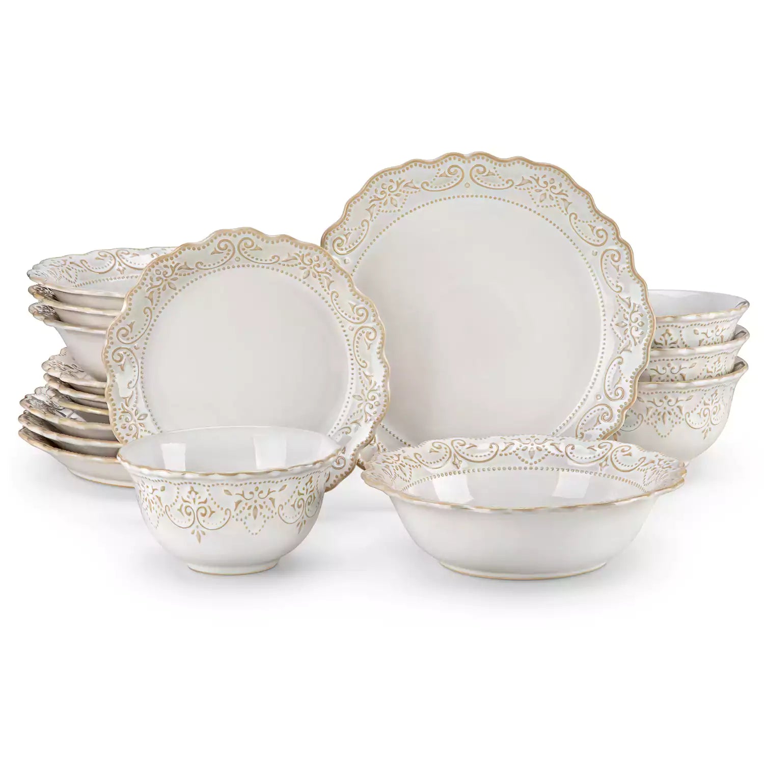 The Giselle 16-Piece Dinnerware Set features a delicate lace-embossed rim in warm brown and beige, accented by a hand-applied reactive glaze in vintage white and starry blue—bringing a touch of vintage French charm to every meal. Made from durable, scratch-resistant stoneware, each piece blends refined character with everyday functionality. The set includes 4 dinner plates, 4 salad plates, 4 soup plates, and 4 cereal bowls—microwave, oven, and dishwasher safe for easy, stylish dining.
