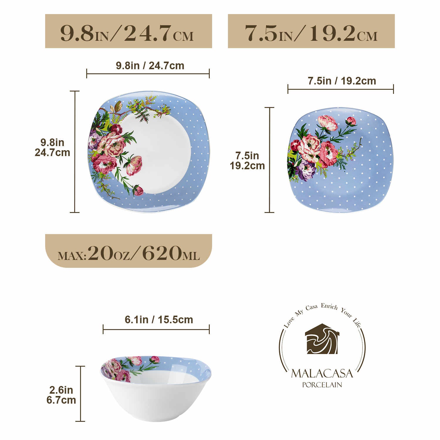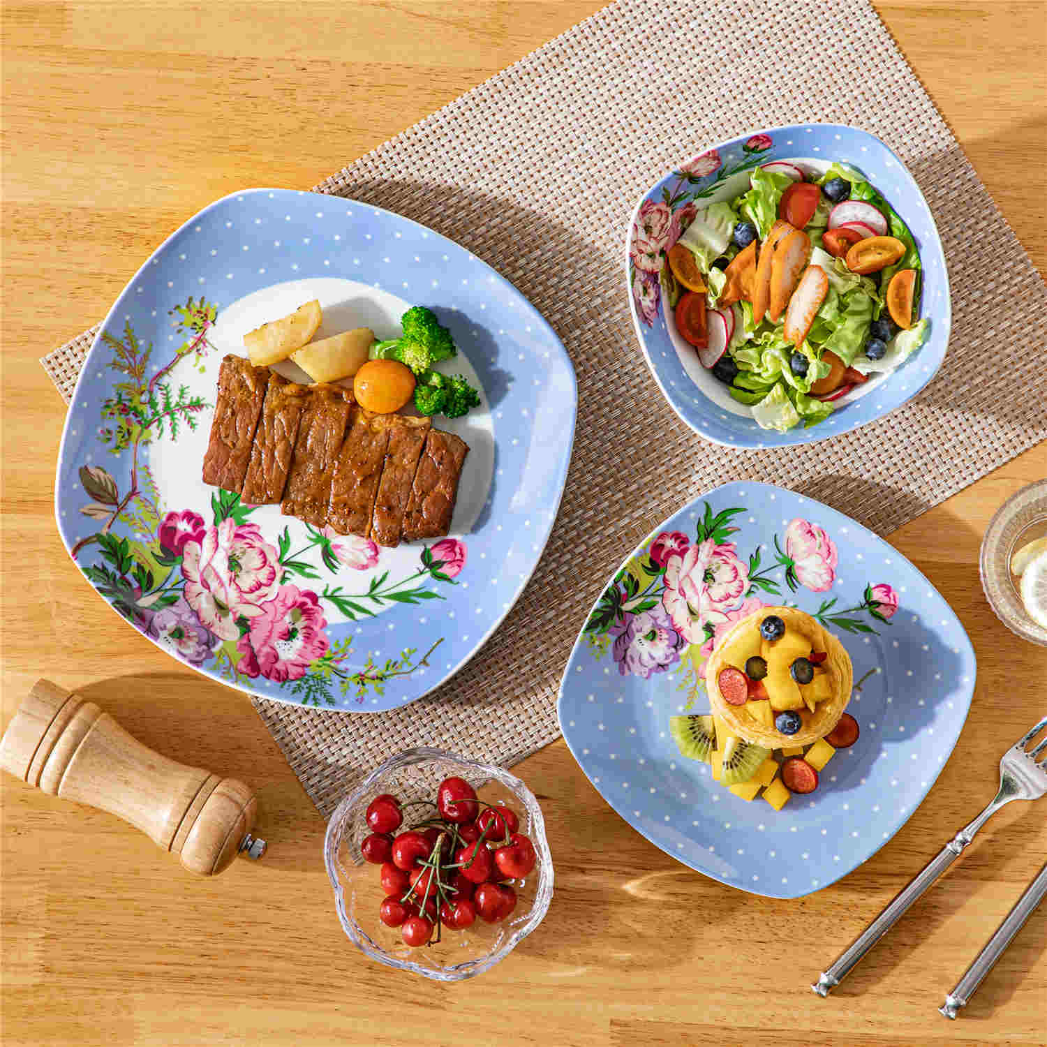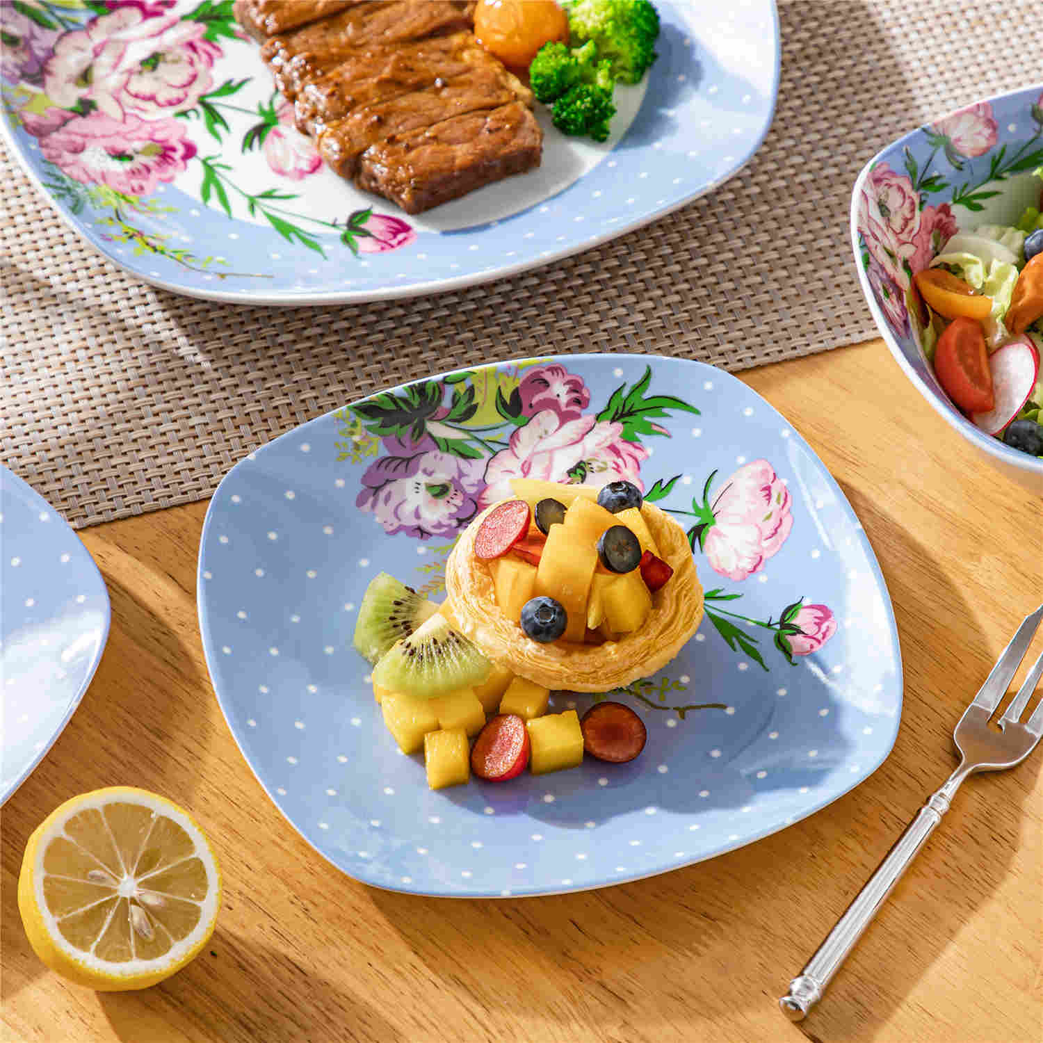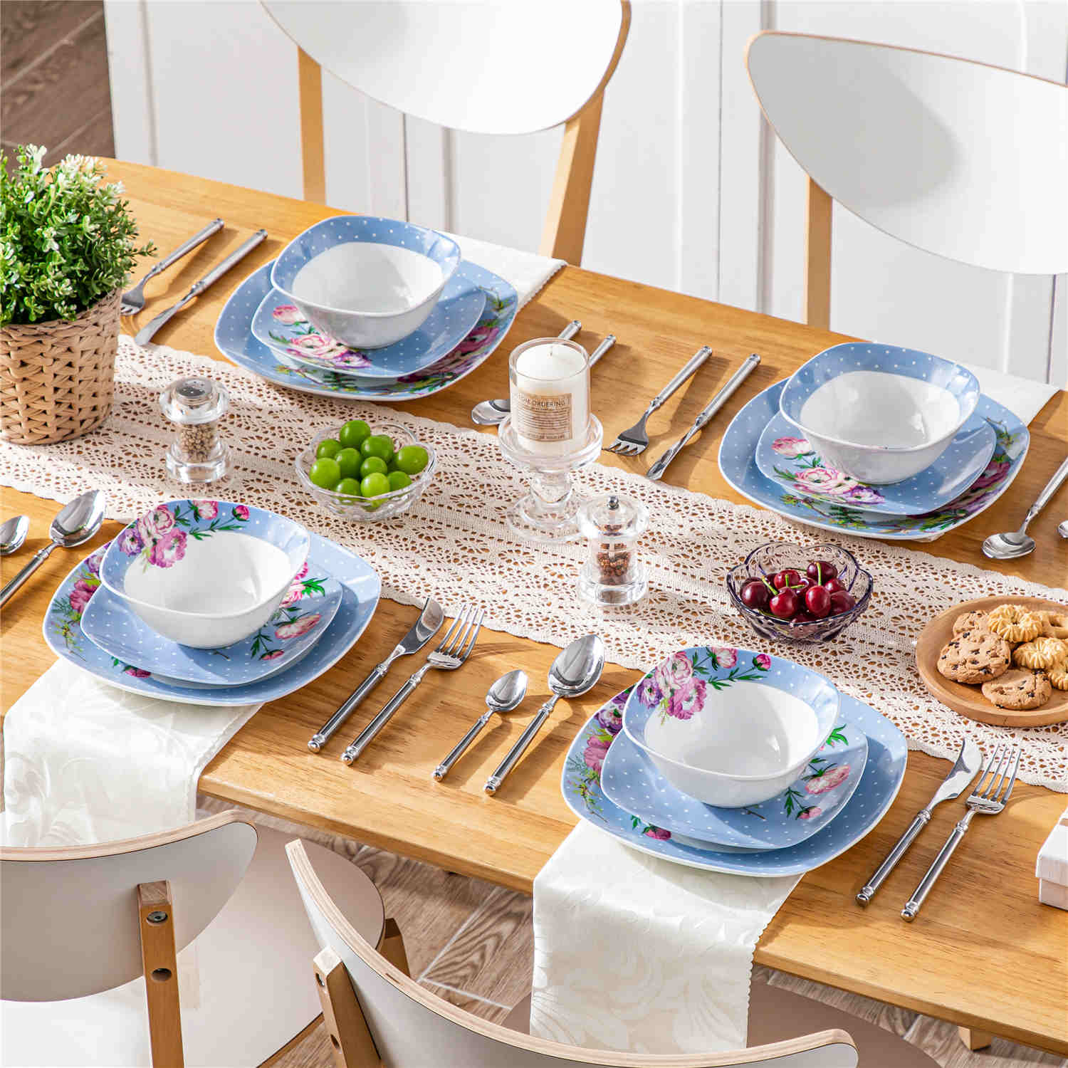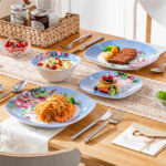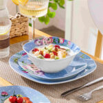The Hannah collection blends classic sophistication with modern design in premium porcelain. Featuring a distinctive rounded square shape, this set showcases blue plates with white polka dots and red rhododendron floral prints, reflecting French Country elegance. It includes 4 dinner plates, 4 salad plates, and 4 cereal bowls, all stackable for easy storage. With a non-porous, stain-resistant finish, it ensures effortless cleaning and is microwave, dishwasher, and oven safe. The Hannah set combines rustic charm with exceptional practicality. (Not available in the US market)