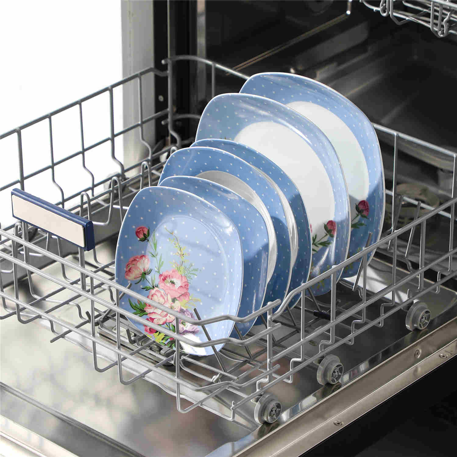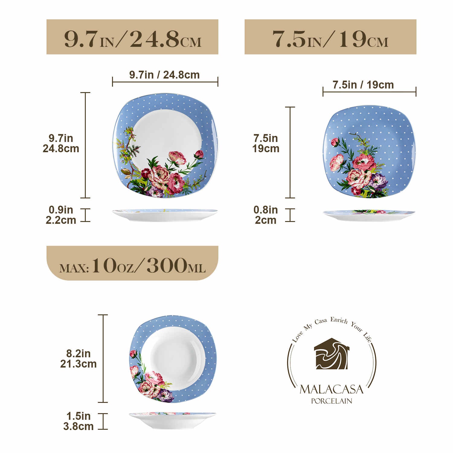 • Fine porcelain square dinnerware set, service for 6, blue with white dots and floral pattern