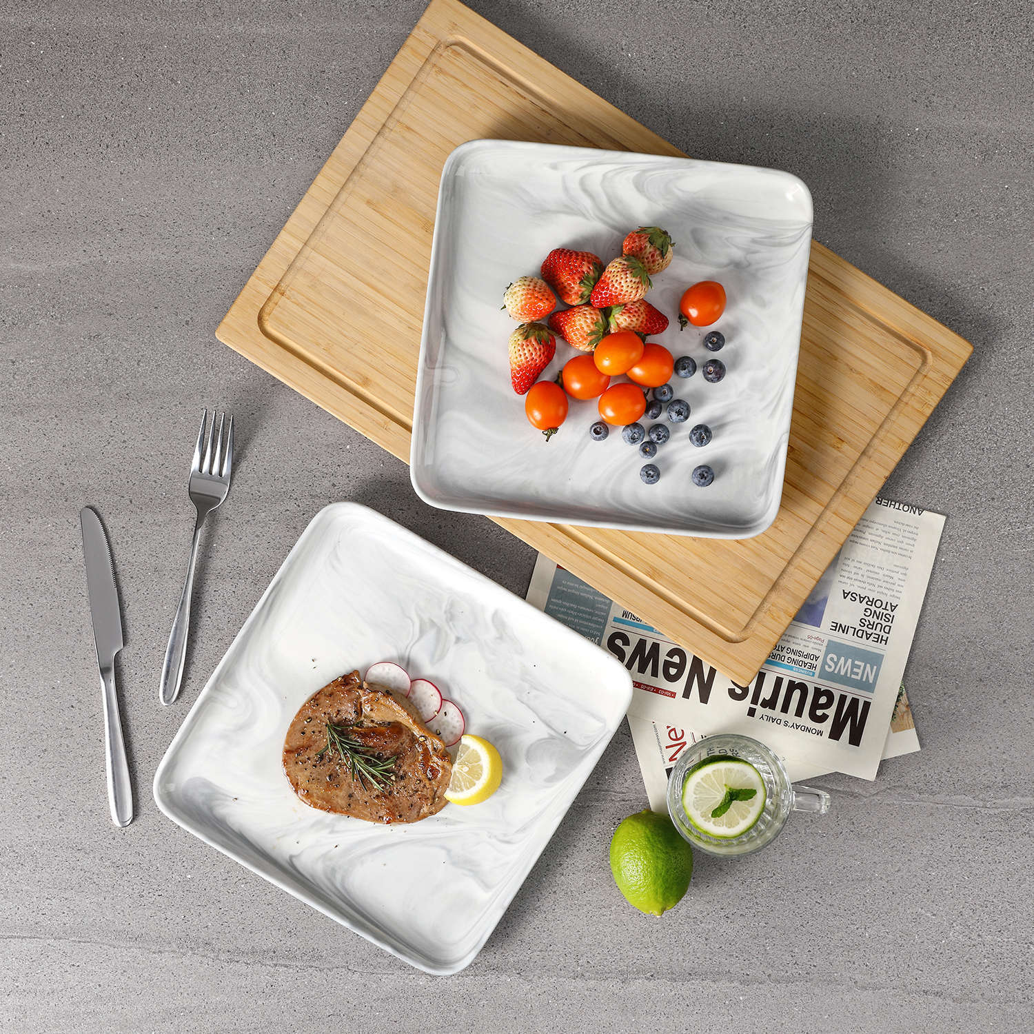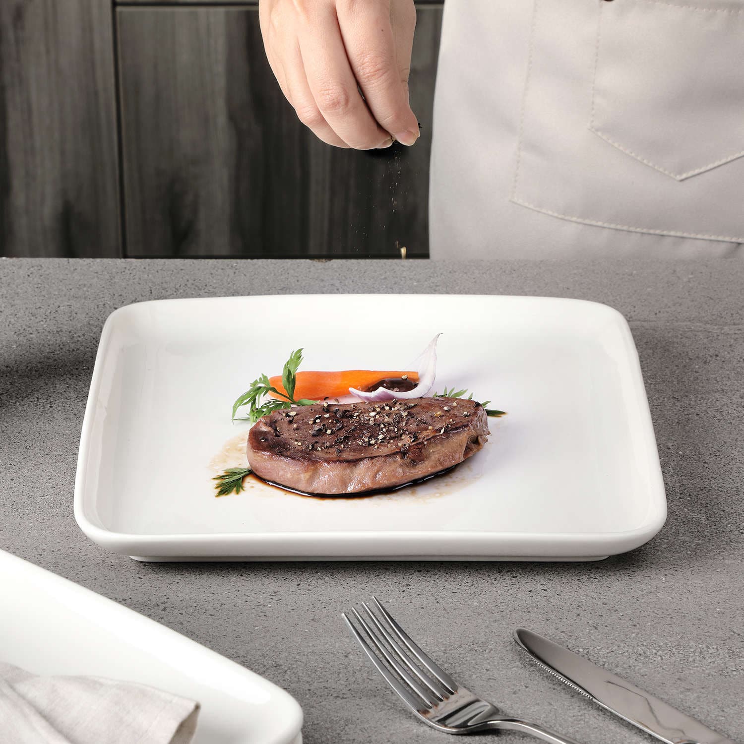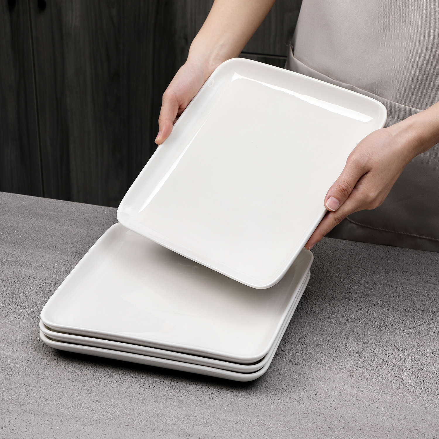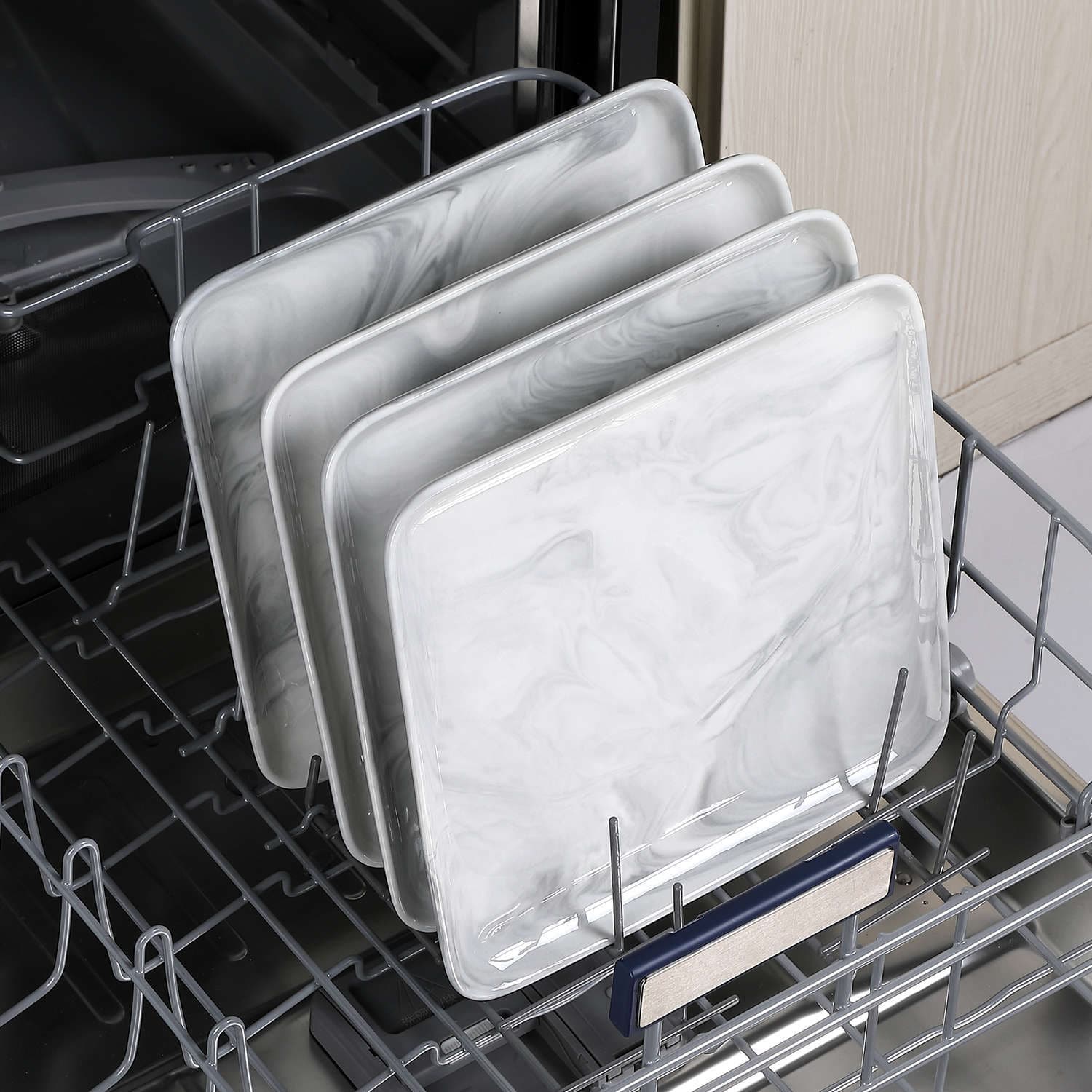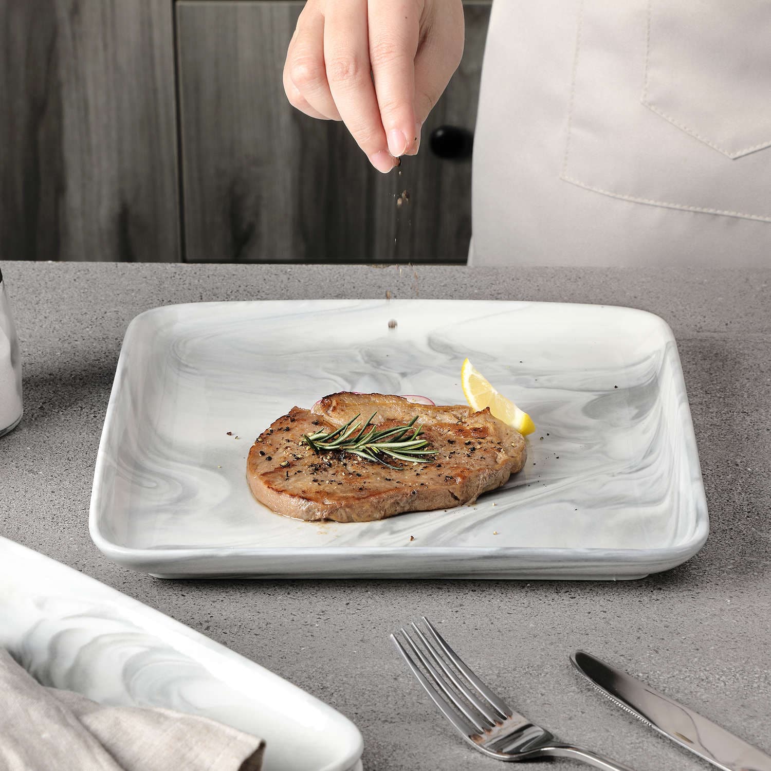 - Fine porcelain square dinner plates, set of 4, ivory white/marble grey