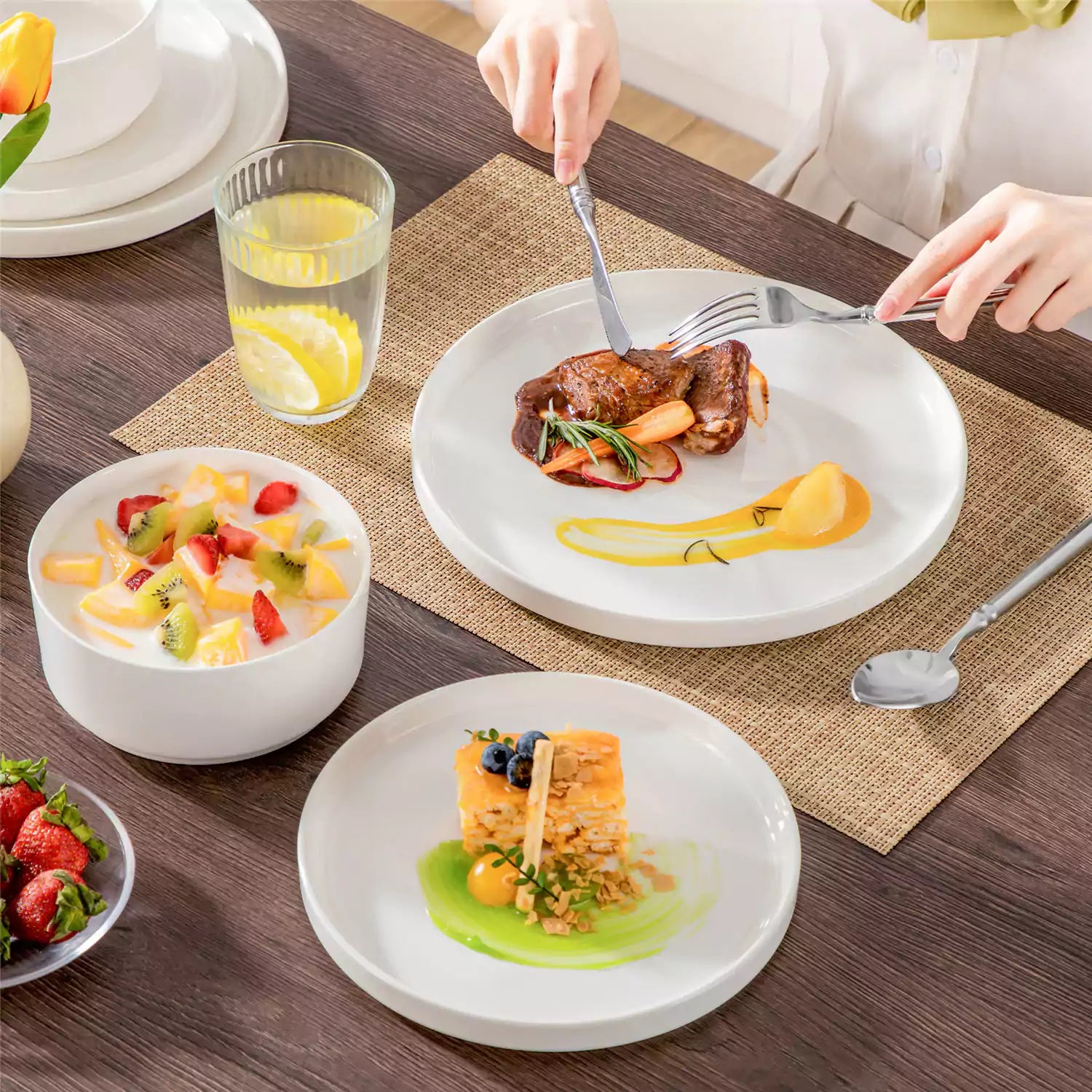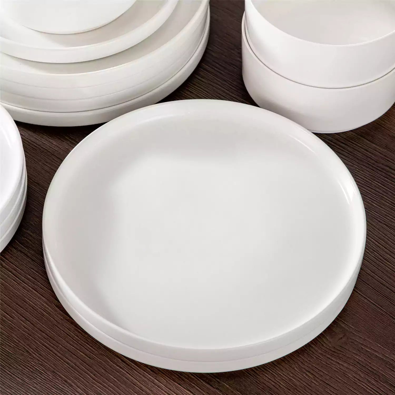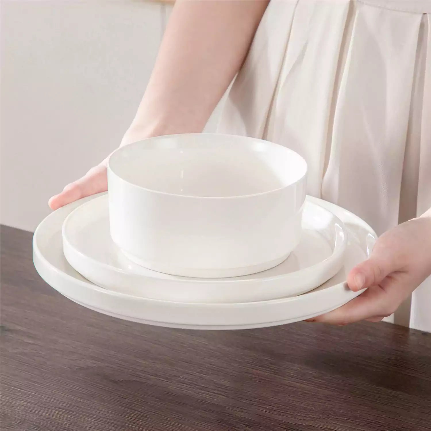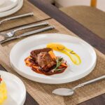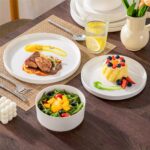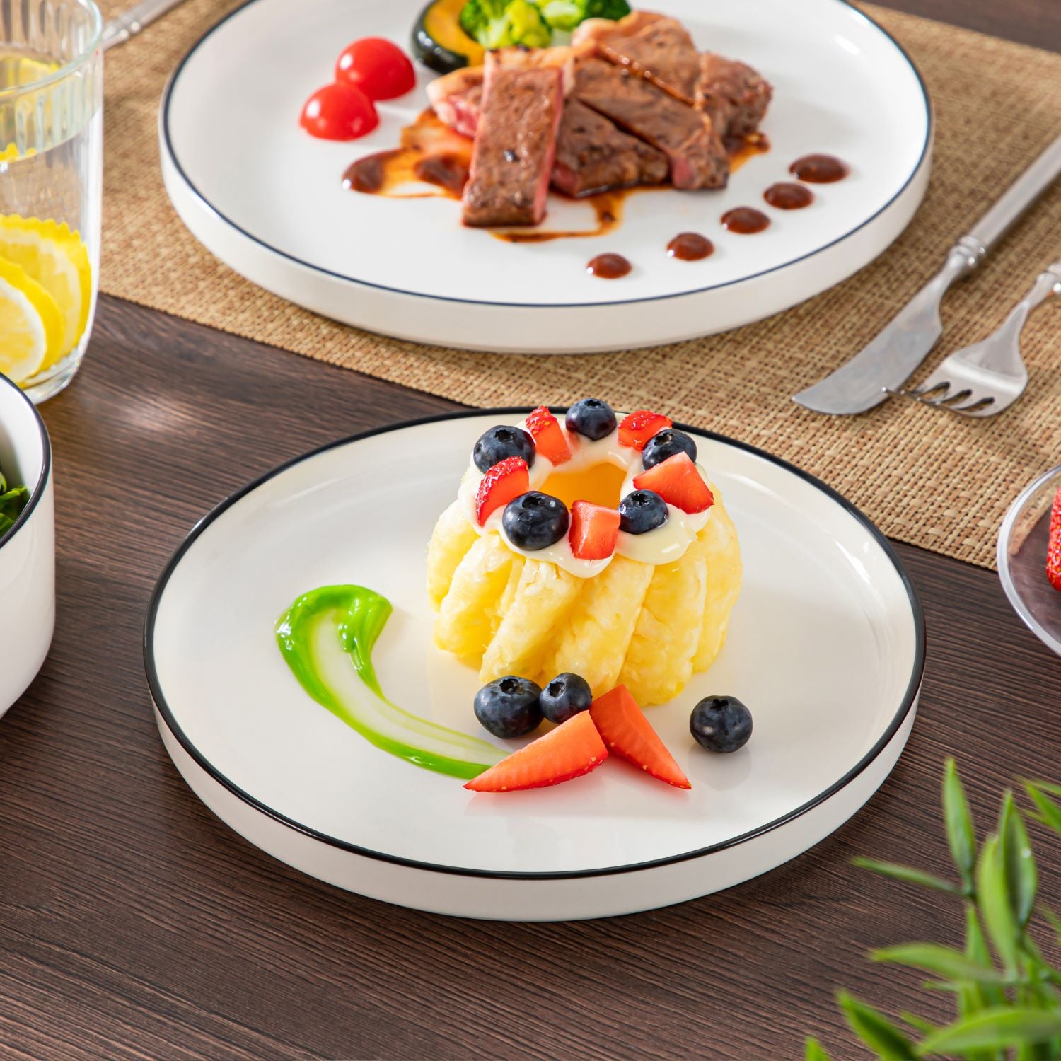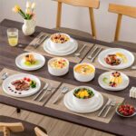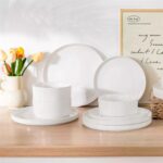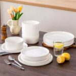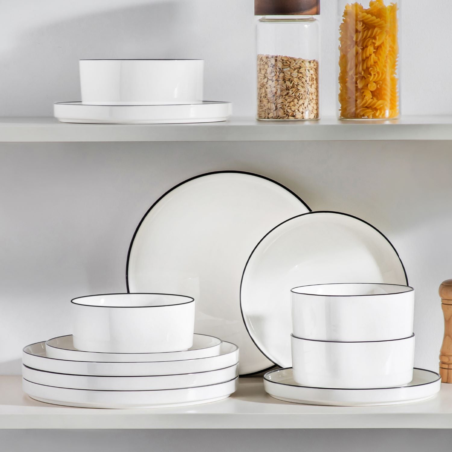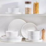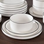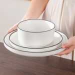 Available in pristine ivory white or with striking black trim, this set serves four and includes round dinner plates, salad plates, and cereal bowls. Each piece features sleek lines and a distinctive straight edge, offering a modern twist on the classic round design. Elevated, non-slip bases ensure a secure grip, making this set versatile for both indoor and outdoor dining. Crafted from durable porcelain, it promises lasting performance with a focus on sustainability. The neutral tones frame your culinary creations beautifully, turning every meal into a visual delight. Microwave, dishwasher, and oven safe, these pieces are designed for easy stacking and storage.