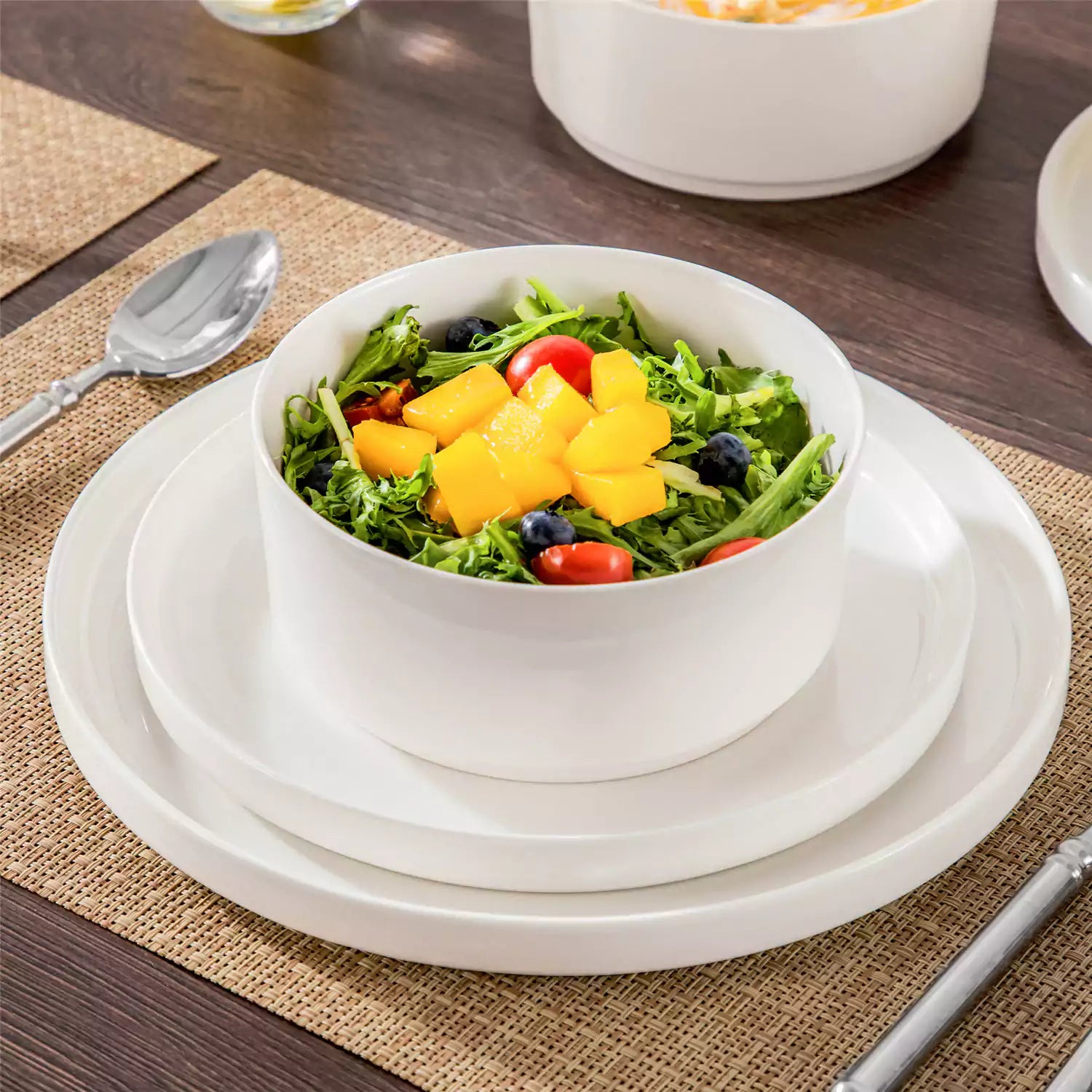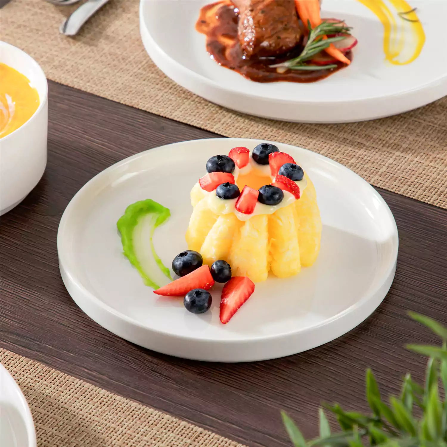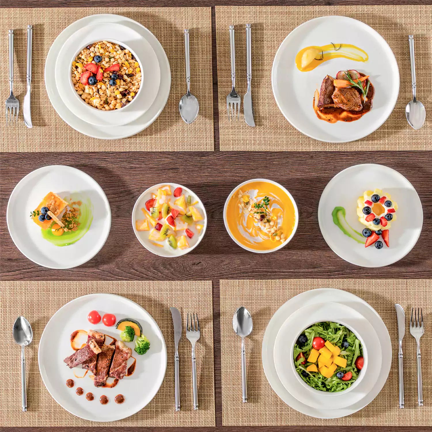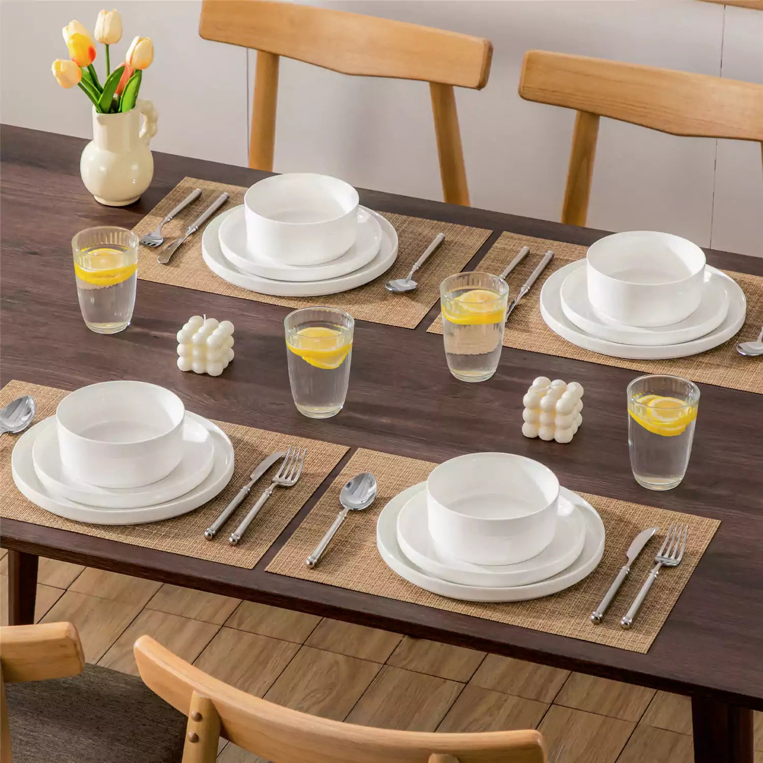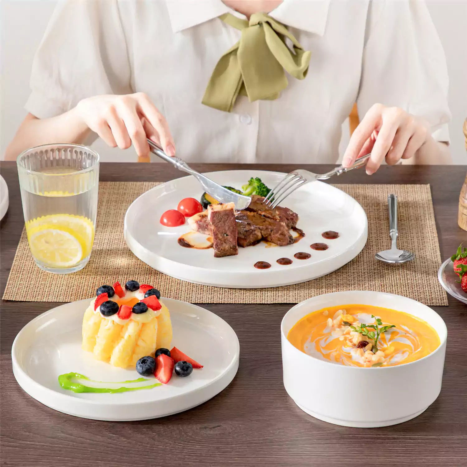Available in pristine ivory white or with striking black trim, this set serves four and includes round dinner plates, salad plates, and cereal bowls. Each piece features sleek lines and a distinctive straight edge, offering a modern twist on the classic round design. Elevated, non-slip bases ensure a secure grip, making this set versatile for both indoor and outdoor dining. Crafted from durable porcelain, it promises lasting performance with a focus on sustainability. The neutral tones frame your culinary creations beautifully, turning every meal into a visual delight. Microwave, dishwasher, and oven safe, these pieces are designed for easy stacking and storage.