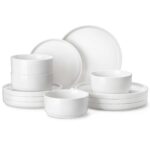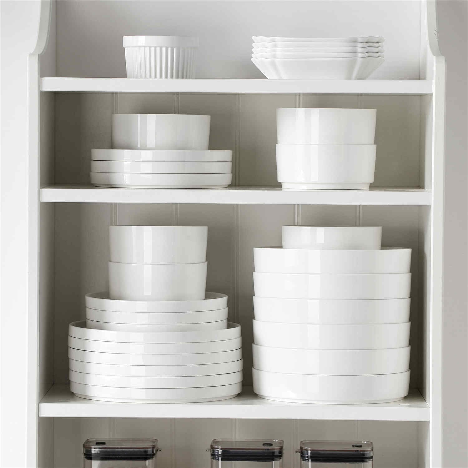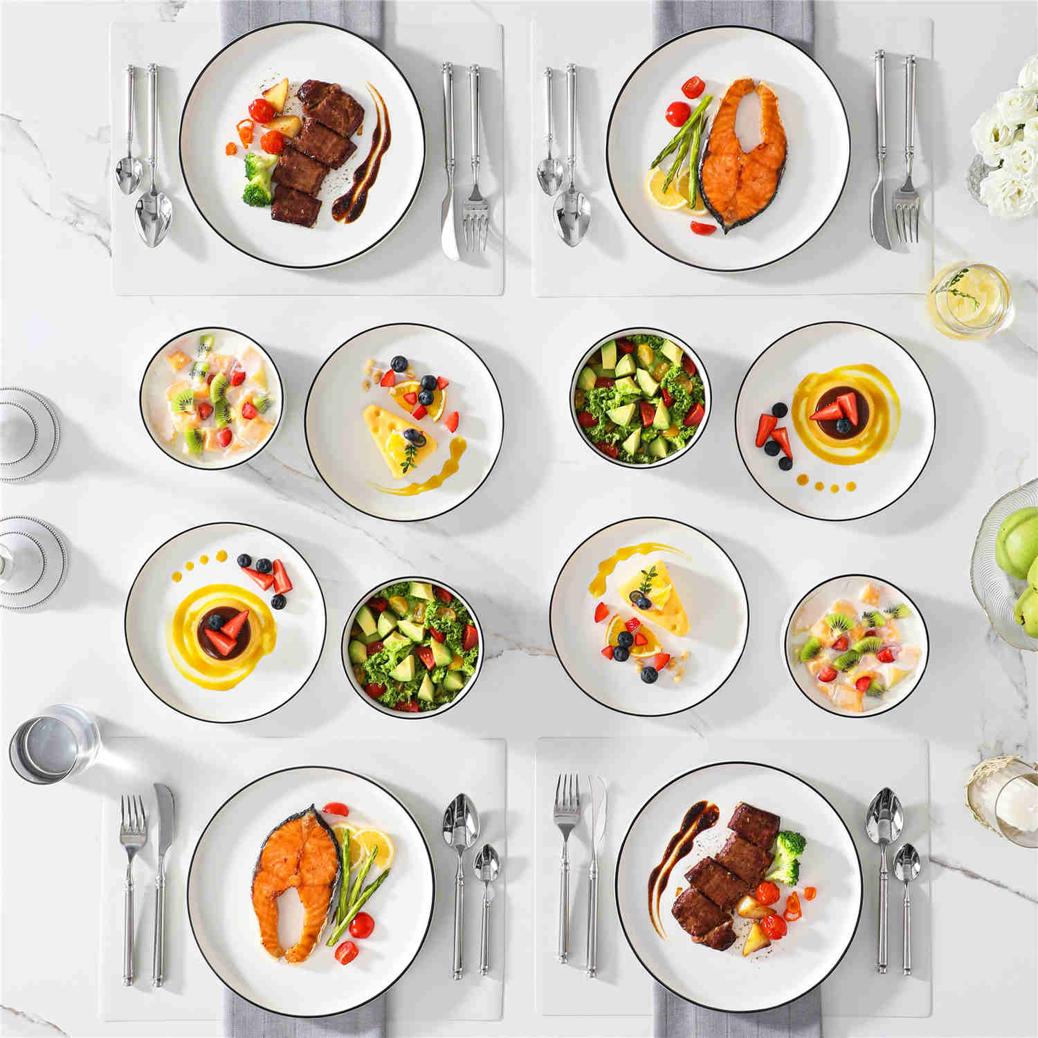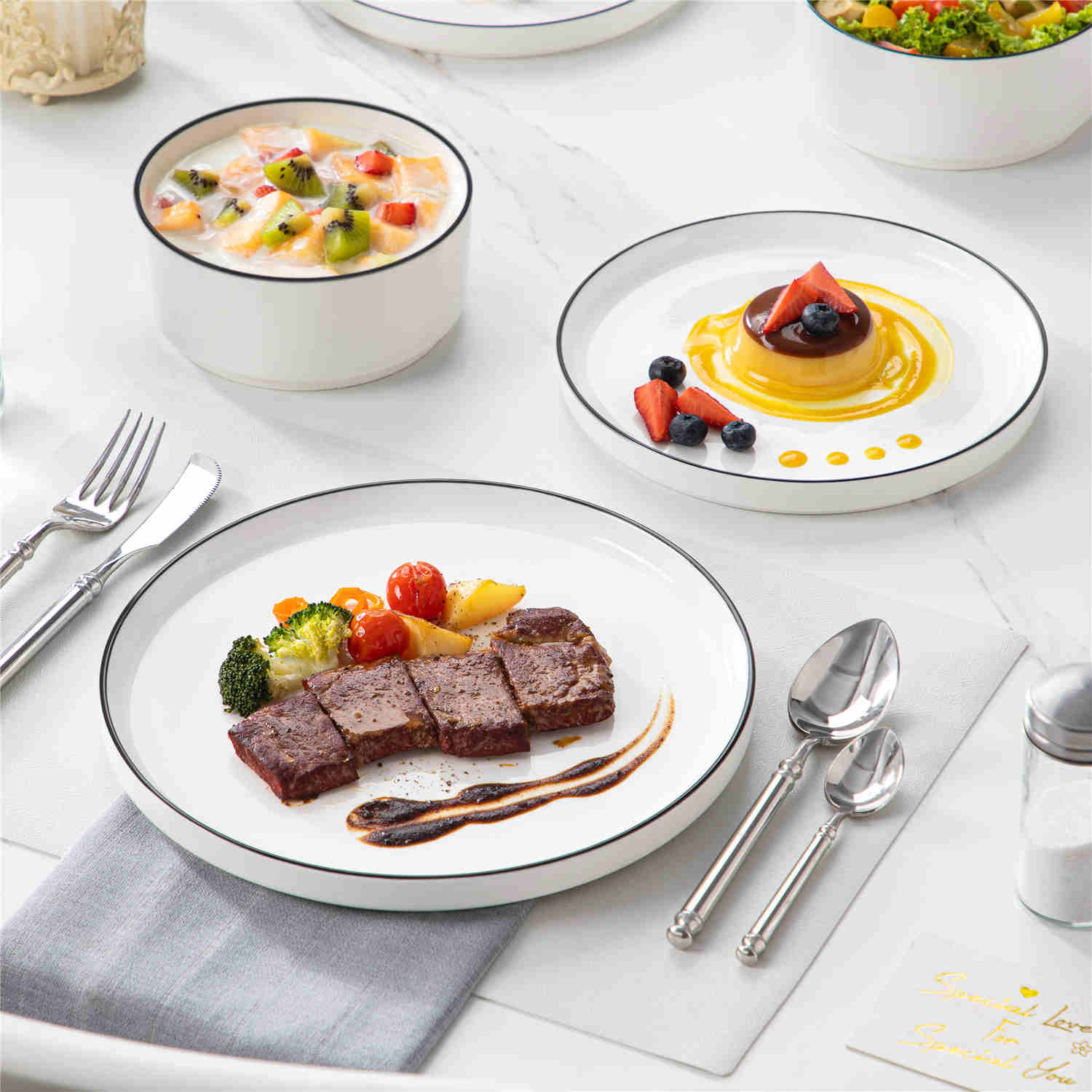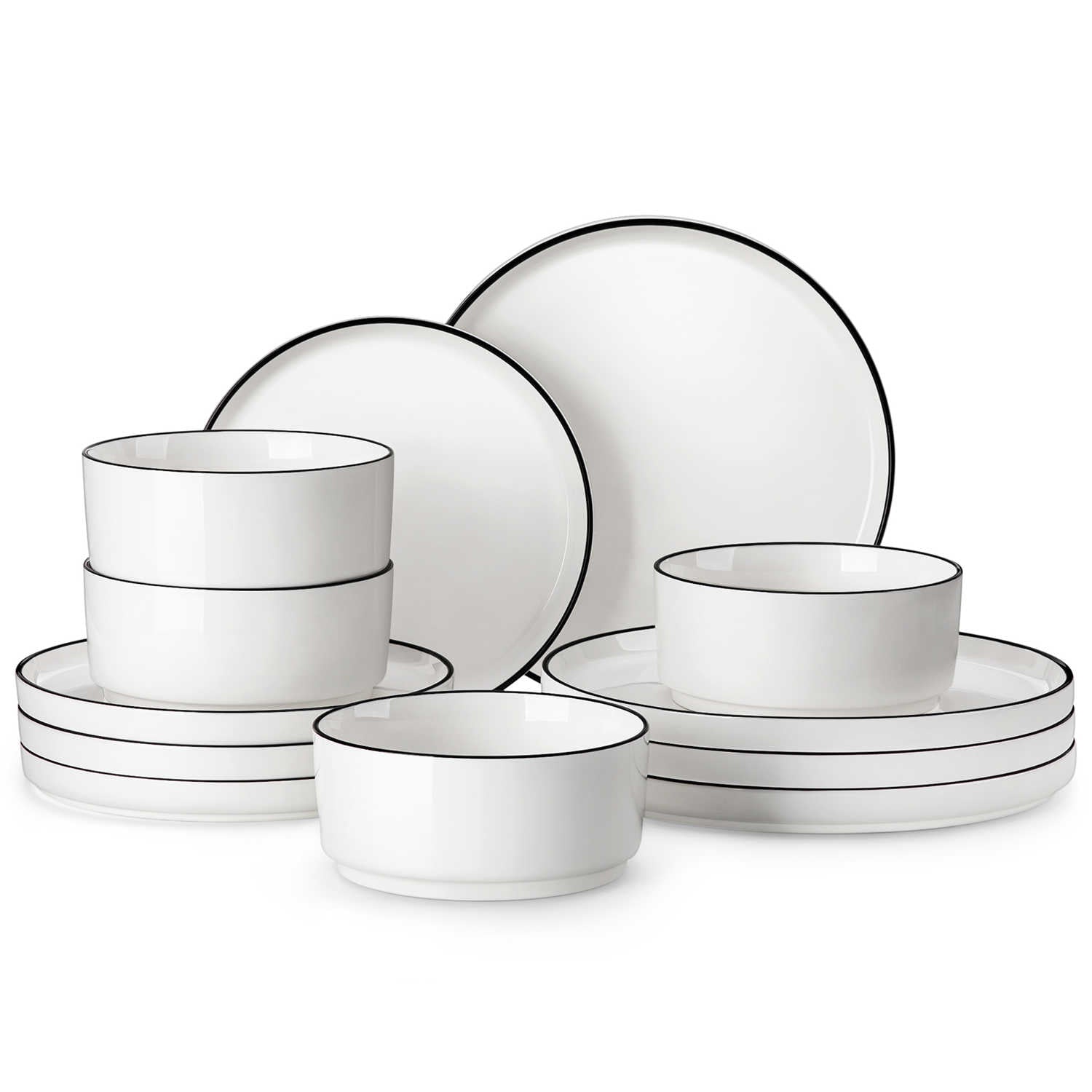 Available in pristine ivory white or with striking black trim, this set serves four and includes round dinner plates, salad plates, and cereal bowls. Each piece features sleek lines and a distinctive straight edge, offering a modern twist on the classic round design. Elevated, non-slip bases ensure a secure grip, making this set versatile for both indoor and outdoor dining. Crafted from durable porcelain, it promises lasting performance with a focus on sustainability. The neutral tones frame your culinary creations beautifully, turning every meal into a visual delight. Microwave, dishwasher, and oven safe, these pieces are designed for easy stacking and storage.