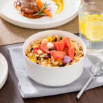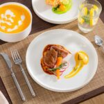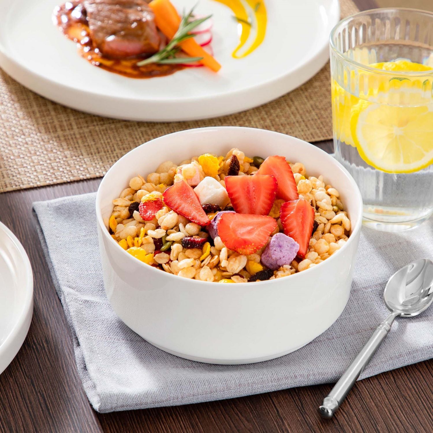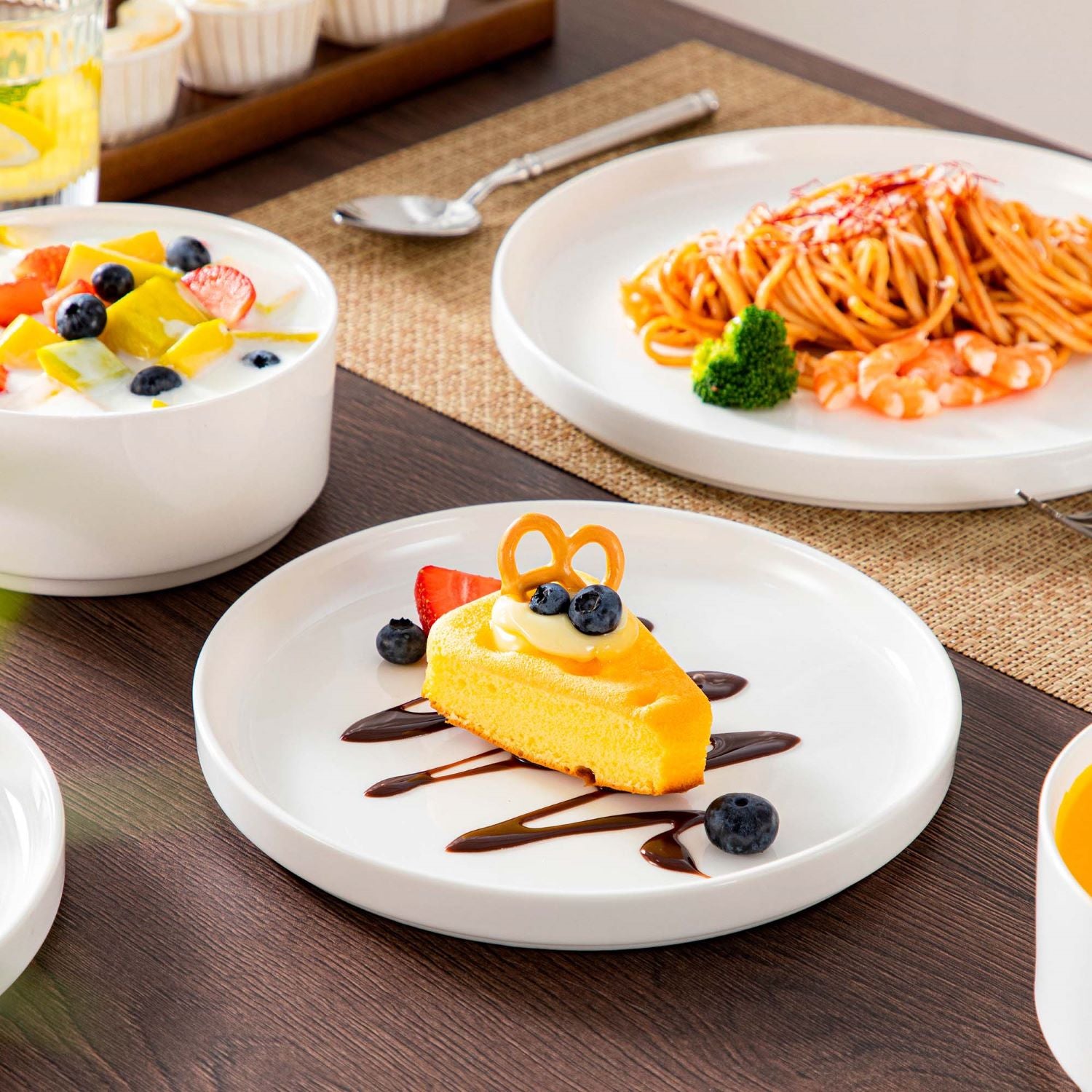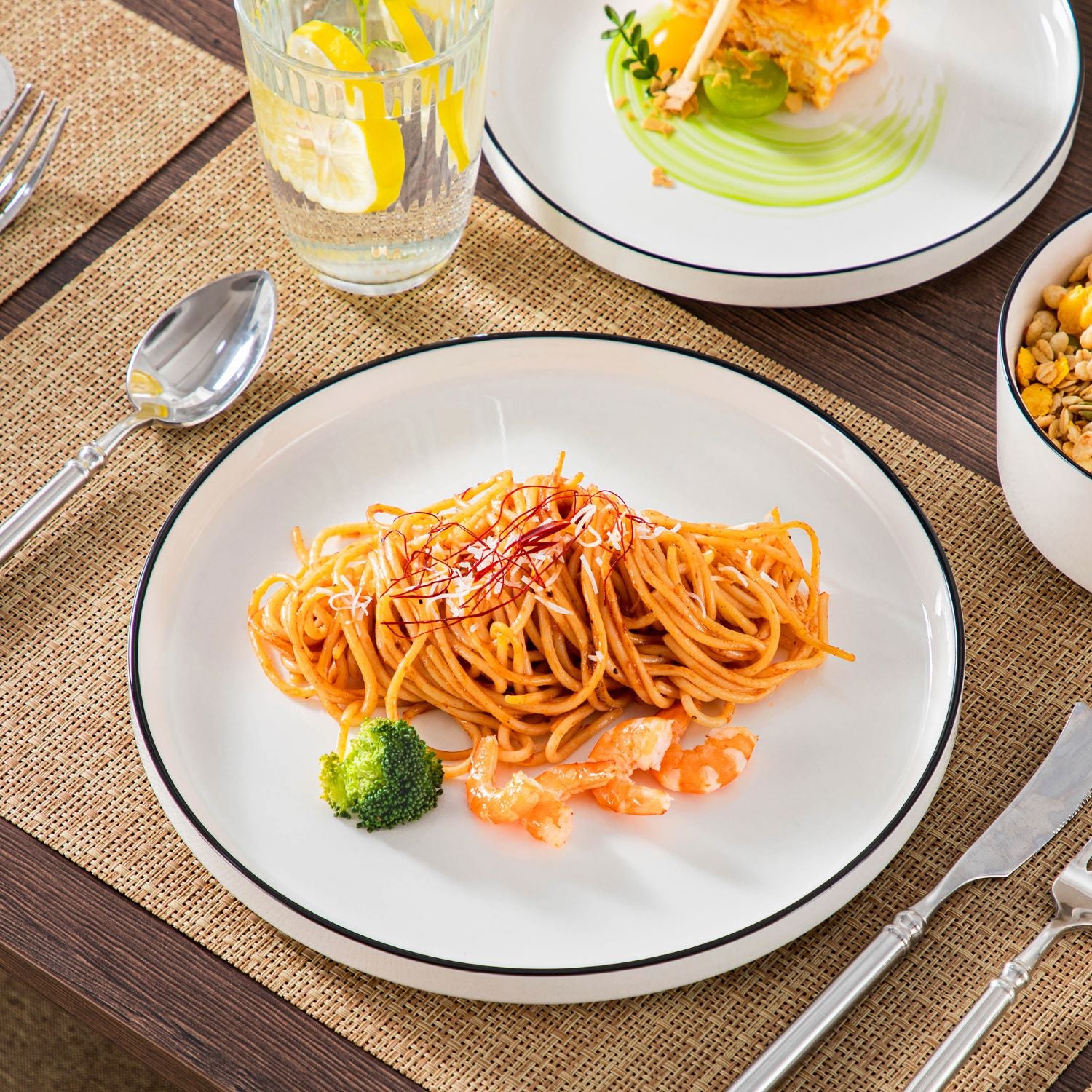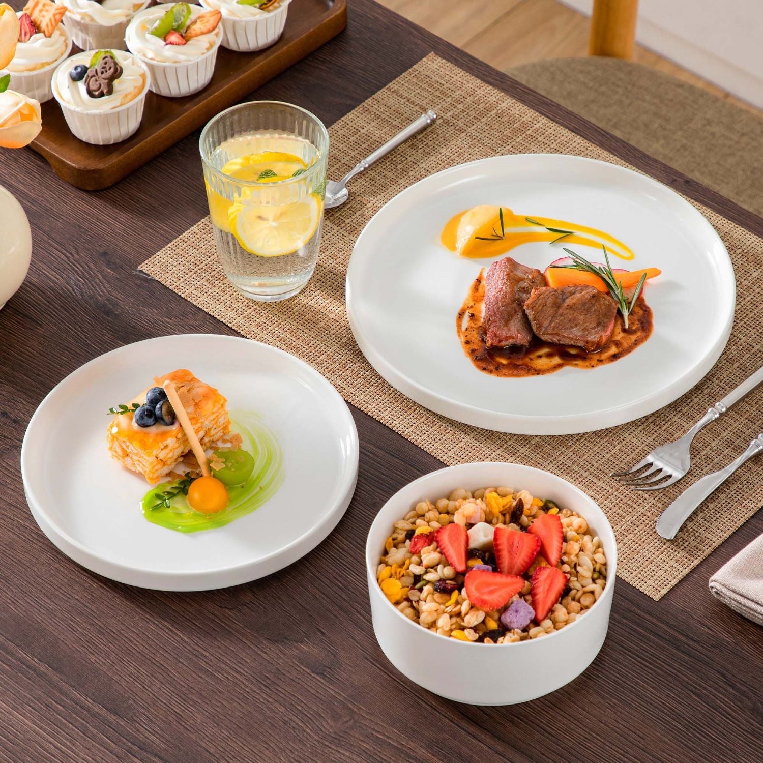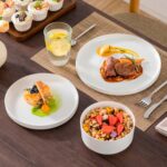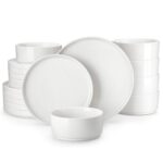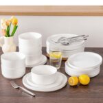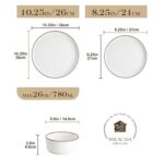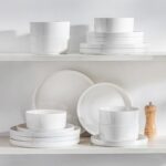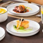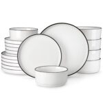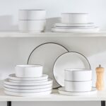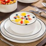 Available in pristine ivory white or with striking black trim, this set serves six and includes round dinner plates, salad plates, and cereal bowls. Each piece features sleek lines and a distinctive straight edge, offering a modern twist on the classic round design. Elevated, non-slip bases ensure a secure grip, making this set versatile for both indoor and outdoor dining. Crafted from durable porcelain, it promises lasting performance with a focus on sustainability. The neutral tones frame your culinary creations beautifully, turning every meal into a visual delight. Microwave, dishwasher, and oven safe, these pieces are designed for easy stacking and storage.