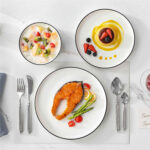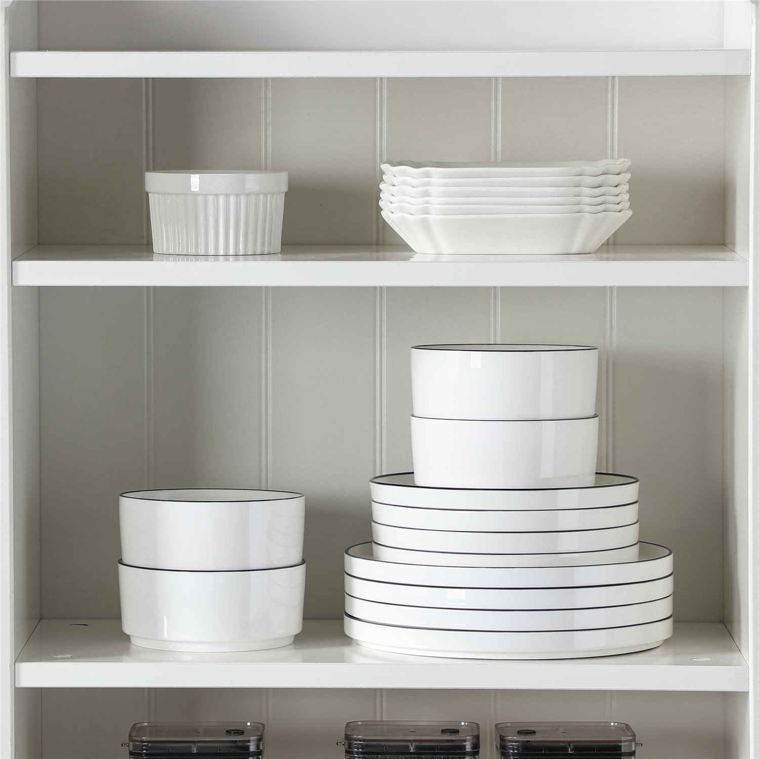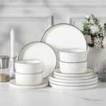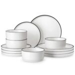 Available in pristine ivory white or with striking black trim, this set serves eight and includes round dinner plates, salad plates, and cereal bowls. Each piece features sleek lines and a distinctive straight edge, offering a modern twist on the classic round design. Elevated, non-slip bases ensure a secure grip, making this set versatile for both indoor and outdoor dining. Crafted from durable porcelain, it promises lasting performance with a focus on sustainability. The neutral tones frame your culinary creations beautifully, turning every meal into a visual delight. Microwave, dishwasher, and oven safe, these pieces are designed for easy stacking and storage.
