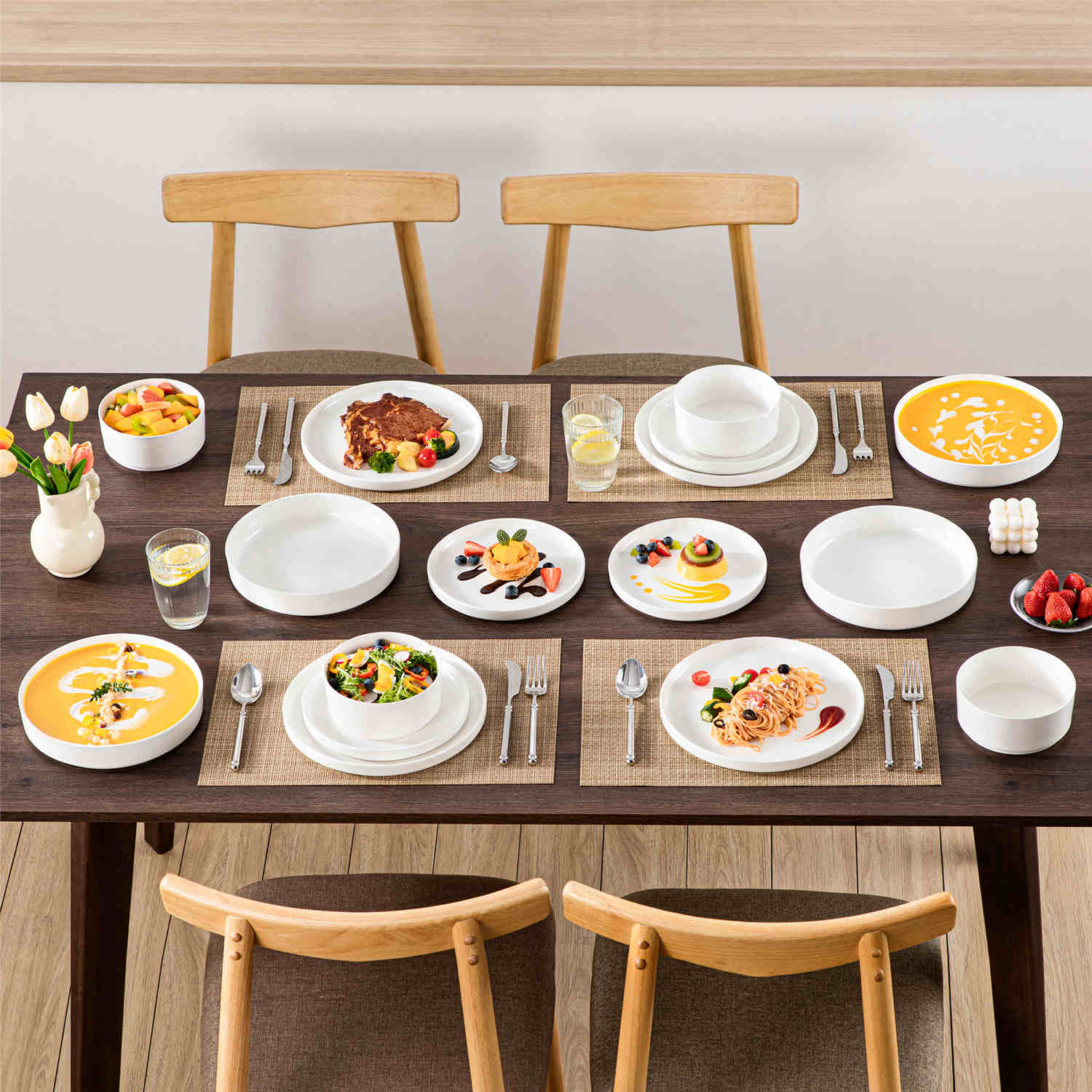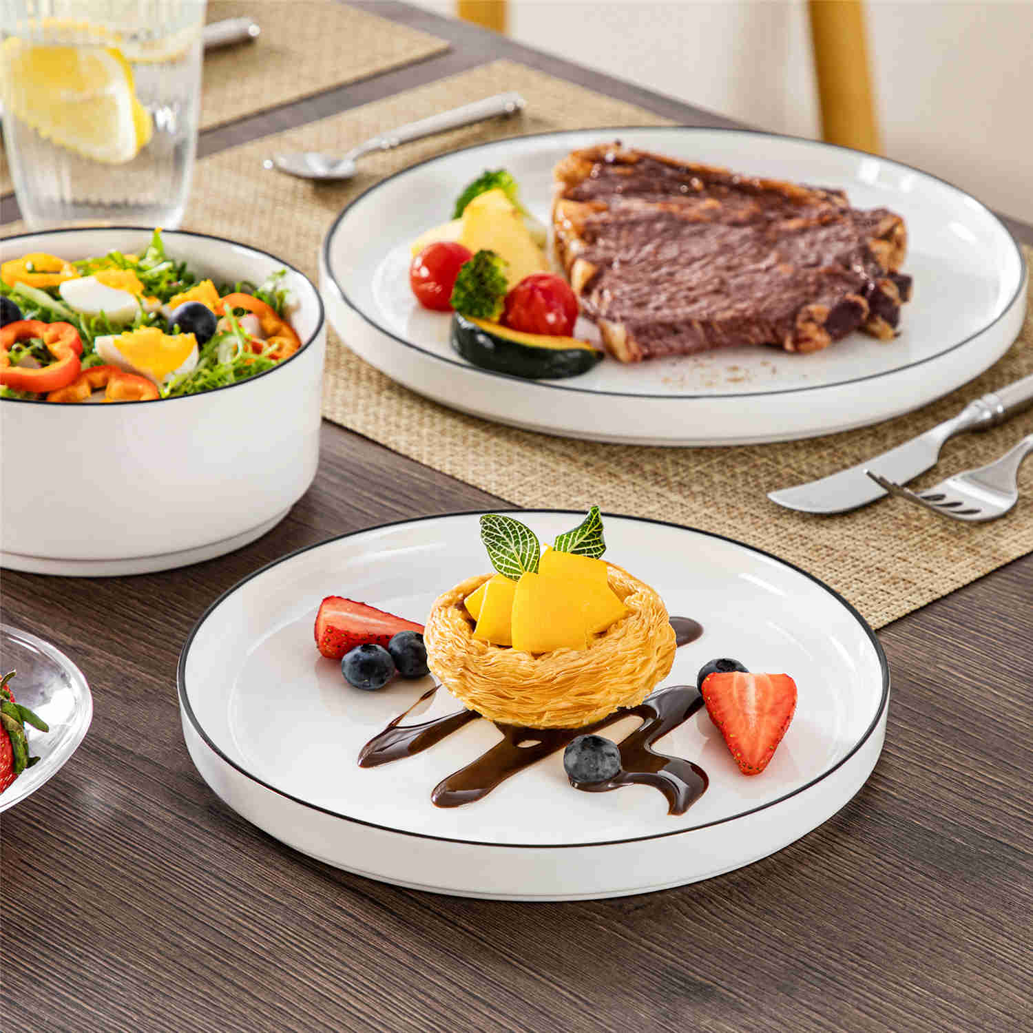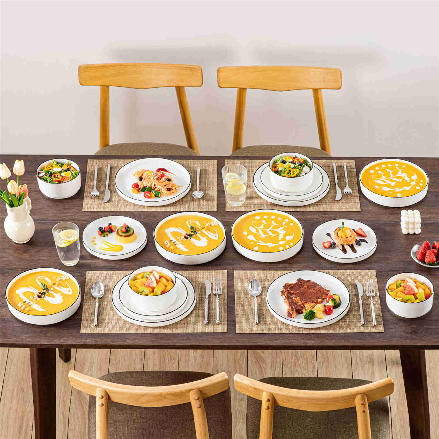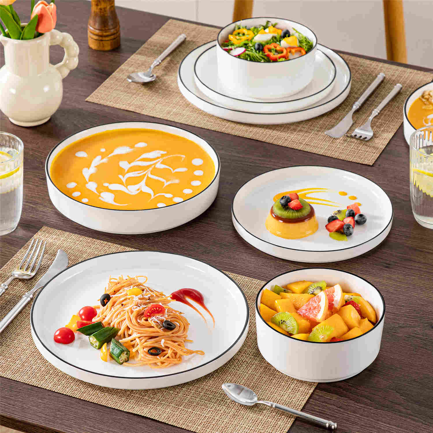 This versatile 8-person dinnerware set, available in ivory white or with a black trim, includes dinner plates, salad plates, pasta bowls, and cereal bowls. With sleek lines and straight edges, each piece offers a modern twist on a classic design. The elevated, non-slip bases ensure a secure grip, making it suitable for both indoor and outdoor use. Made from durable porcelain, this set is microwave, dishwasher, and oven safe, and stacks easily for convenient storage. Its neutral tones complement and enhance the presentation of any dish.