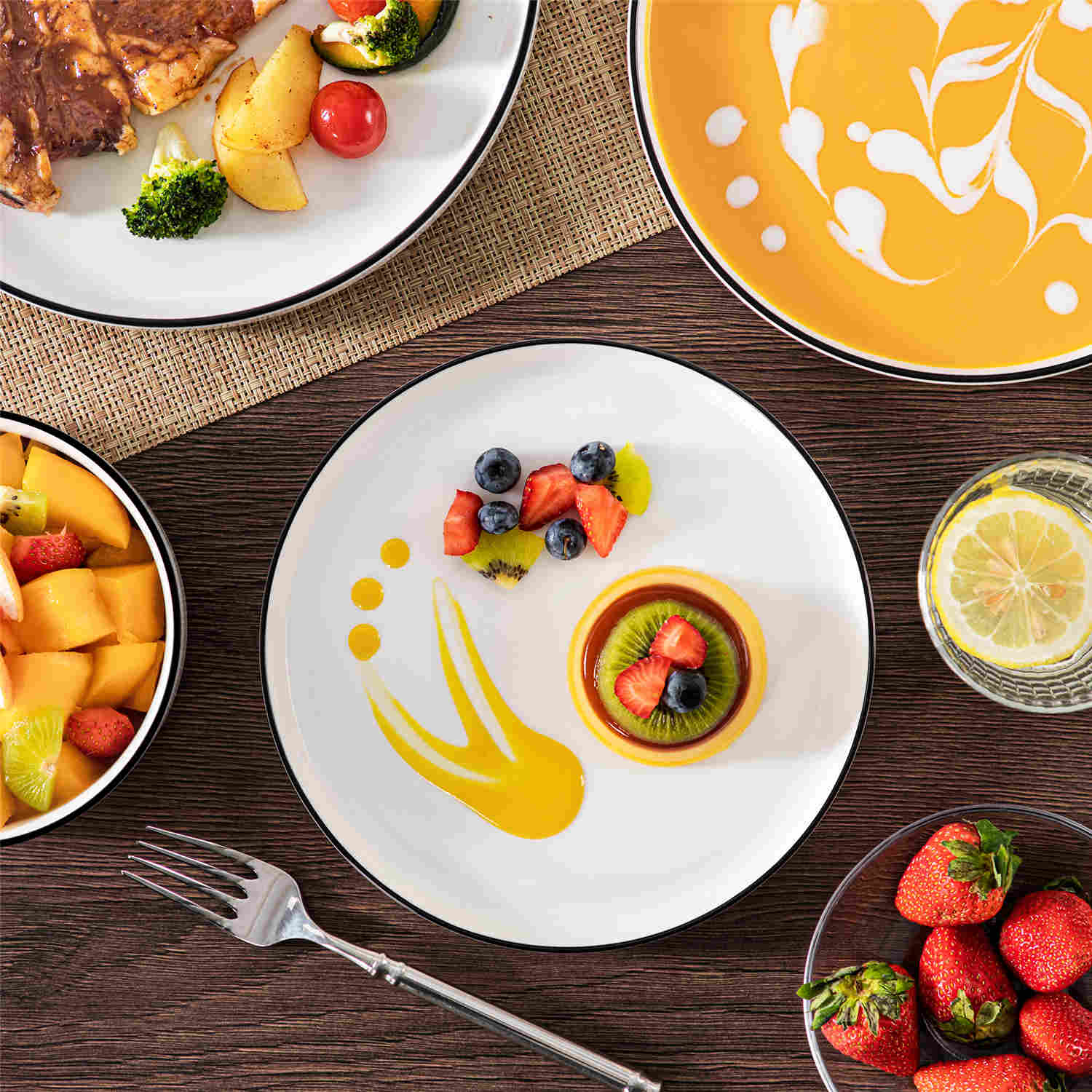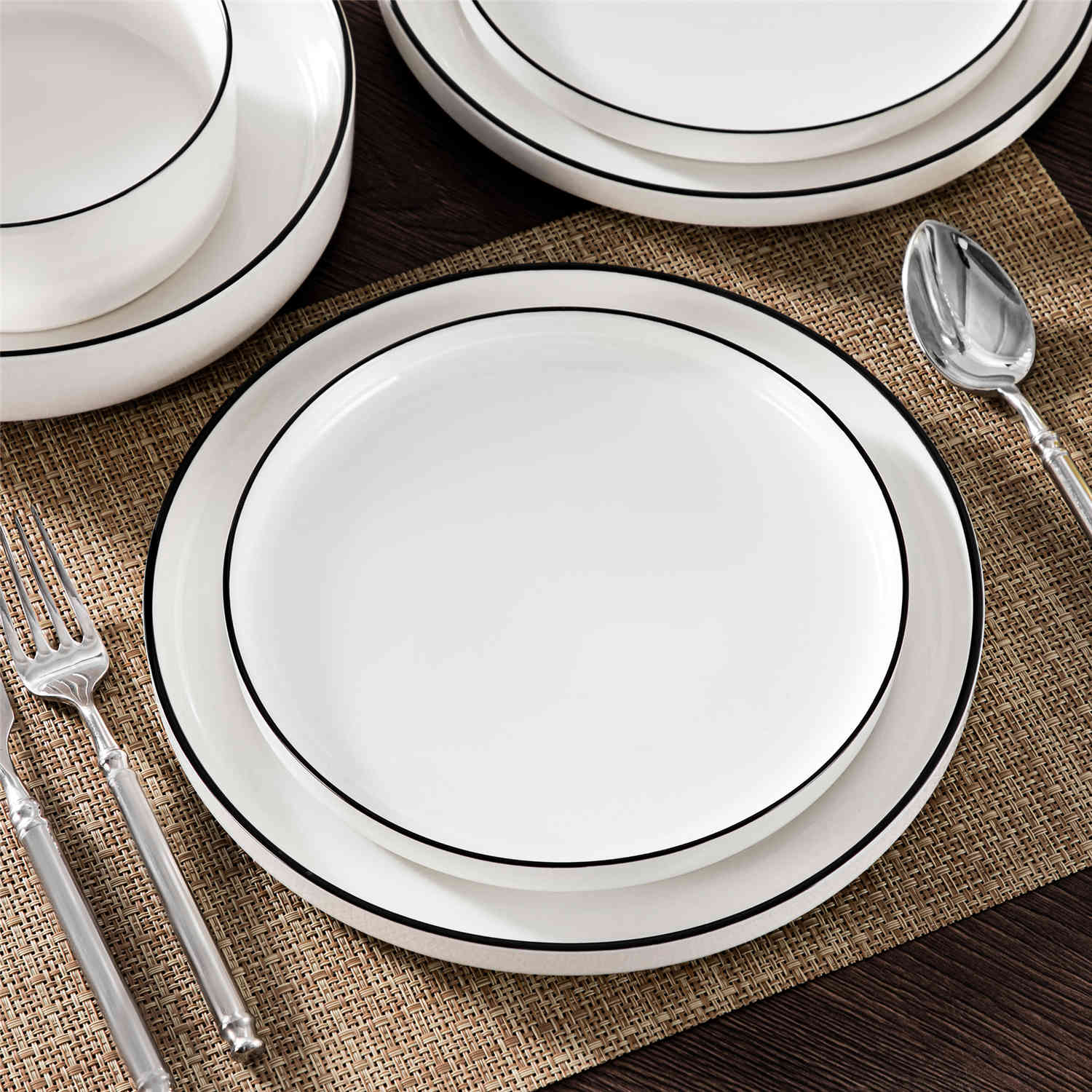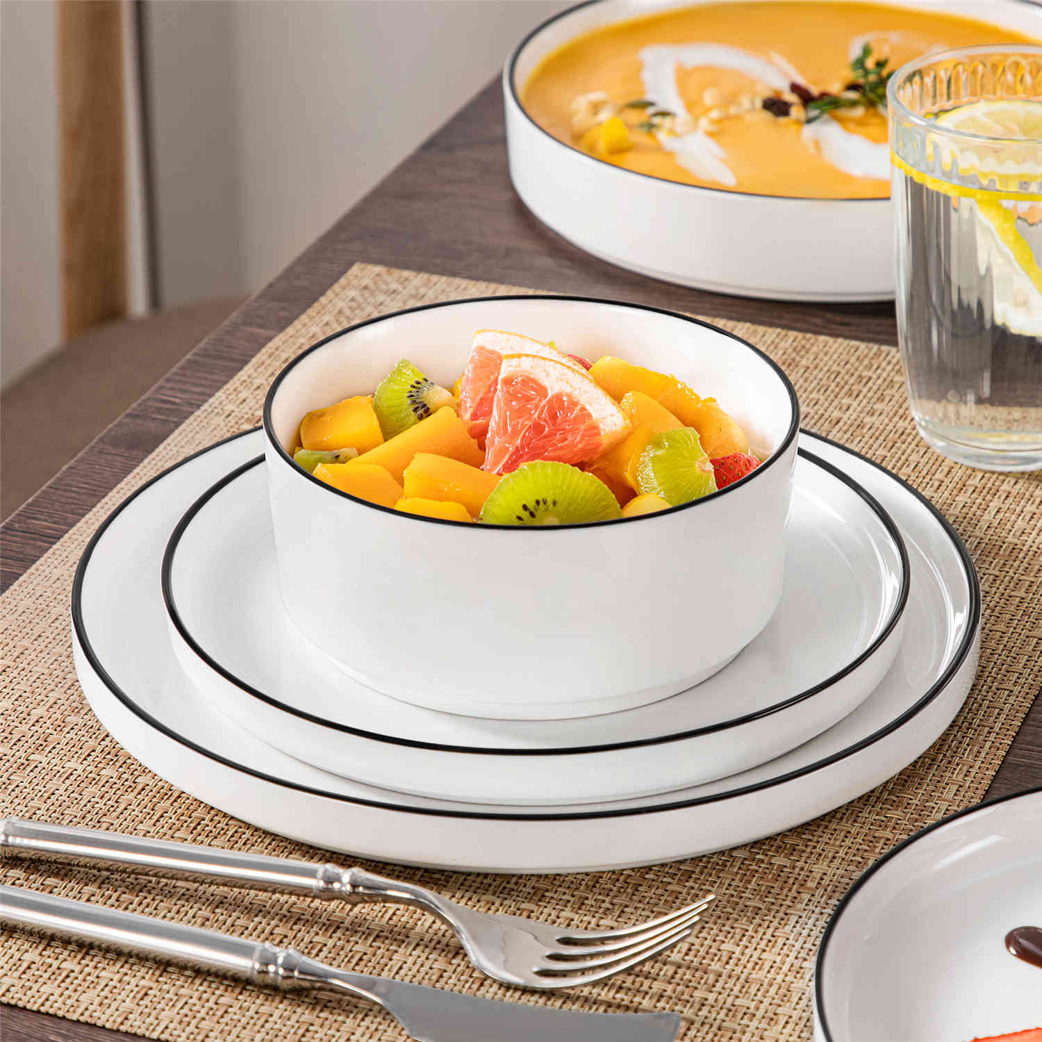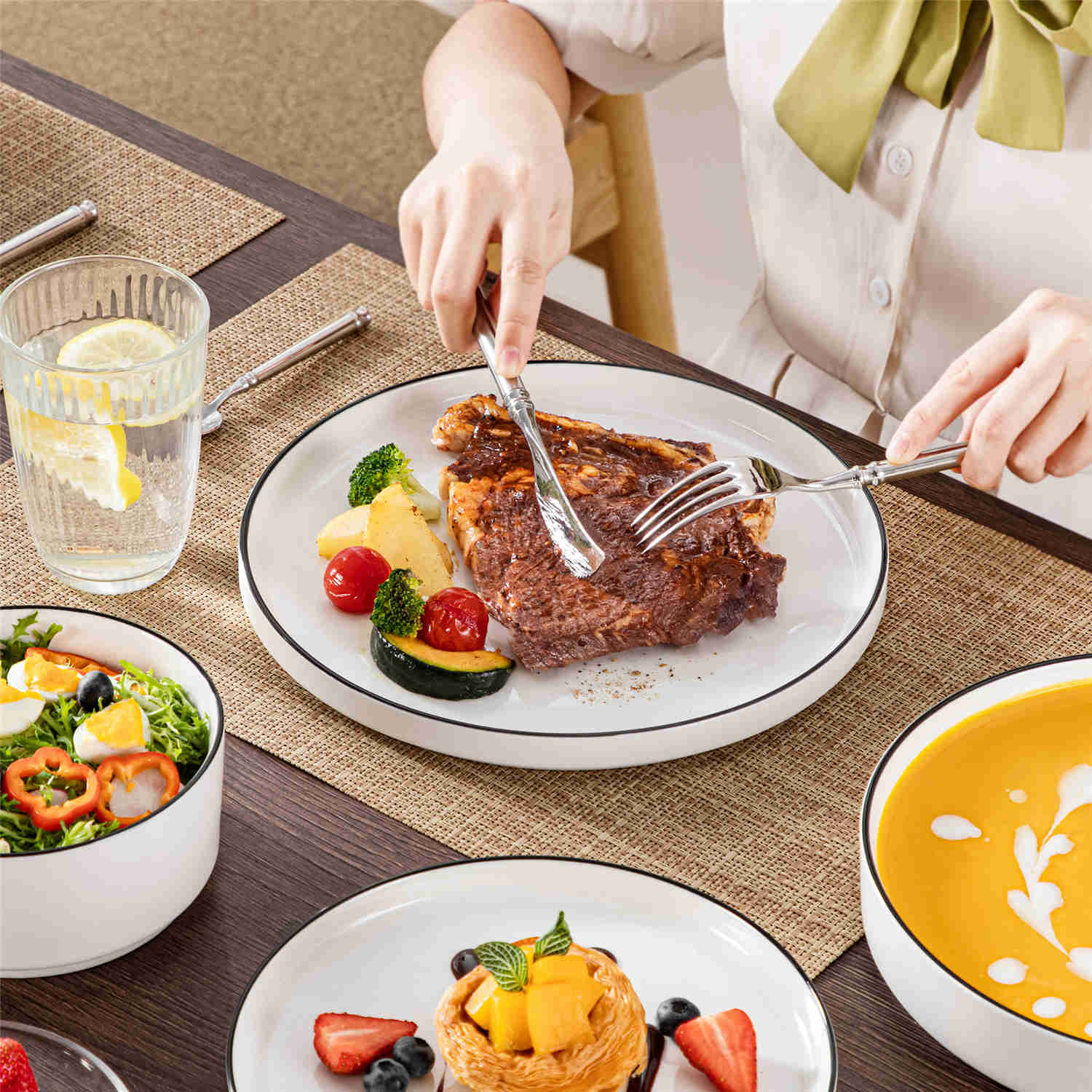 This versatile 8-person dinnerware set, available in ivory white or with a black trim, includes dinner plates, salad plates, pasta bowls, and cereal bowls. With sleek lines and straight edges, each piece offers a modern twist on a classic design. The elevated, non-slip bases ensure a secure grip, making it suitable for both indoor and outdoor use. Made from durable porcelain, this set is microwave, dishwasher, and oven safe, and stacks easily for convenient storage. Its neutral tones complement and enhance the presentation of any dish.