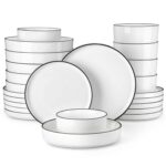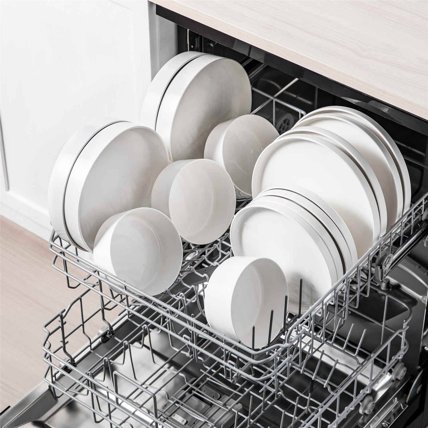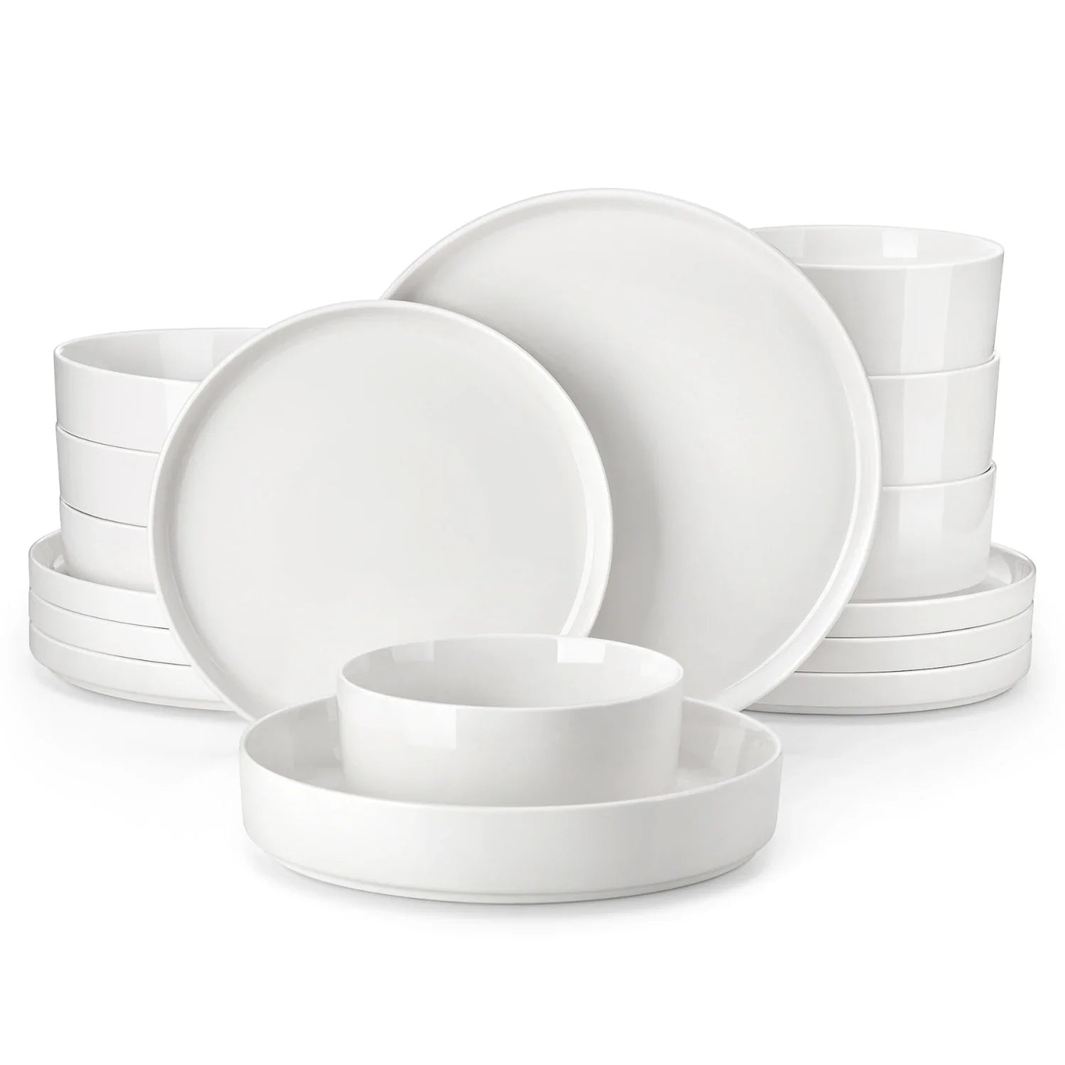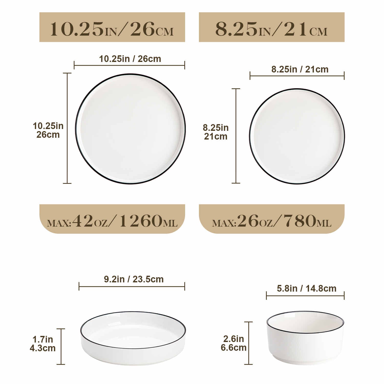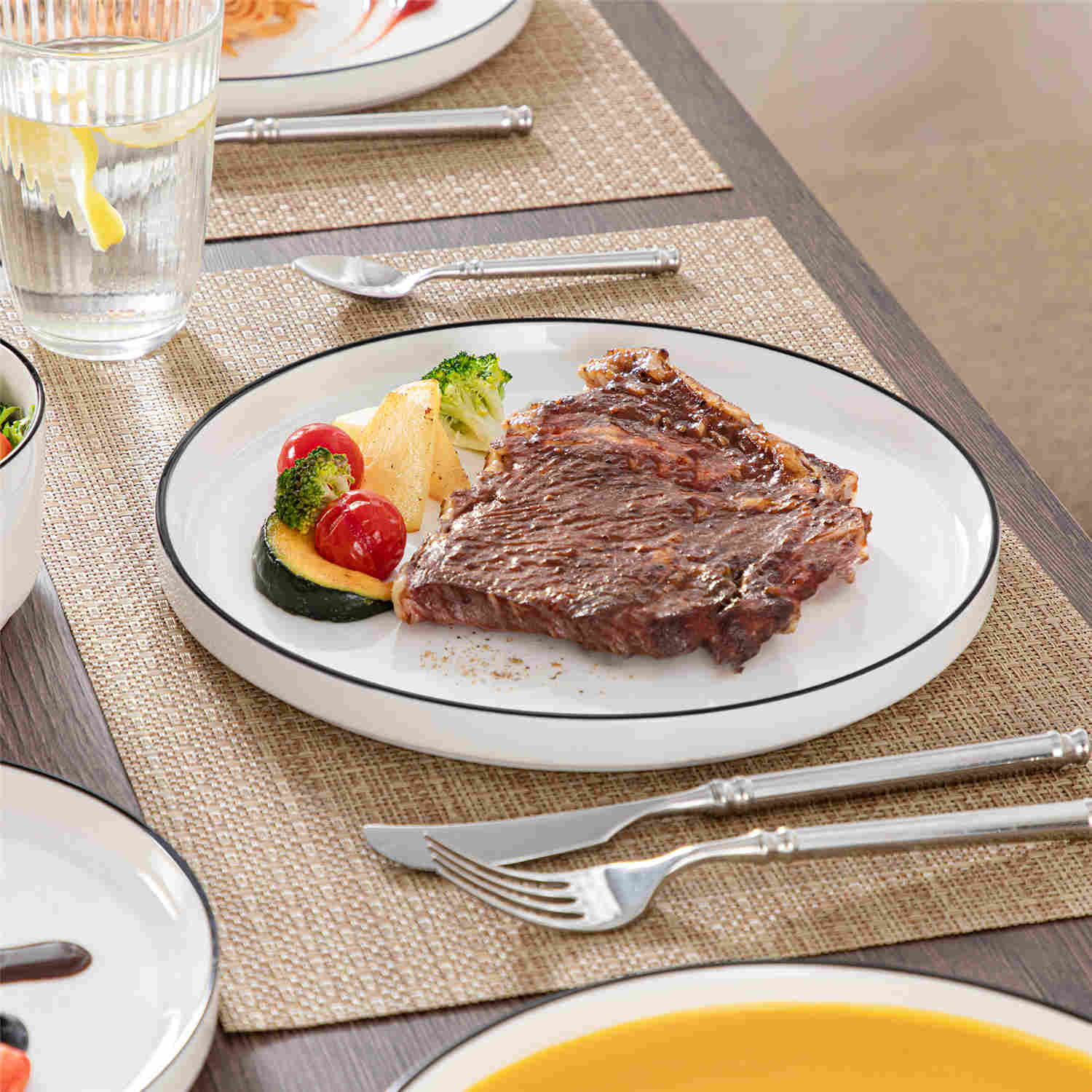 This versatile 8-person dinnerware set, available in ivory white or with a black trim, includes dinner plates, salad plates, pasta bowls, and cereal bowls. With sleek lines and straight edges, each piece offers a modern twist on a classic design. The elevated, non-slip bases ensure a secure grip, making it suitable for both indoor and outdoor use. Made from durable porcelain, this set is microwave, dishwasher, and oven safe, and stacks easily for convenient storage. Its neutral tones complement and enhance the presentation of any dish.