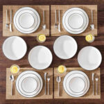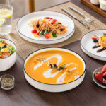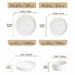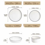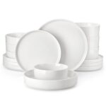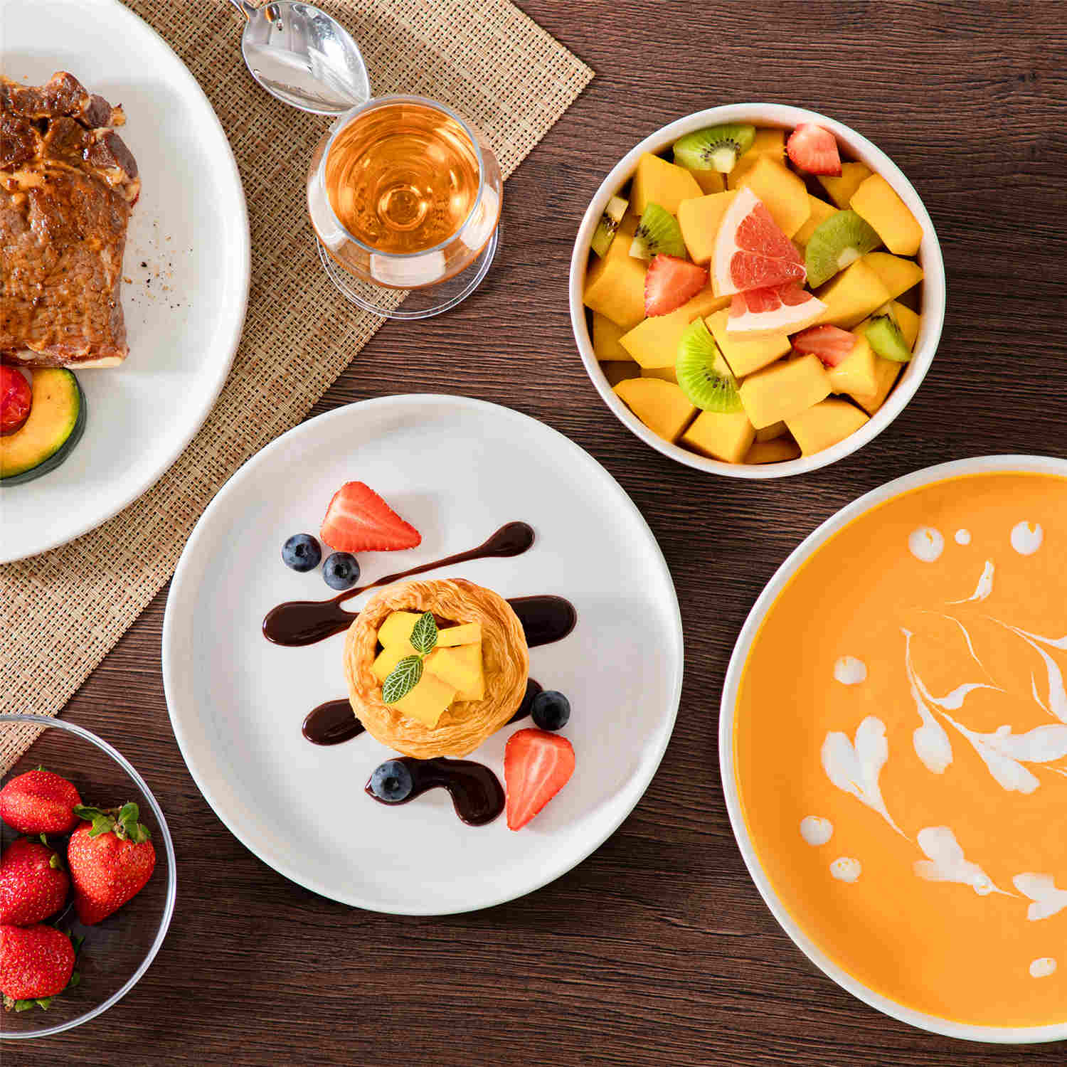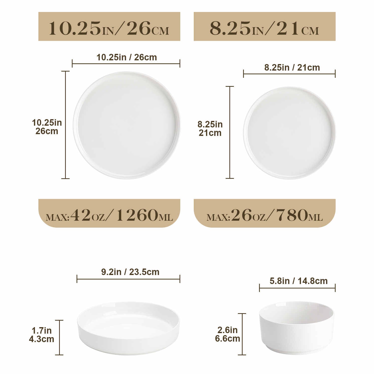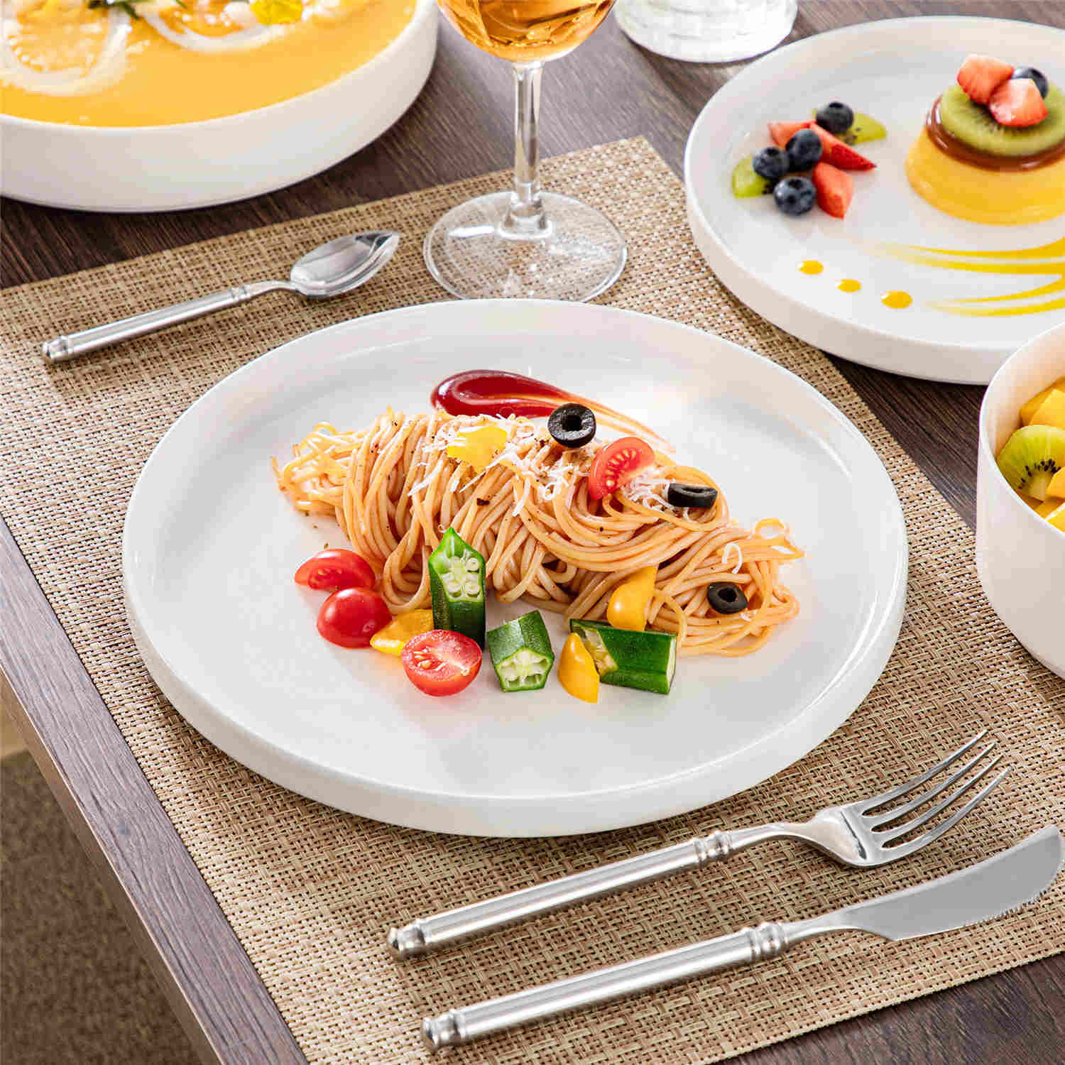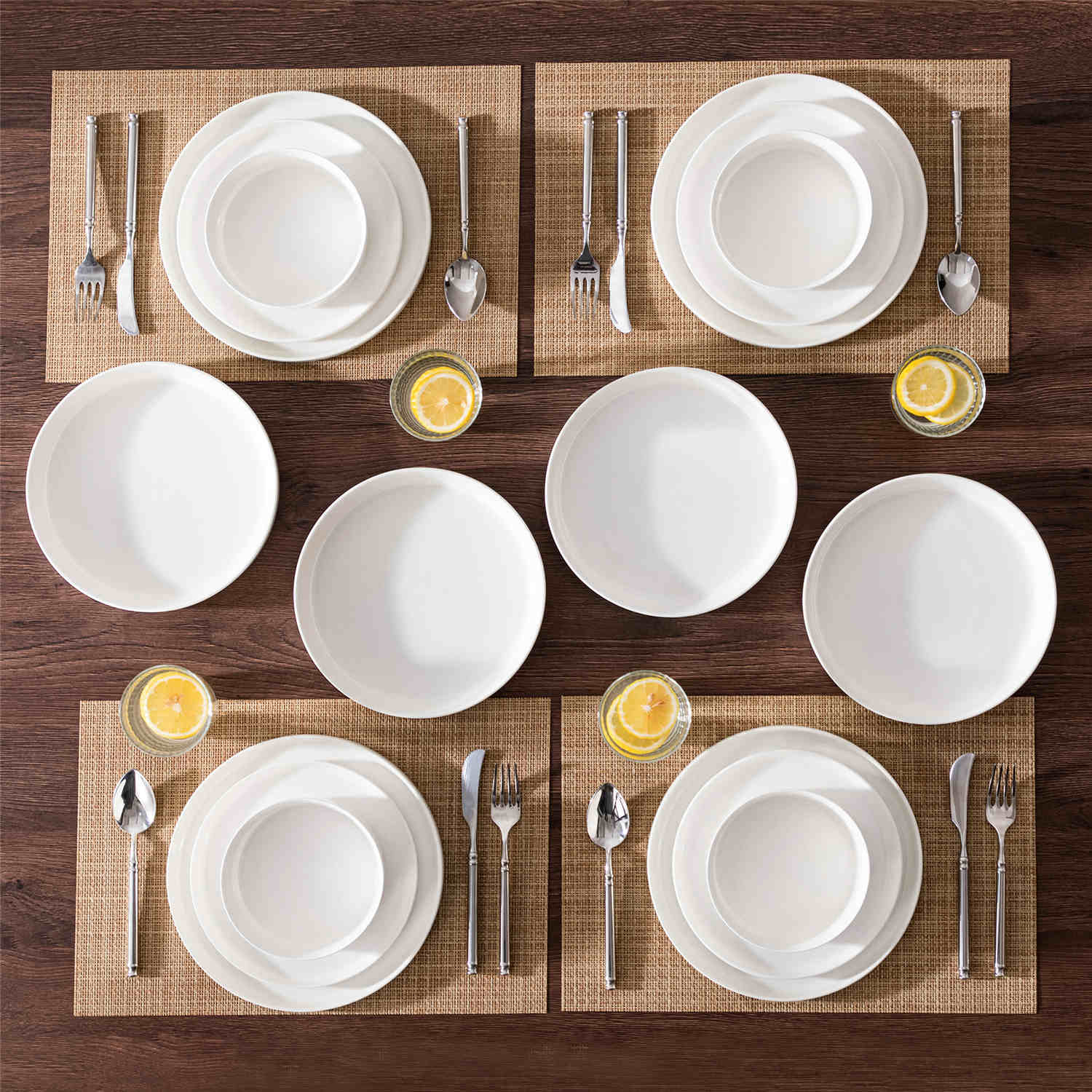 This versatile 8-person dinnerware set, available in ivory white or with a black trim, includes dinner plates, salad plates, pasta bowls, and cereal bowls. With sleek lines and straight edges, each piece offers a modern twist on a classic design. The elevated, non-slip bases ensure a secure grip, making it suitable for both indoor and outdoor use. Made from durable porcelain, this set is microwave, dishwasher, and oven safe, and stacks easily for convenient storage. Its neutral tones complement and enhance the presentation of any dish.