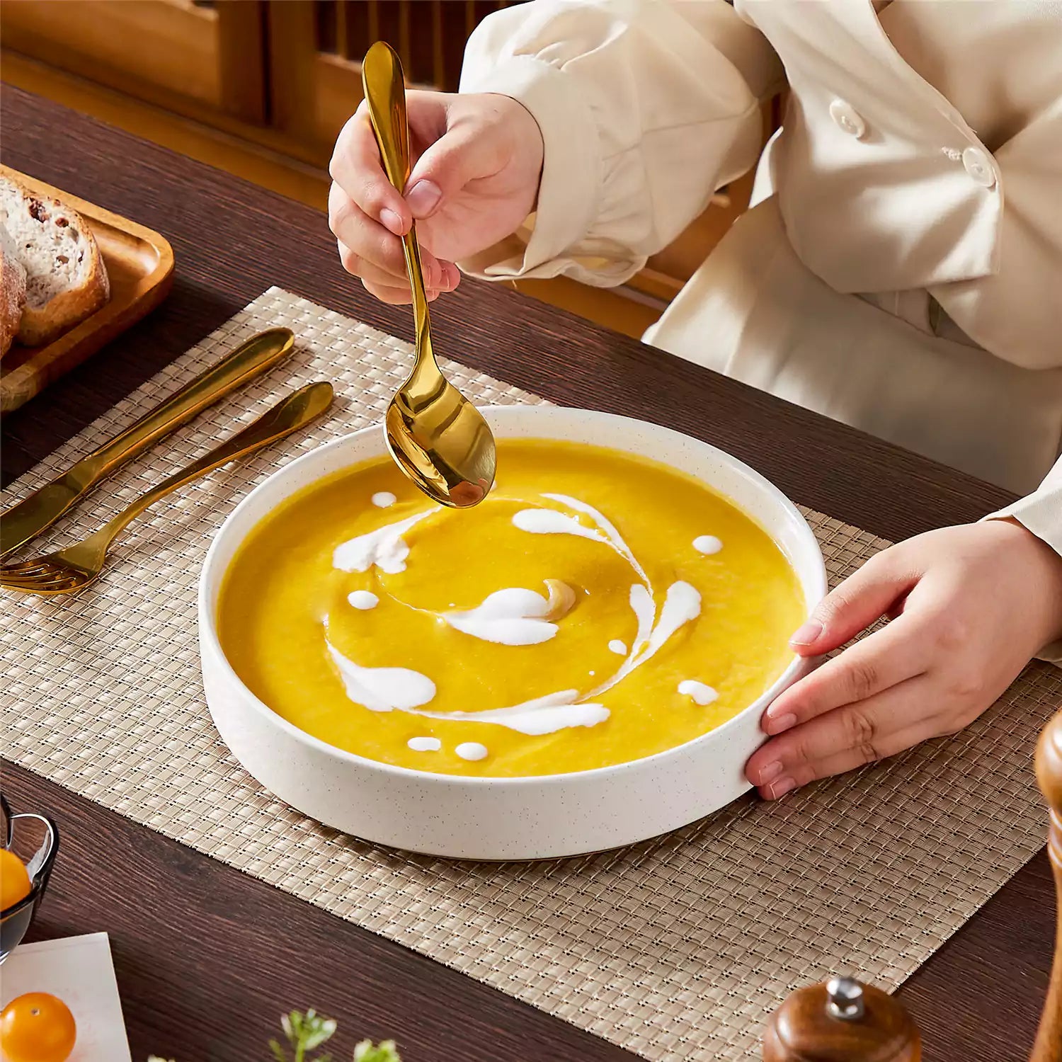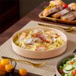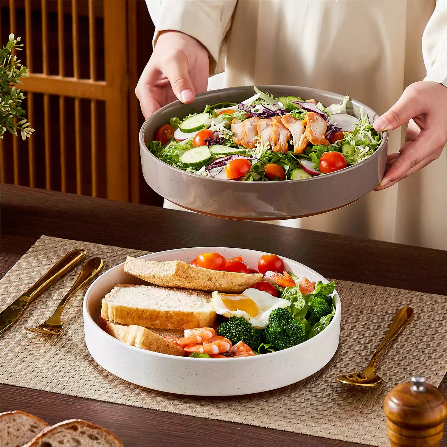 Designed for both everyday ease and special occasions, the Leah pasta bowl set of four blends delicate elegance with lasting durability. The bowls’ modern silhouette—straight edges and refined lines—are paired with a speckled glaze and a grounding clay-colored base. Offered in classic ivory or vibrant multicolor, they bring versatile style to your table. The elevated non-slip bases ensure stability, stack neatly to save space, and with their stoneware strength they’re safe for microwave, oven, and dishwasher use—making reliable function part of their timeless charm.