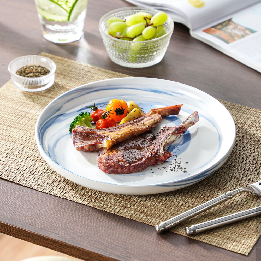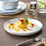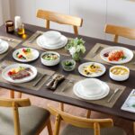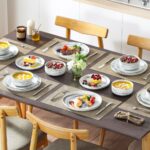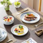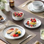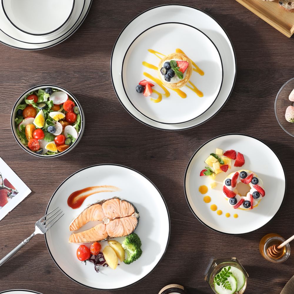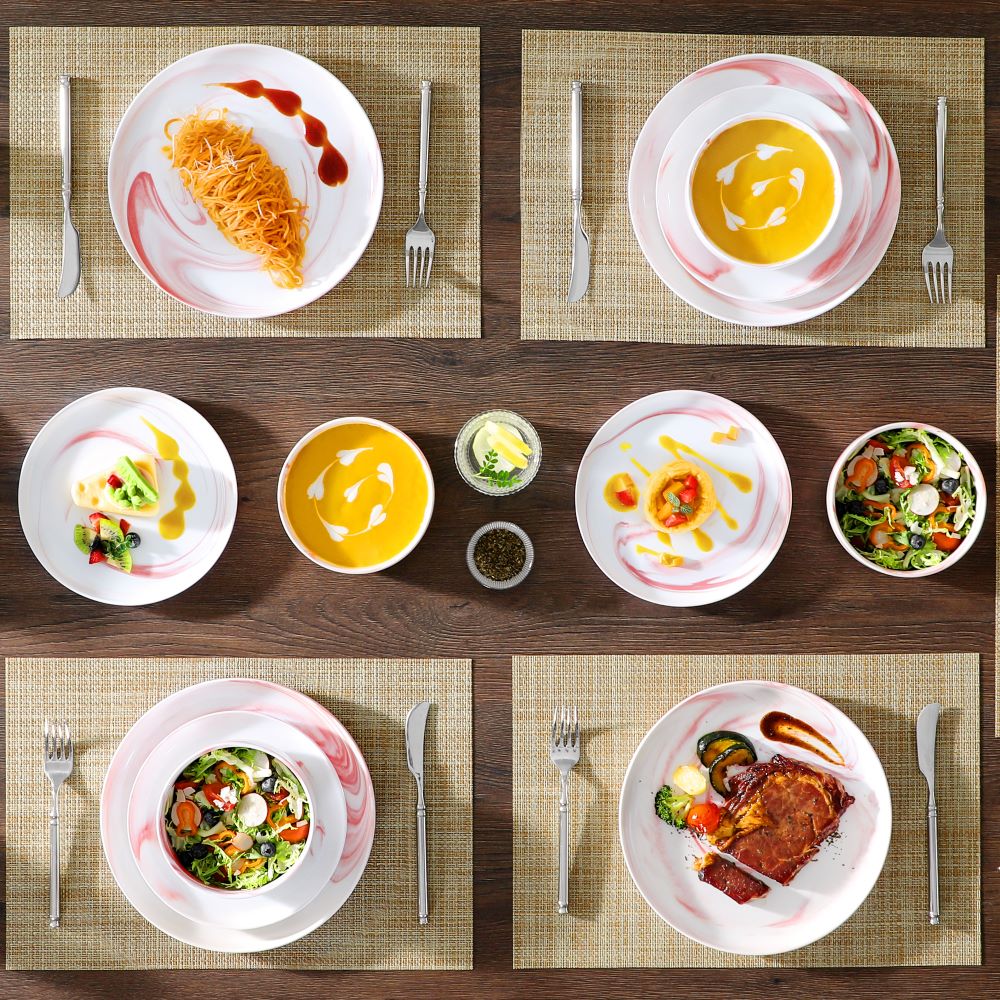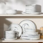 The Luna 18-Piece Set blends elegance and practicality, inspired by the moon’s serene beauty. Available in ivory white, ivory with black trim, or marble designs in pink, blue, and gray, this set serves six with dinner plates, salad plates, and cereal bowls. The lipped-edge design adds modern refinement, while the stackable, space-saving form suits contemporary homes. Made from durable, non-porous porcelain, it resists odors and is microwave, oven, and dishwasher safe, bringing timeless charm to every meal.