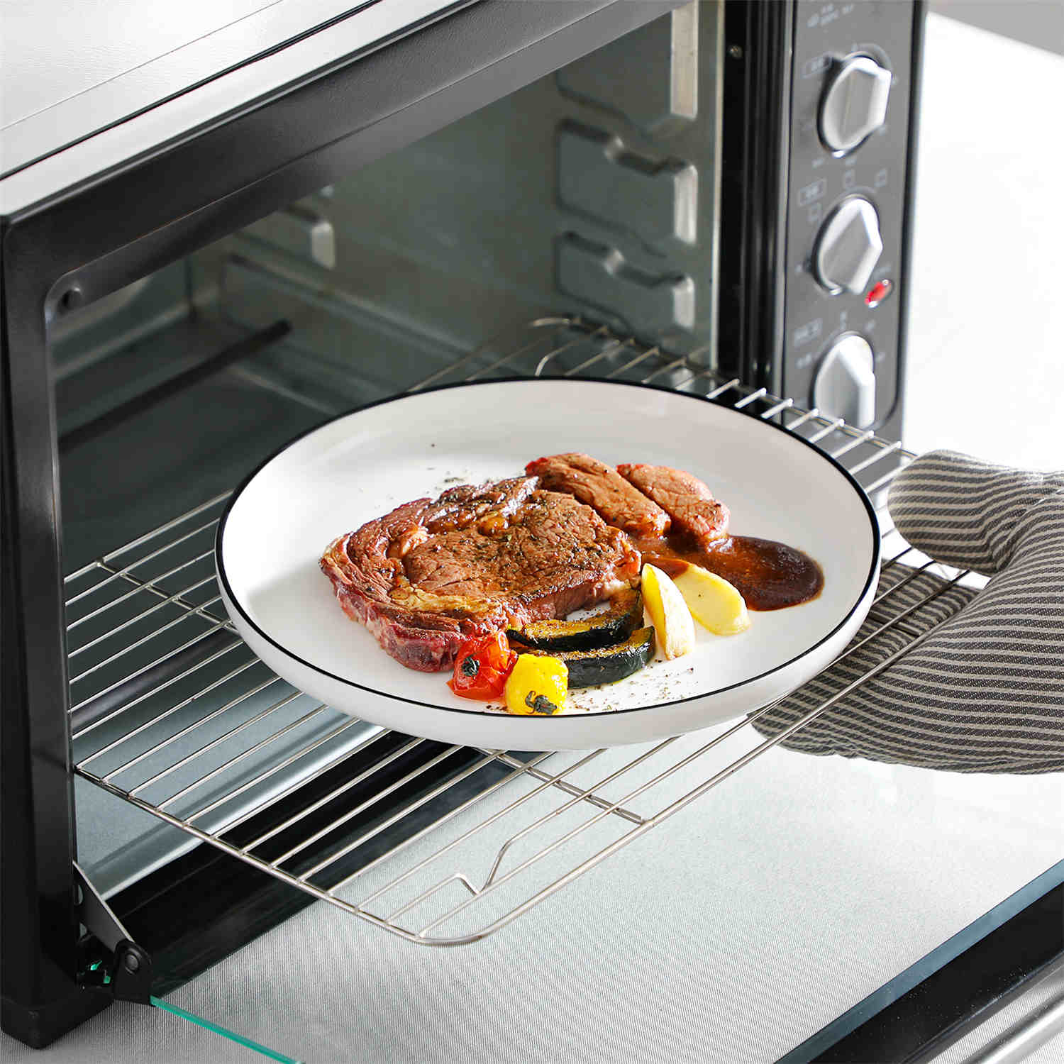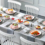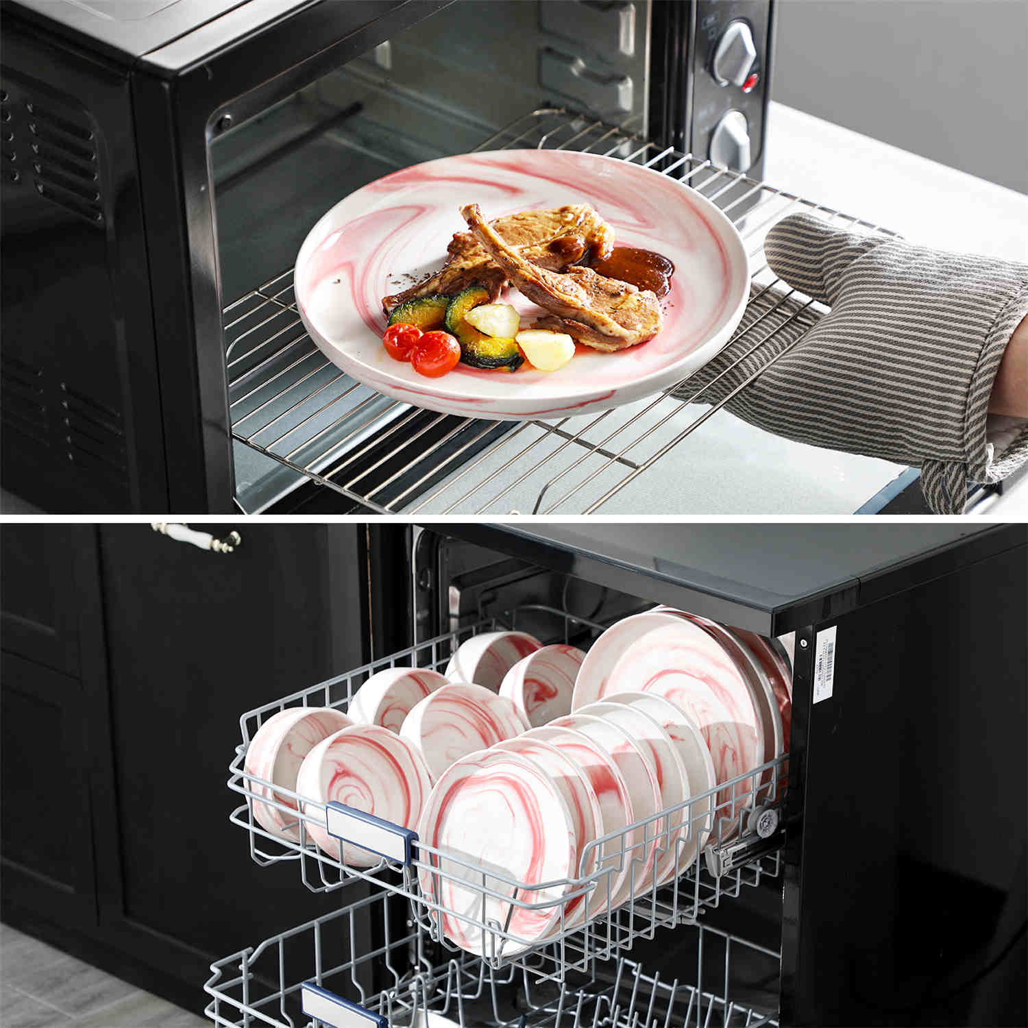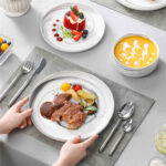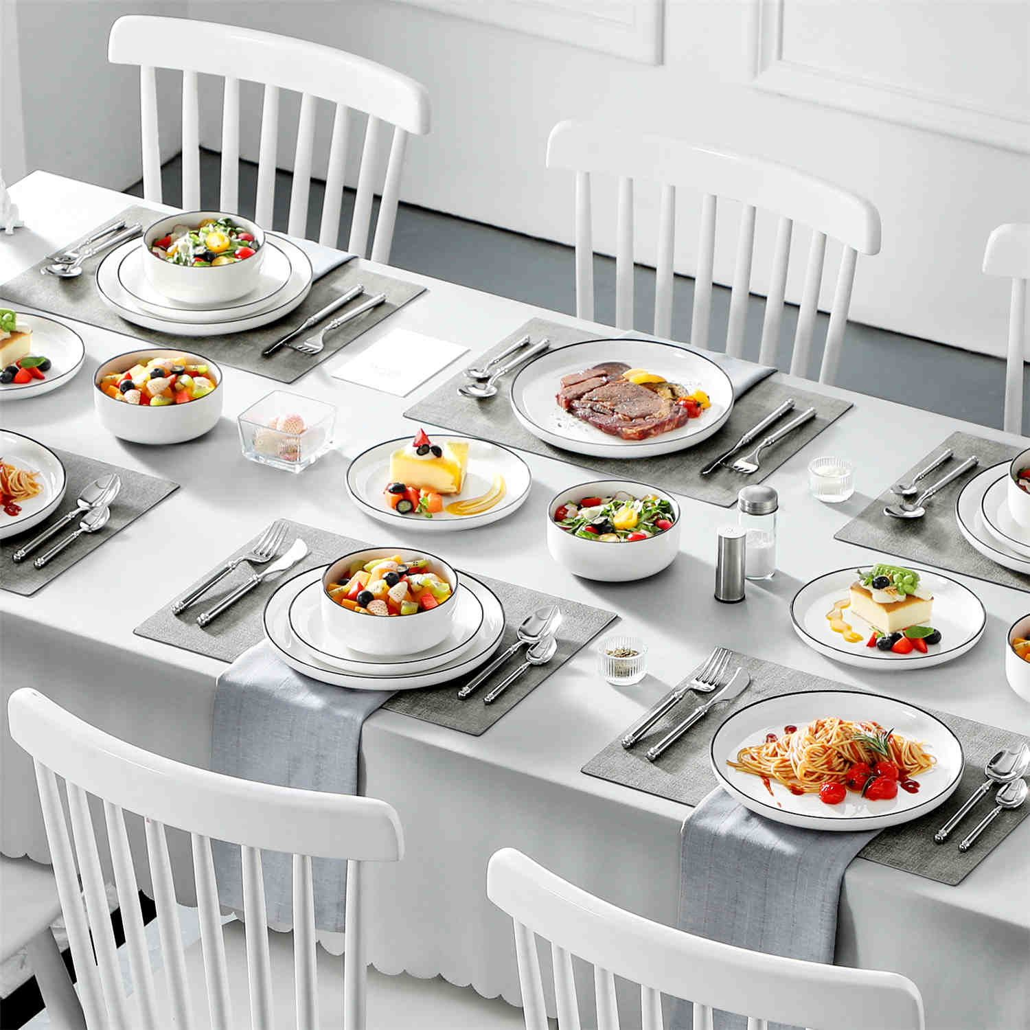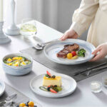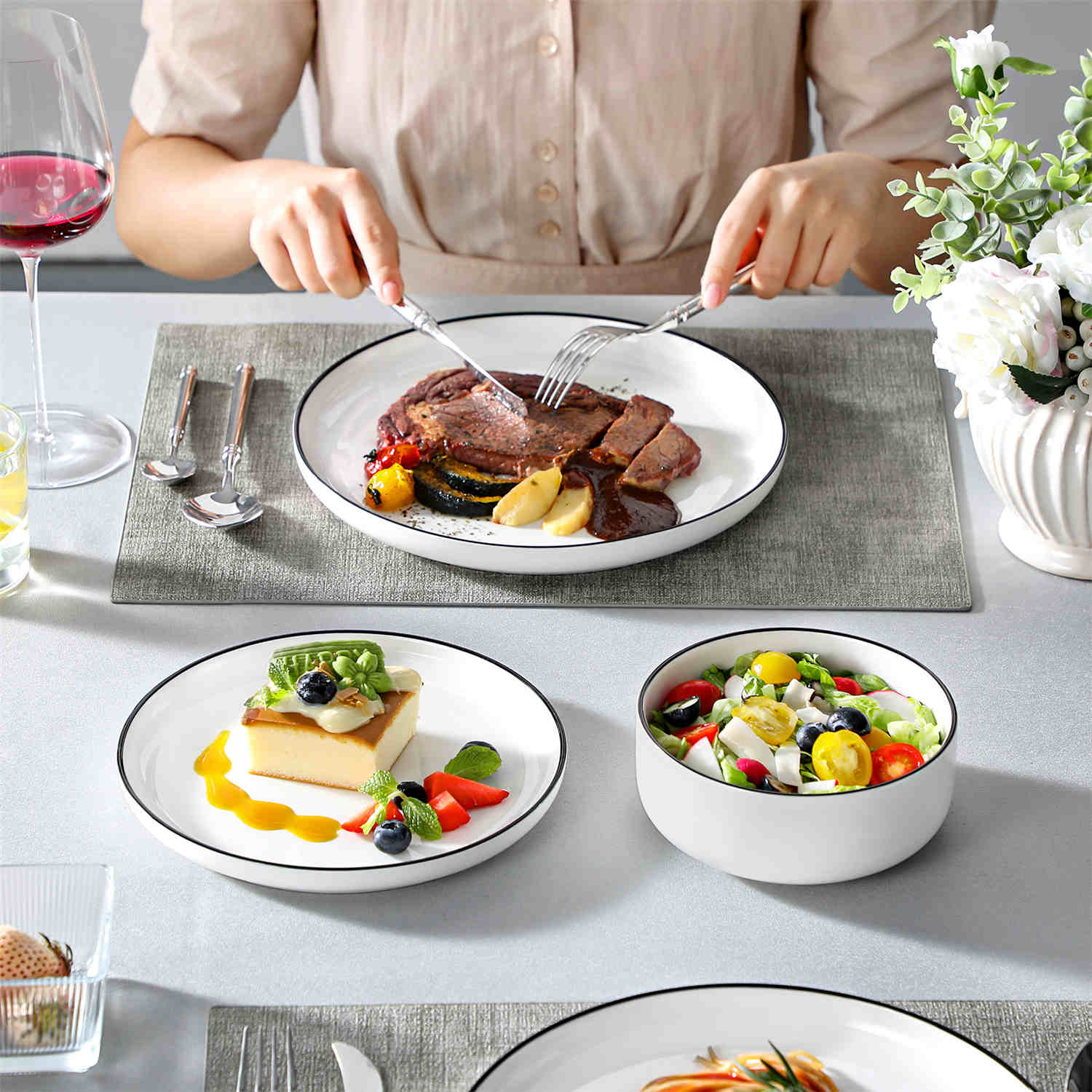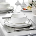The Luna 18-Piece Set blends elegance and practicality, inspired by the moon’s serene beauty. Available in ivory white, ivory with black trim, or marble designs in pink, blue, and gray, this set serves six with dinner plates, salad plates, and cereal bowls. The lipped-edge design adds modern refinement, while the stackable, space-saving form suits contemporary homes. Made from durable, non-porous porcelain, it resists odors and is microwave, oven, and dishwasher safe, bringing timeless charm to every meal.