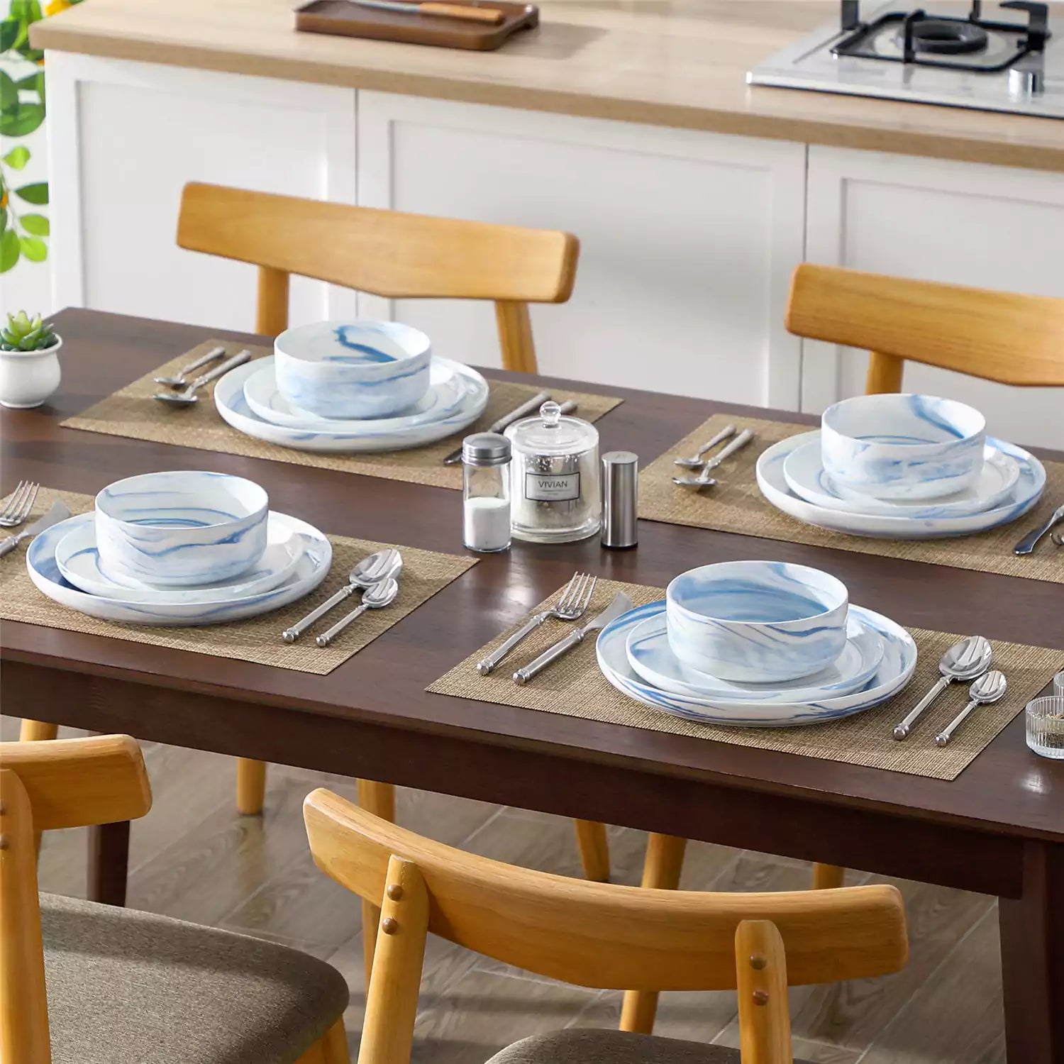 Step into modern sophistication with this coveted dinnerware set, defined by its sleek lipped design and offered in a refined palette—classic ivory white, elegant black-trimmed ivory, and marbled hues of grey, blue, and pink. This durable porcelain collection for eight includes dinner plates, dessert plates, and cereal bowls. Dishwasher, microwave, and oven safe, it blends contemporary style with timeless practicality for everyday use.