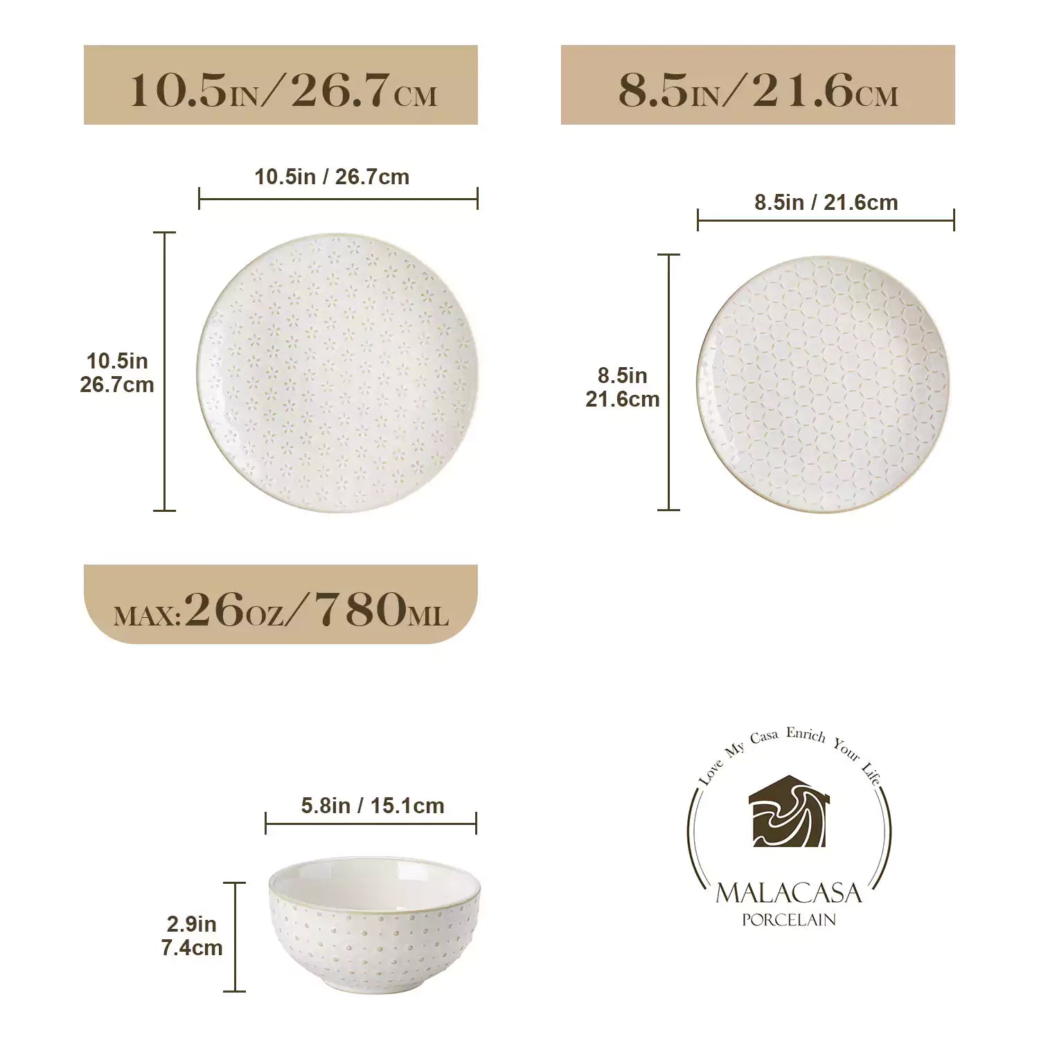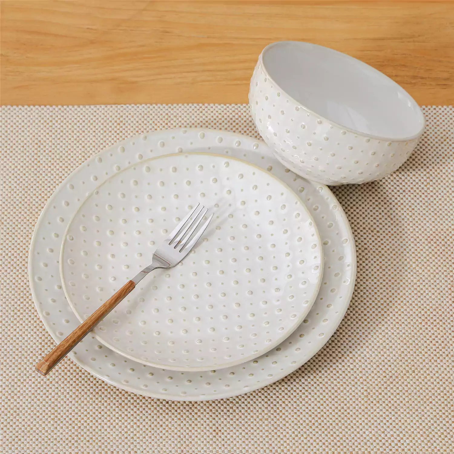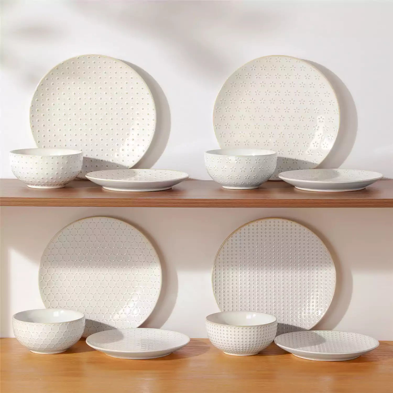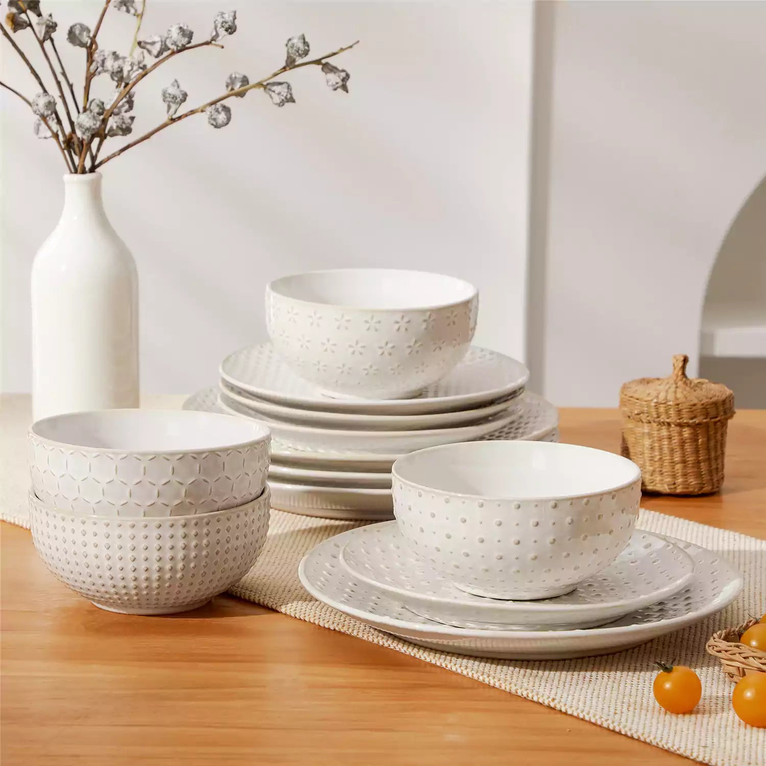 The Lydia 12-Piece Dinnerware Set brings artisanal texture and timeless charm to your table with four unique embossed motifs—dotted borders, diamond patterns, daisy florals, and hexagonal reliefs. Crafted from durable stoneware and finished in soft antique white with a hand-applied reactive glaze, each piece displays subtle color variations that highlight its handcrafted character. The set includes dinner plates, salad plates, and cereal bowls for four. Microwave, oven, and dishwasher safe.