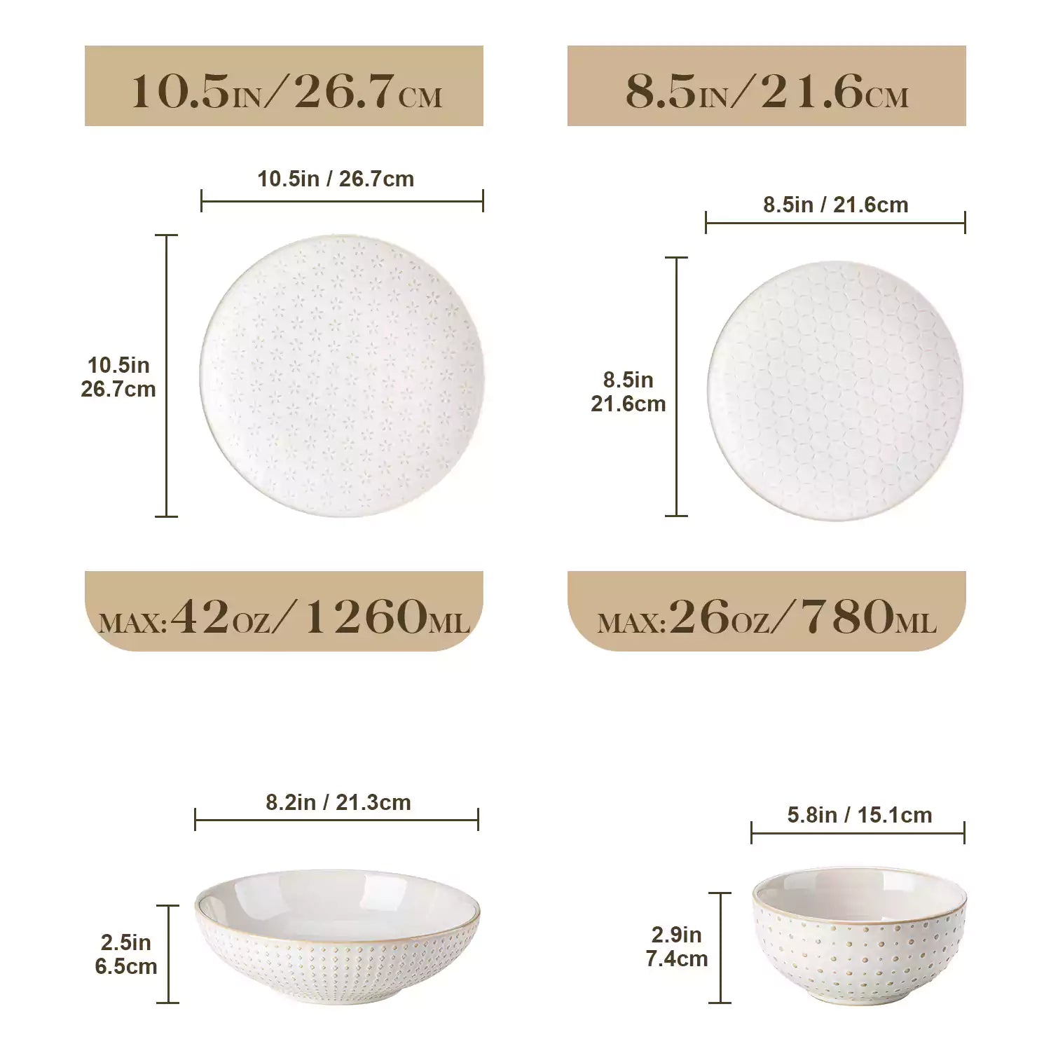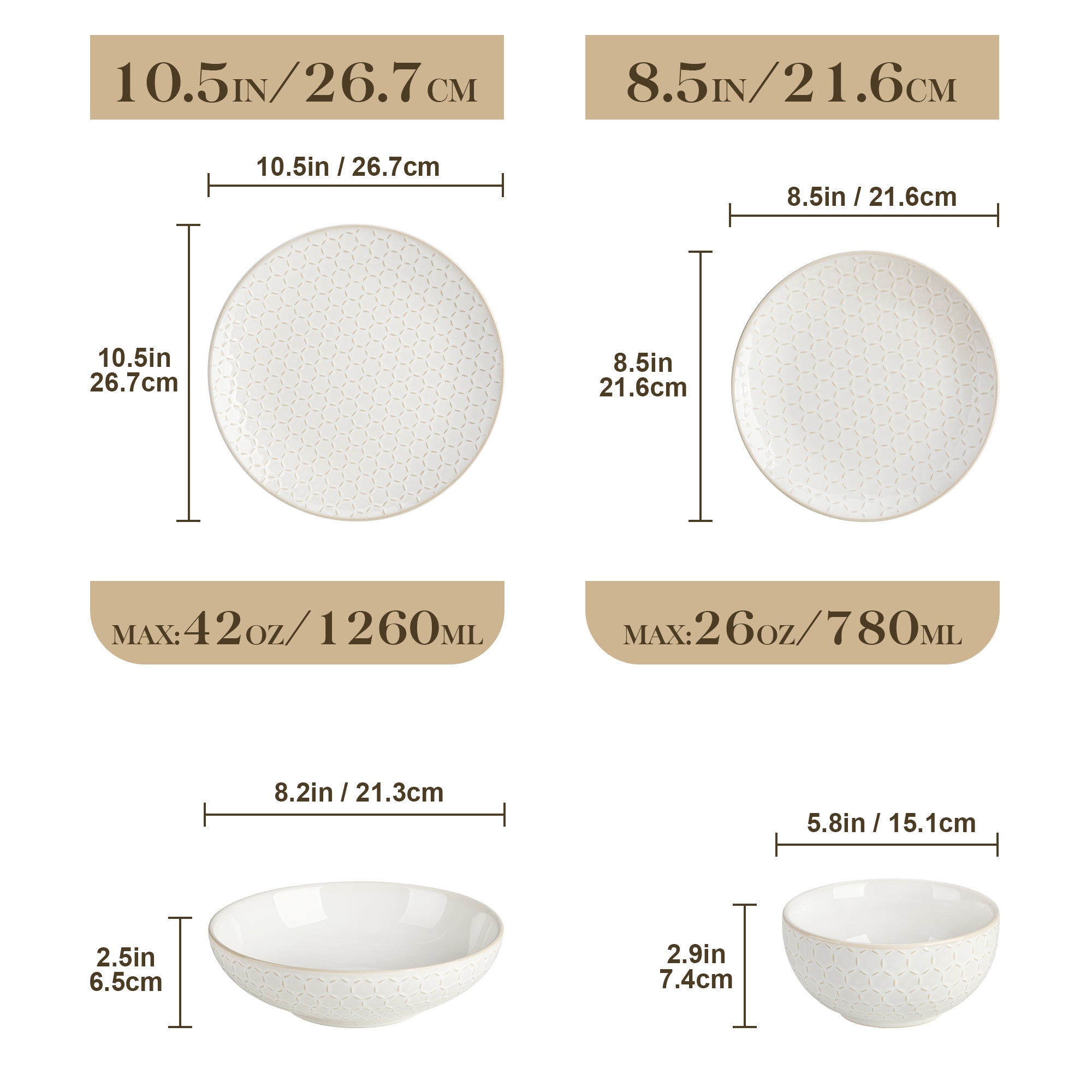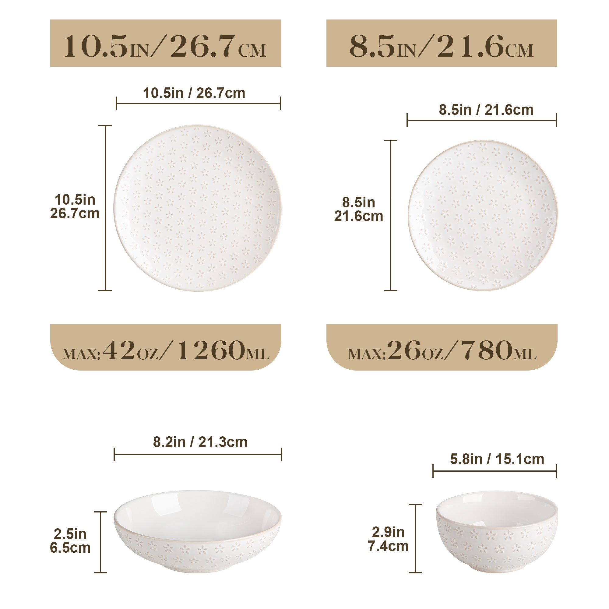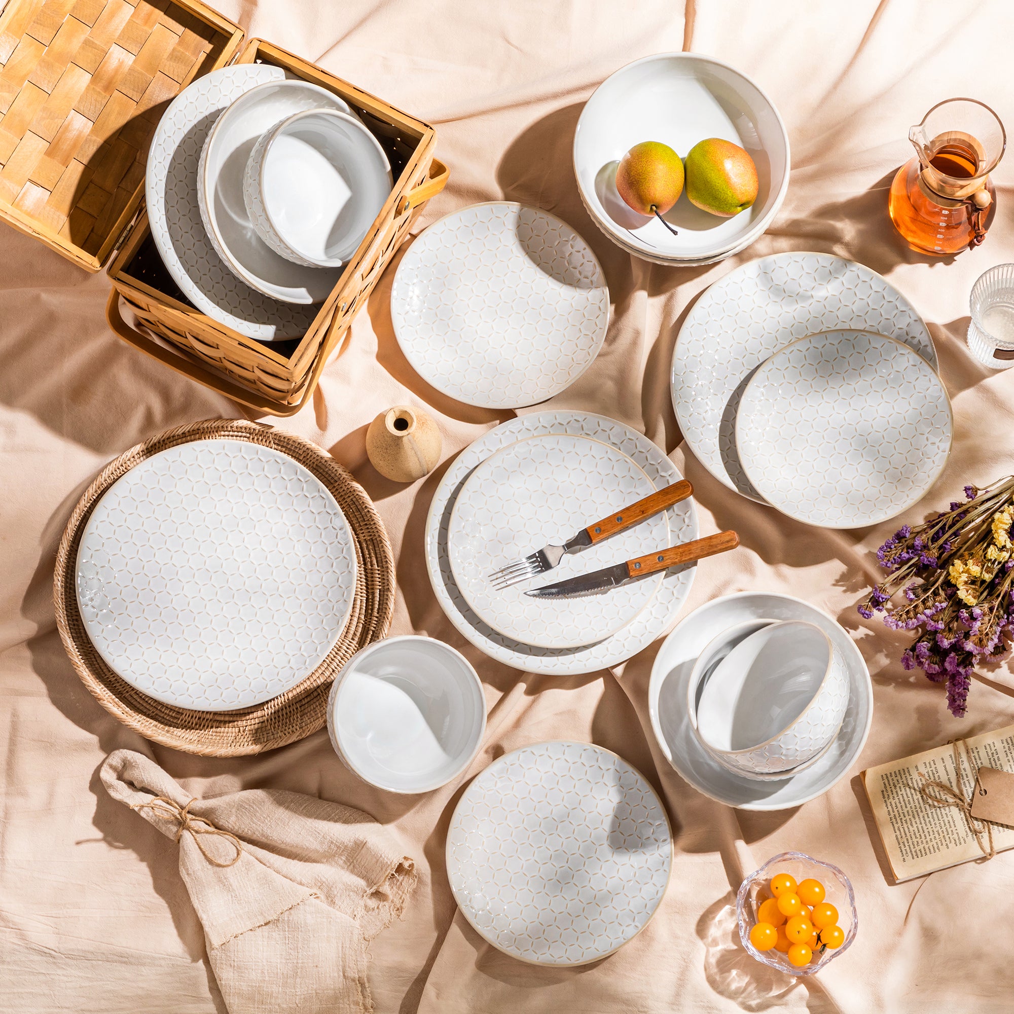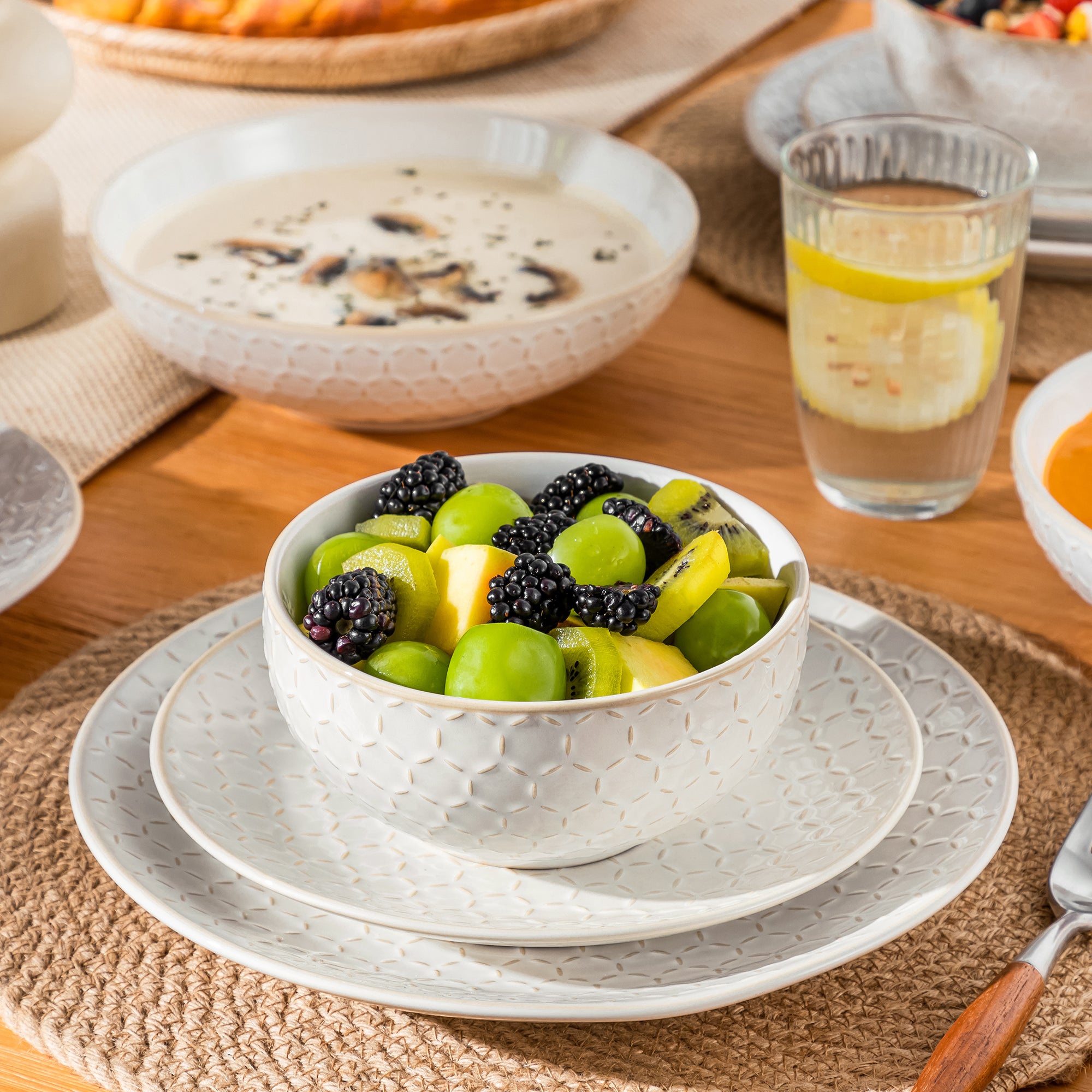 Lydia 16-Piece Stoneware Dinnerware Set in soft antique white features assorted embossed patterns—textured dots, vintage diamond reliefs, daisy floral accents, and hexagonal weaves. Crafted from durable stoneware and finished with a reactive glaze, each piece displays subtle tonal variations and handcrafted charm. The set includes 4 dinner plates, 4 salad plates, 4 soup plates, and 4 cereal bowls—microwave, oven, and dishwasher safe for effortless everyday use.