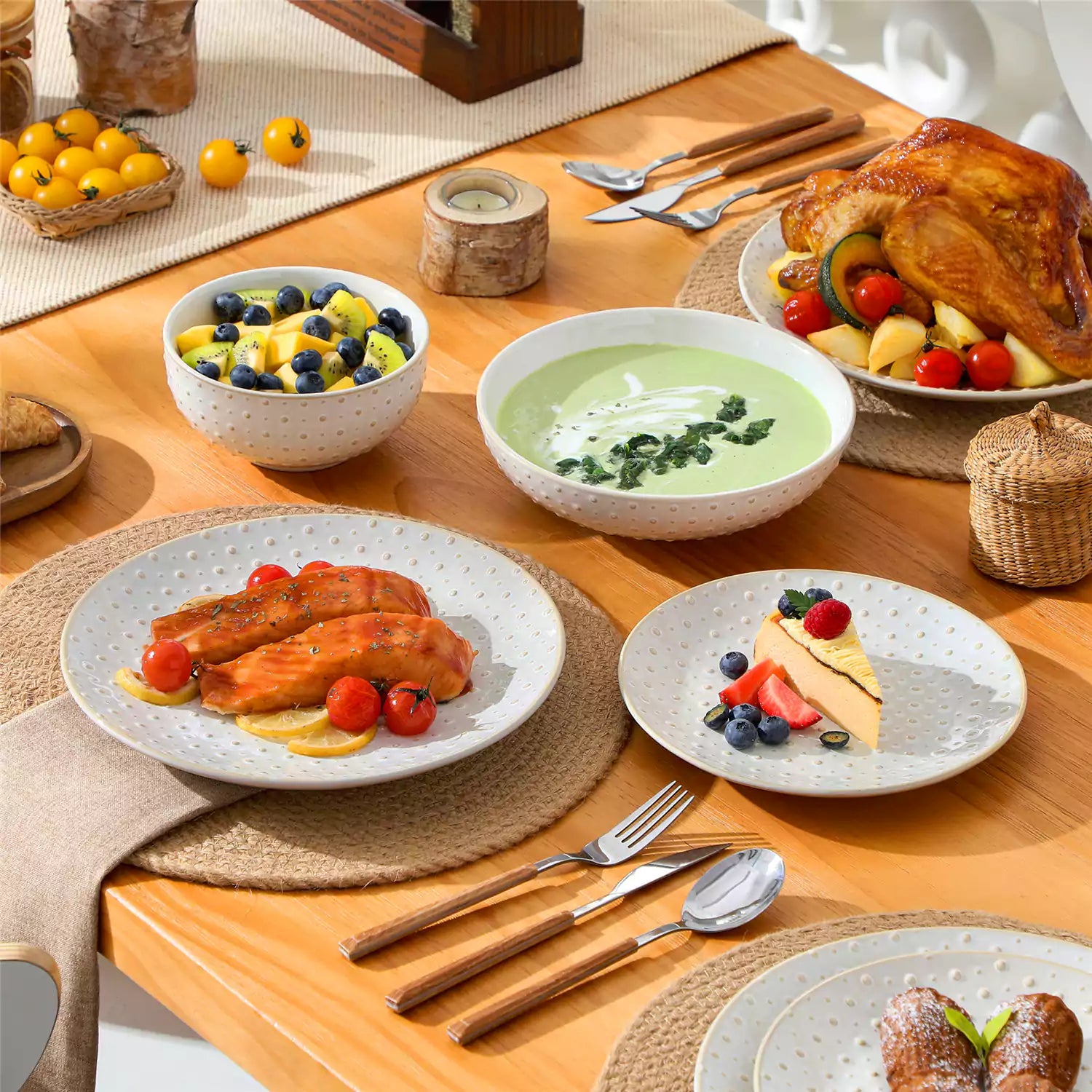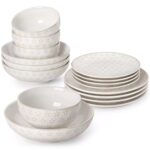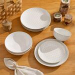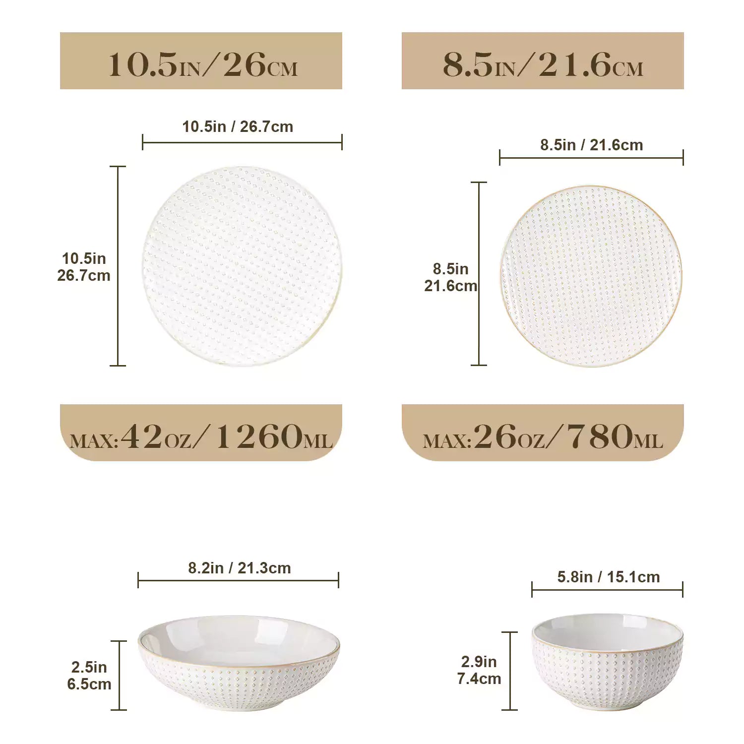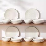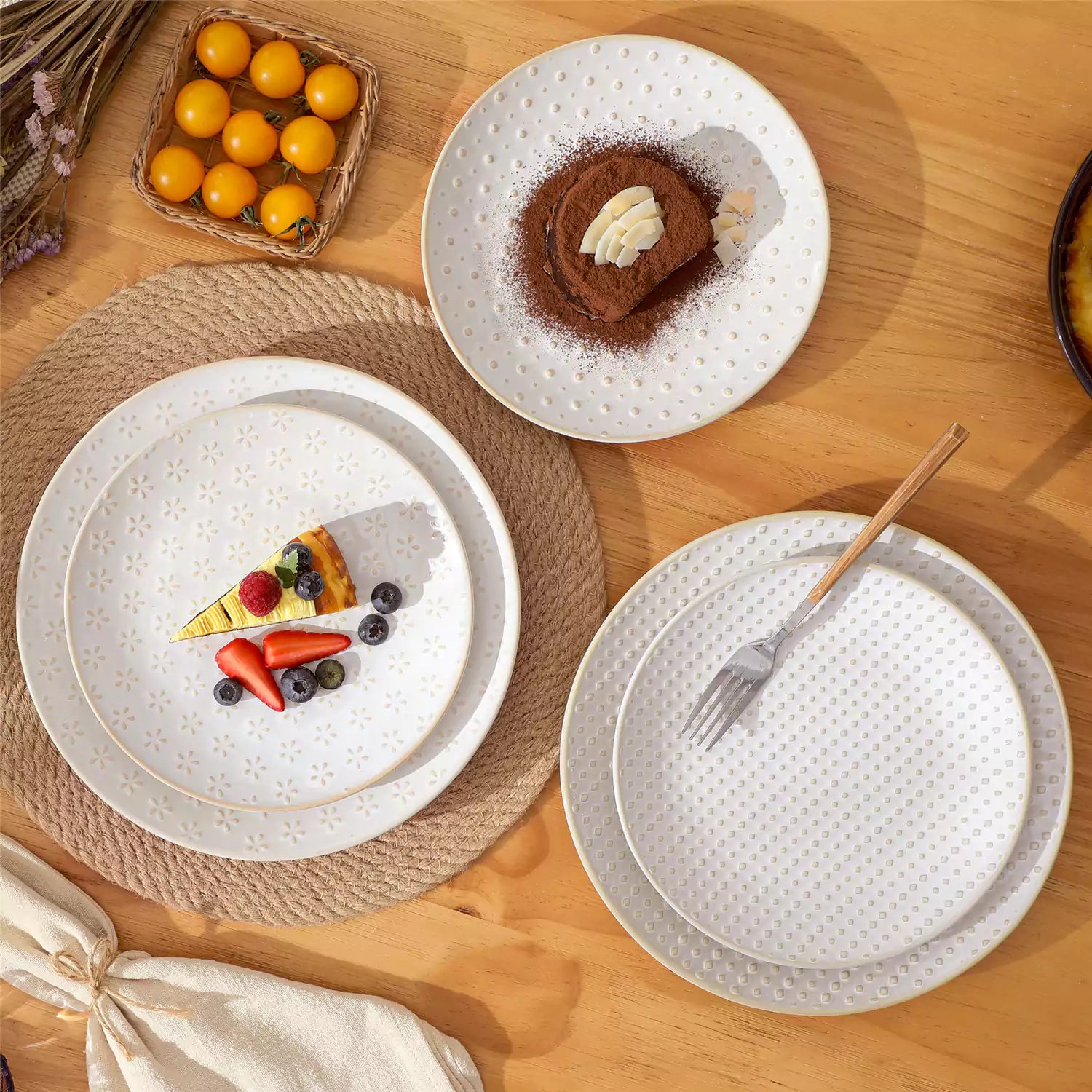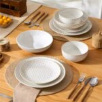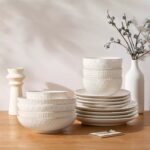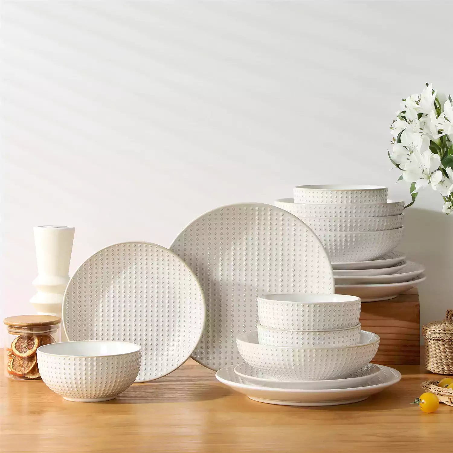Lydia 16-Piece Stoneware Dinnerware Set in soft antique white features assorted embossed patterns—textured dots, vintage diamond reliefs, daisy floral accents, and hexagonal weaves. Crafted from durable stoneware and finished with a reactive glaze, each piece displays subtle tonal variations and handcrafted charm. The set includes 4 dinner plates, 4 salad plates, 4 soup plates, and 4 cereal bowls—microwave, oven, and dishwasher safe for effortless everyday use.