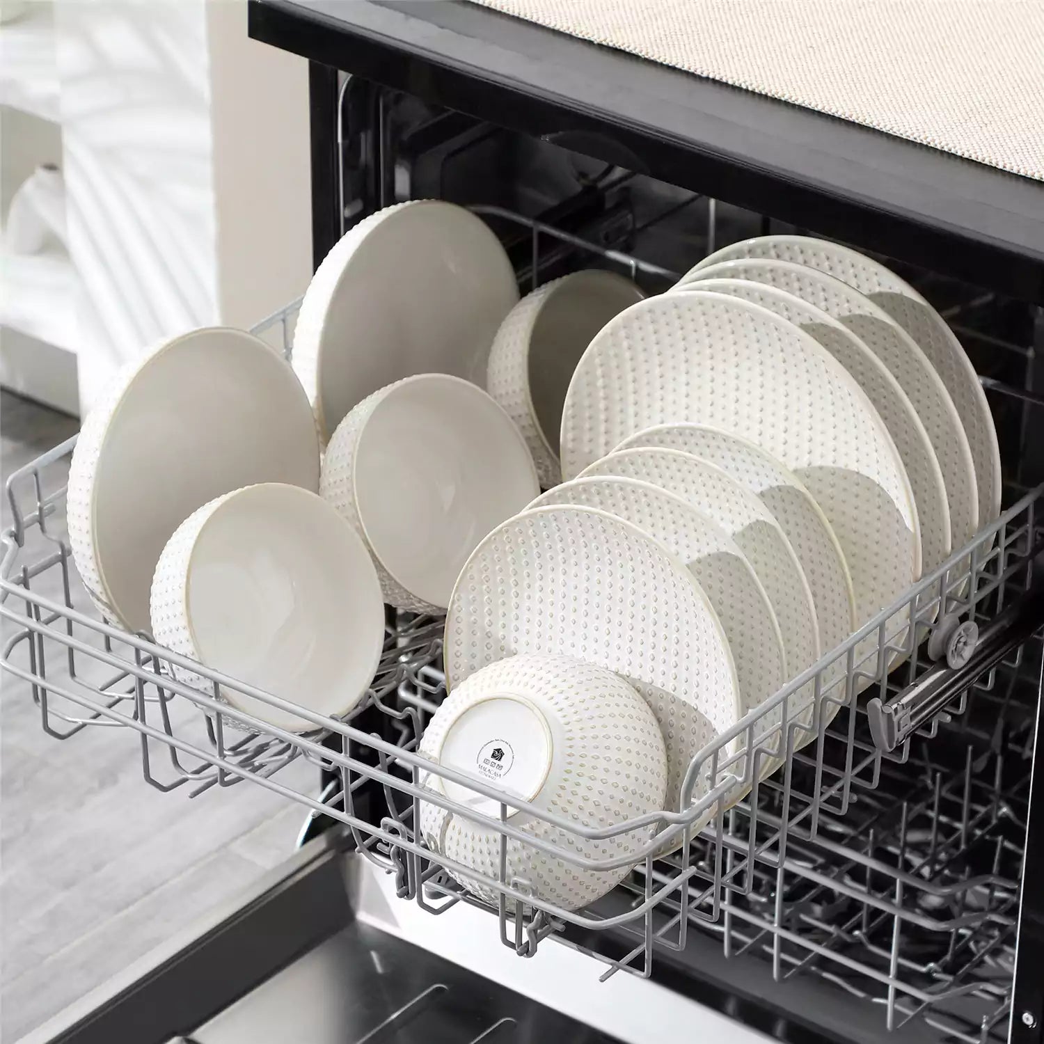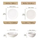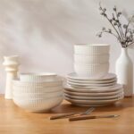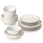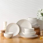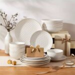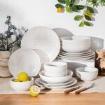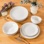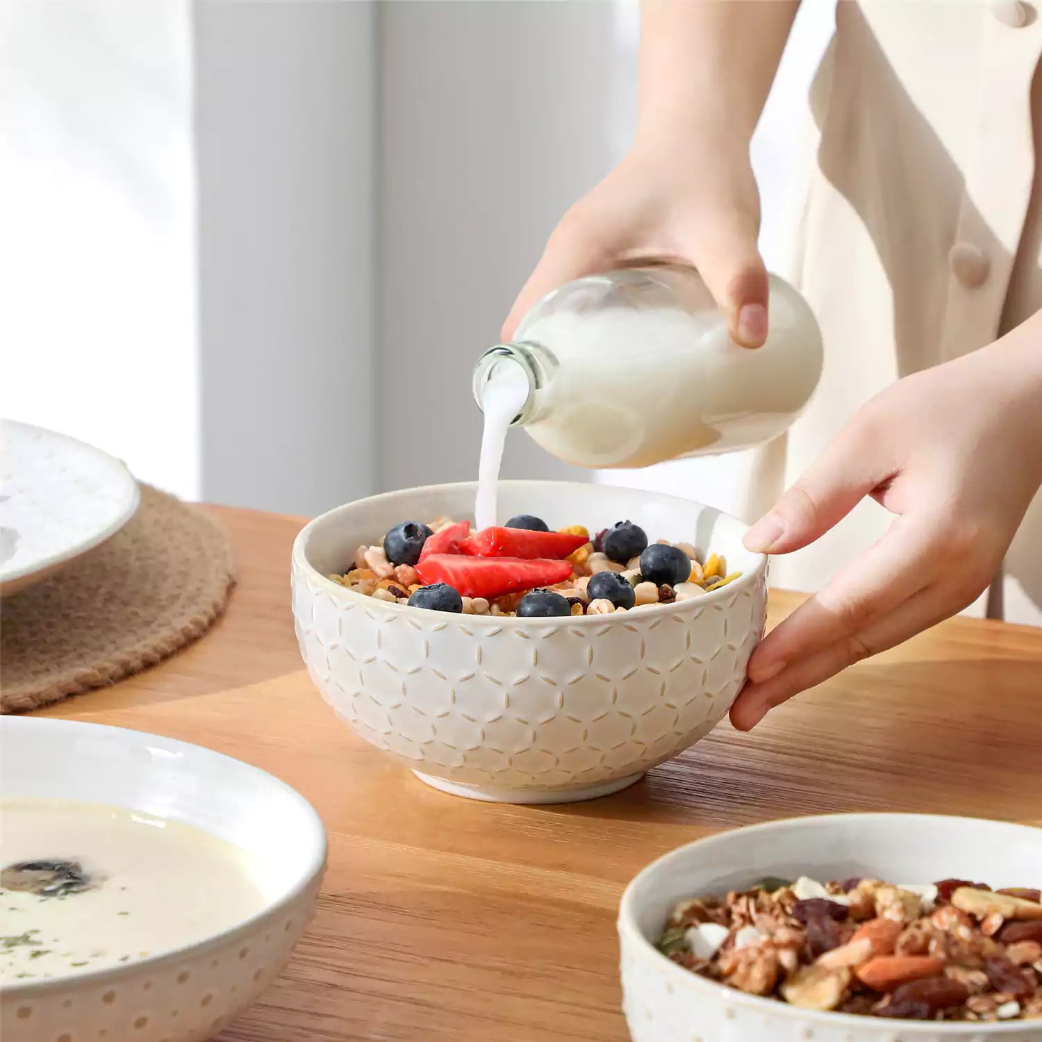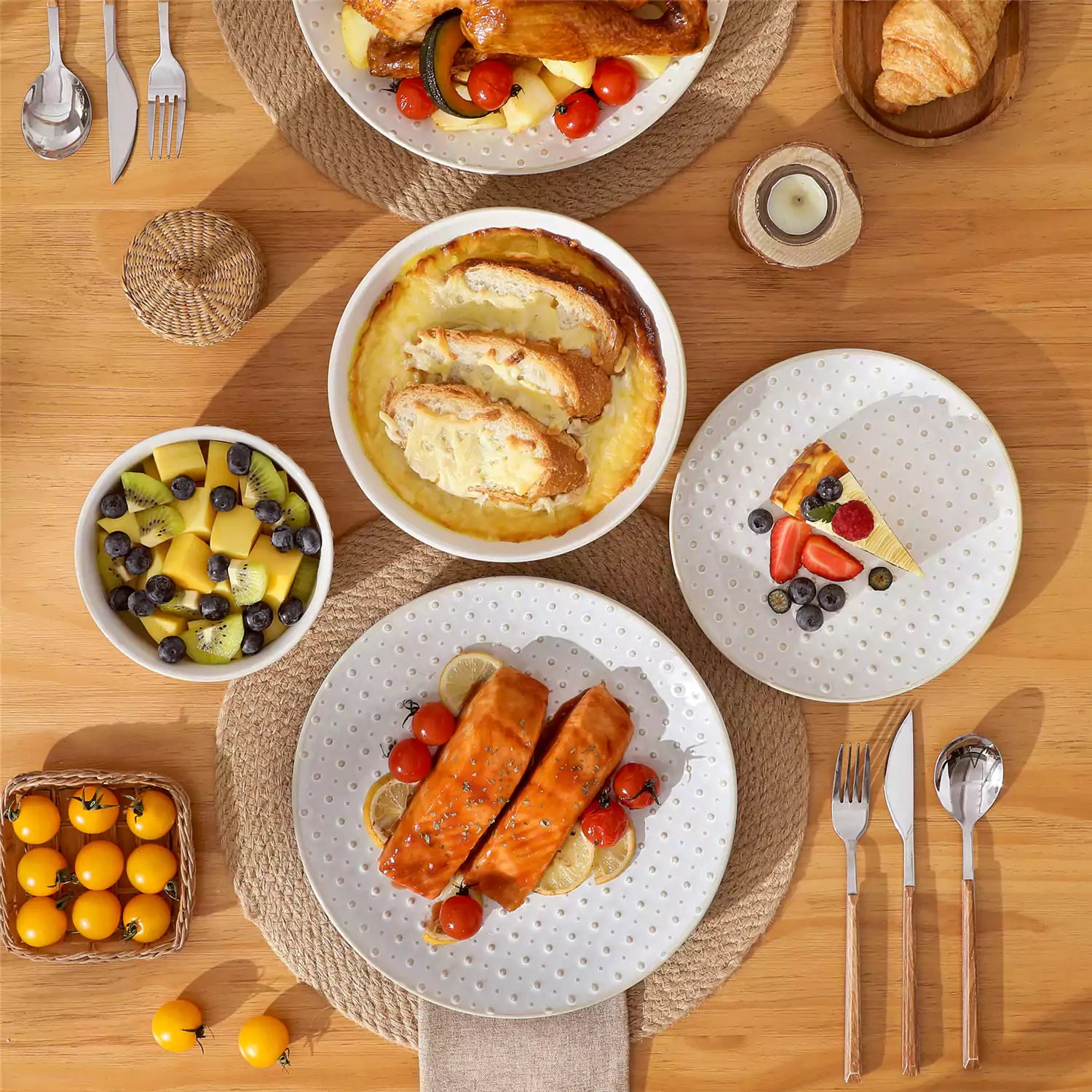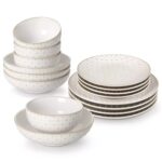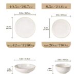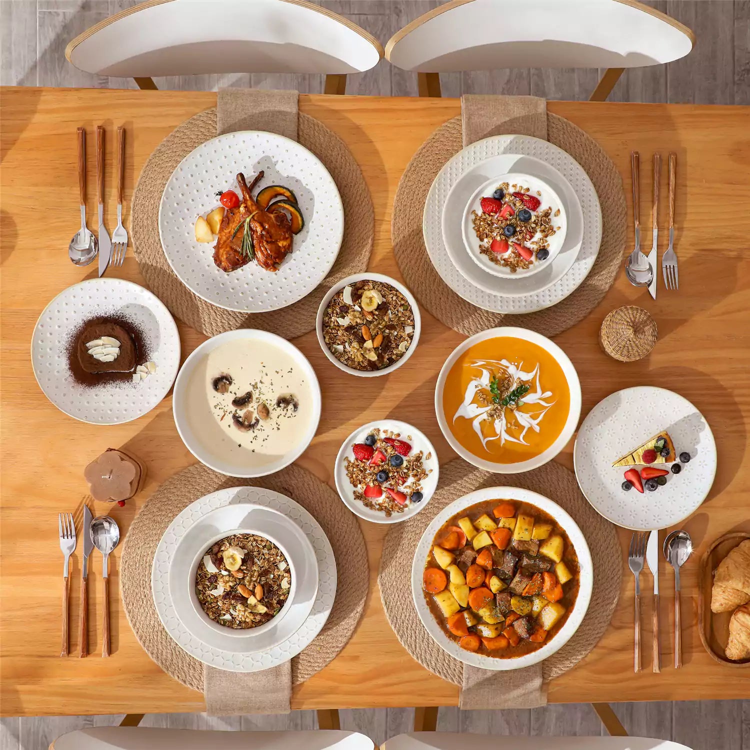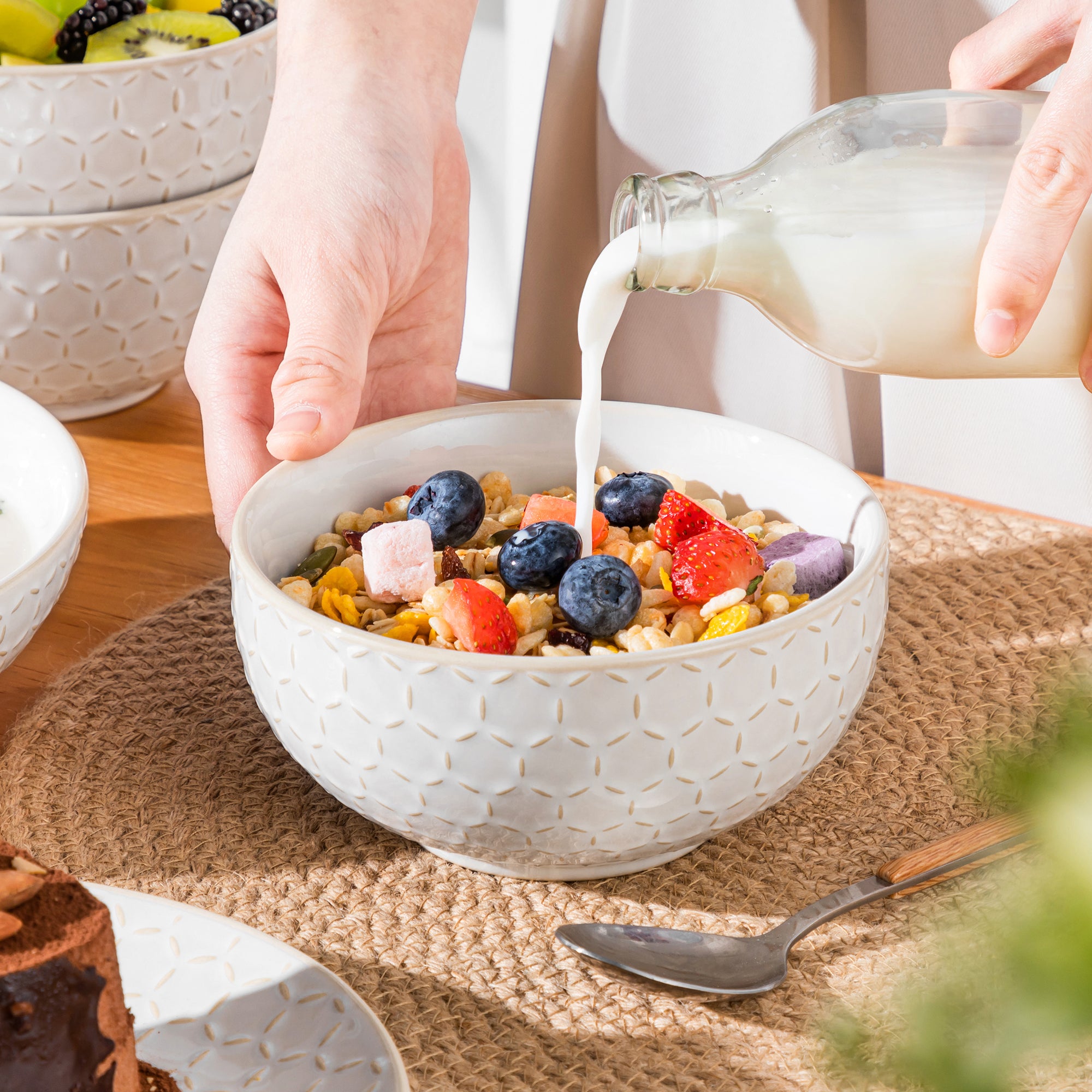 Lydia 16-Piece Stoneware Dinnerware Set in soft antique white features assorted embossed patterns—textured dots, vintage diamond reliefs, daisy floral accents, and hexagonal weaves. Crafted from durable stoneware and finished with a reactive glaze, each piece displays subtle tonal variations and handcrafted charm. The set includes 4 dinner plates, 4 salad plates, 4 soup plates, and 4 cereal bowls—microwave, oven, and dishwasher safe for effortless everyday use.