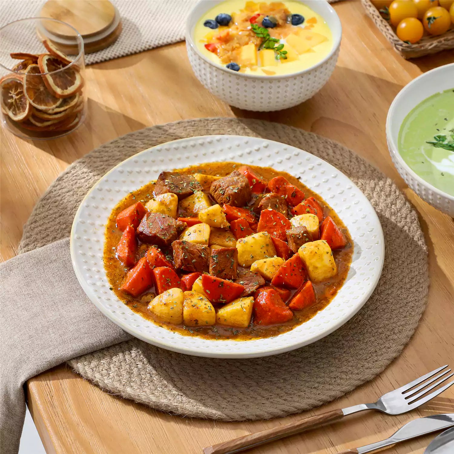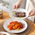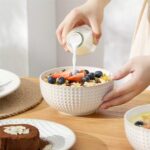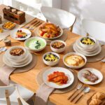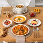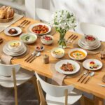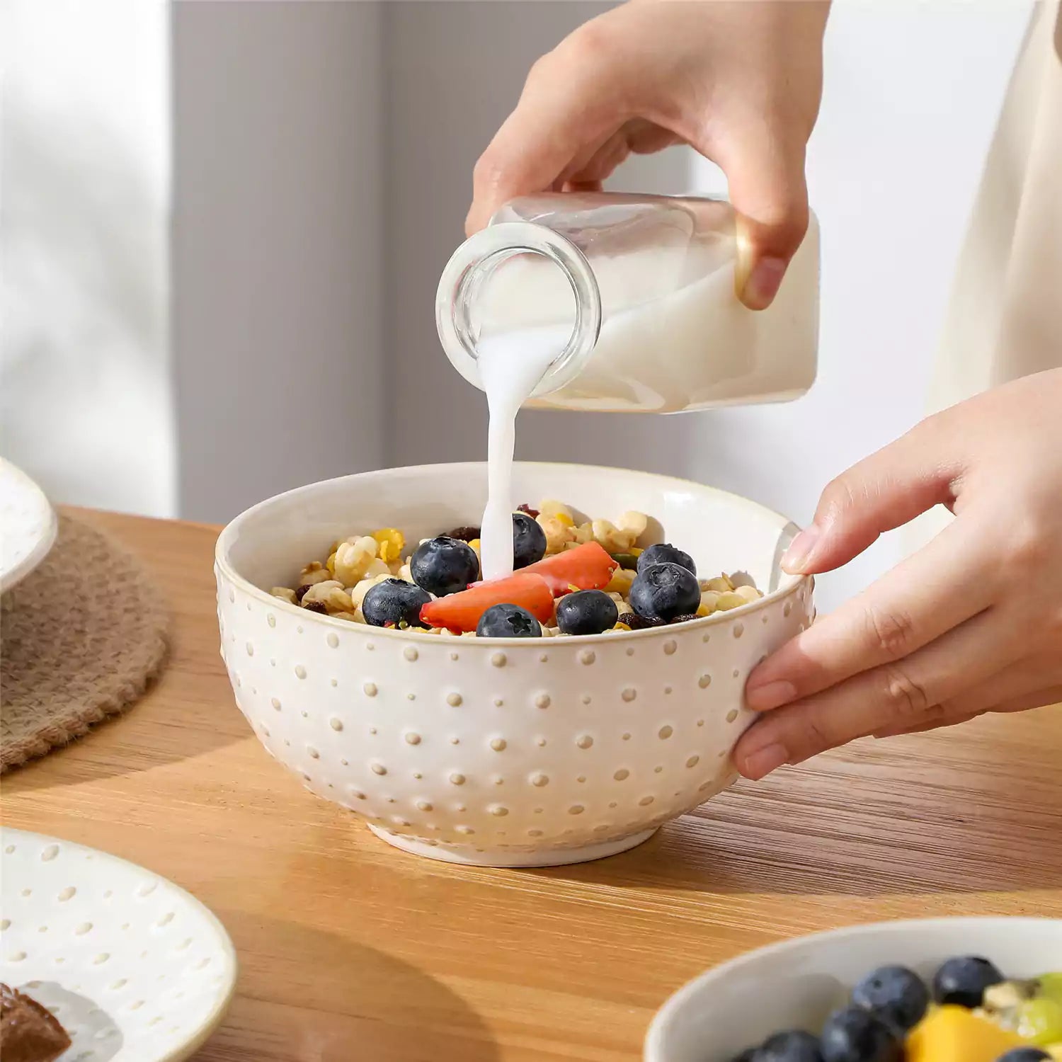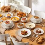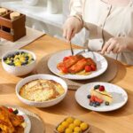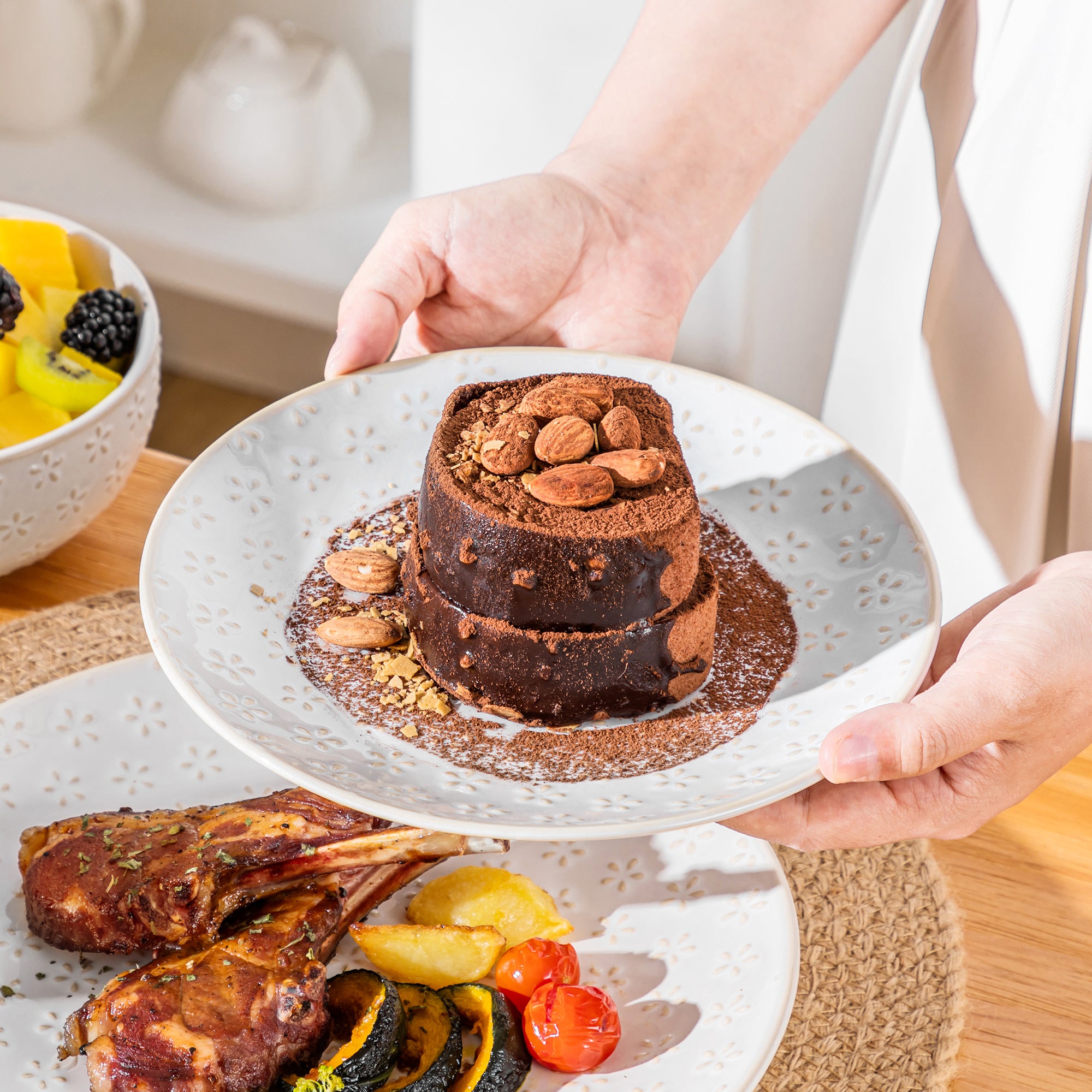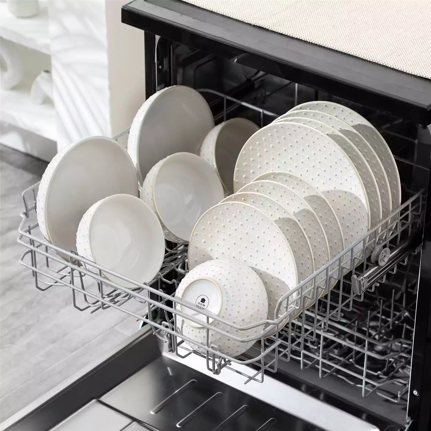 Lydia 16-Piece Stoneware Dinnerware Set in soft antique white features assorted embossed patterns—textured dots, vintage diamond reliefs, daisy floral accents, and hexagonal weaves. Crafted from durable stoneware and finished with a reactive glaze, each piece displays subtle tonal variations and handcrafted charm. The set includes 4 dinner plates, 4 salad plates, 4 soup plates, and 4 cereal bowls—microwave, oven, and dishwasher safe for effortless everyday use.