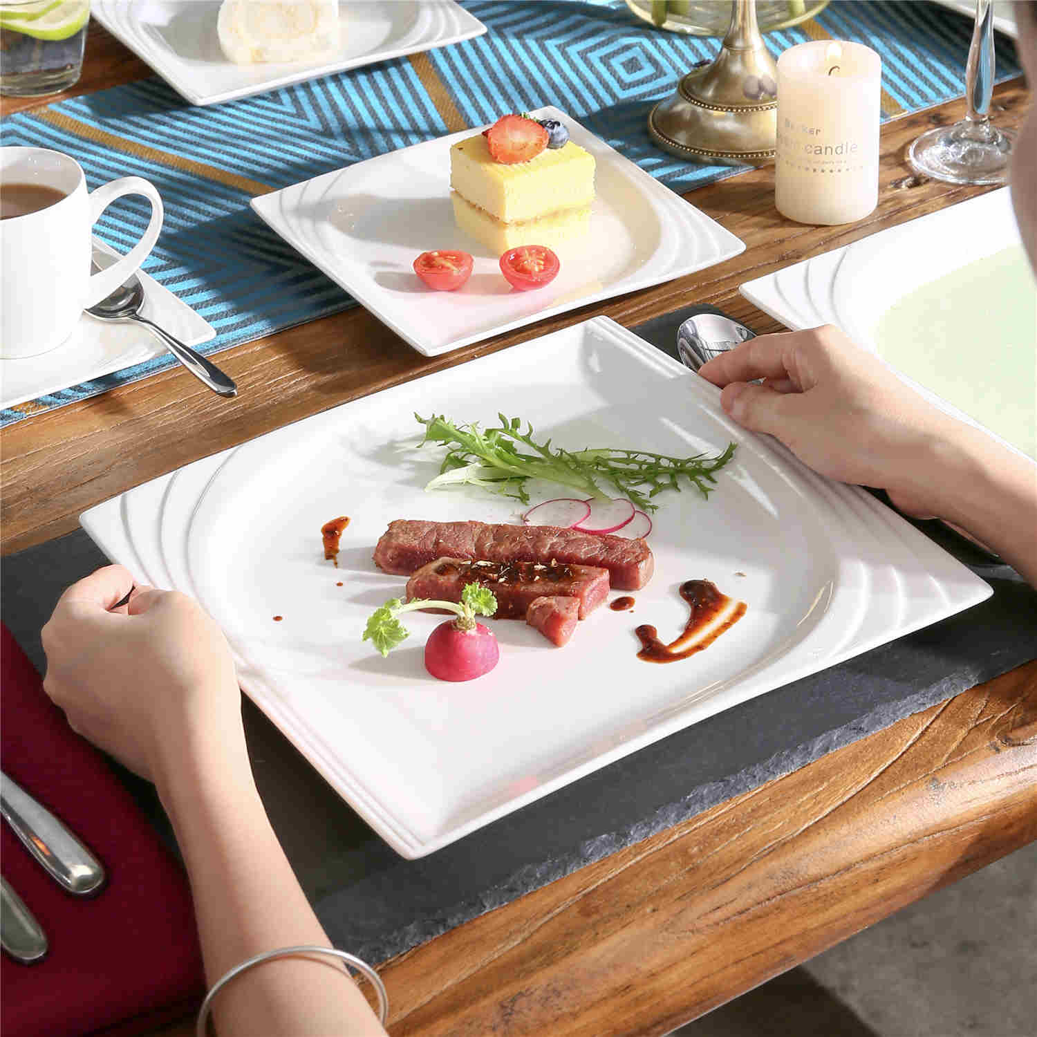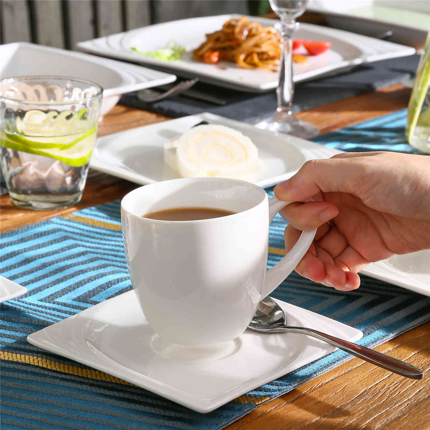 This 30-piece dinnerware set combines modern geometric lines with soft curves, featuring sleek textured rims. The set includes dinner plates, dessert plates, soup plates, cups, and saucers, serving up to 6 guests. Crafted from high-temperature fired porcelain, it’s durable, scratch-resistant, and safe for the oven, microwave, and dishwasher. The stackable design ensures easy storage, while the clean white finish complements any table setting.