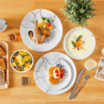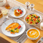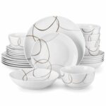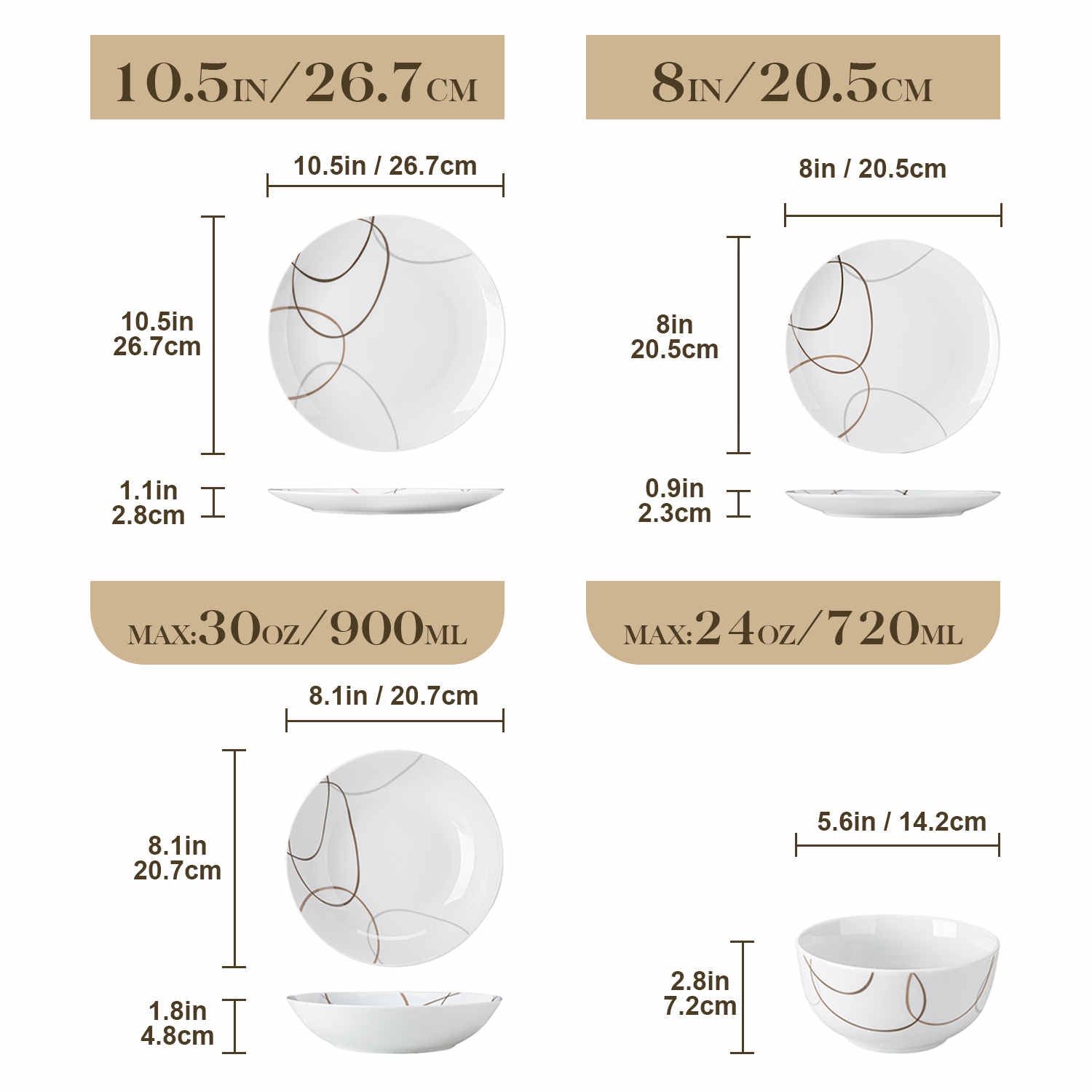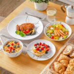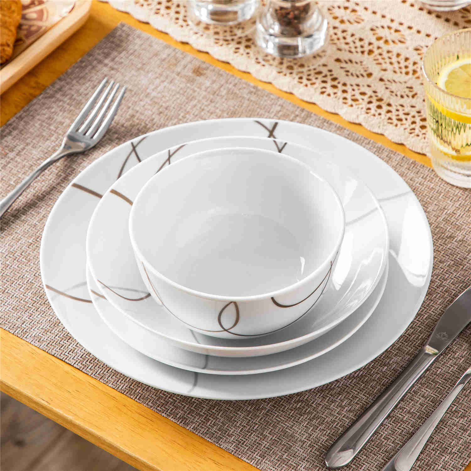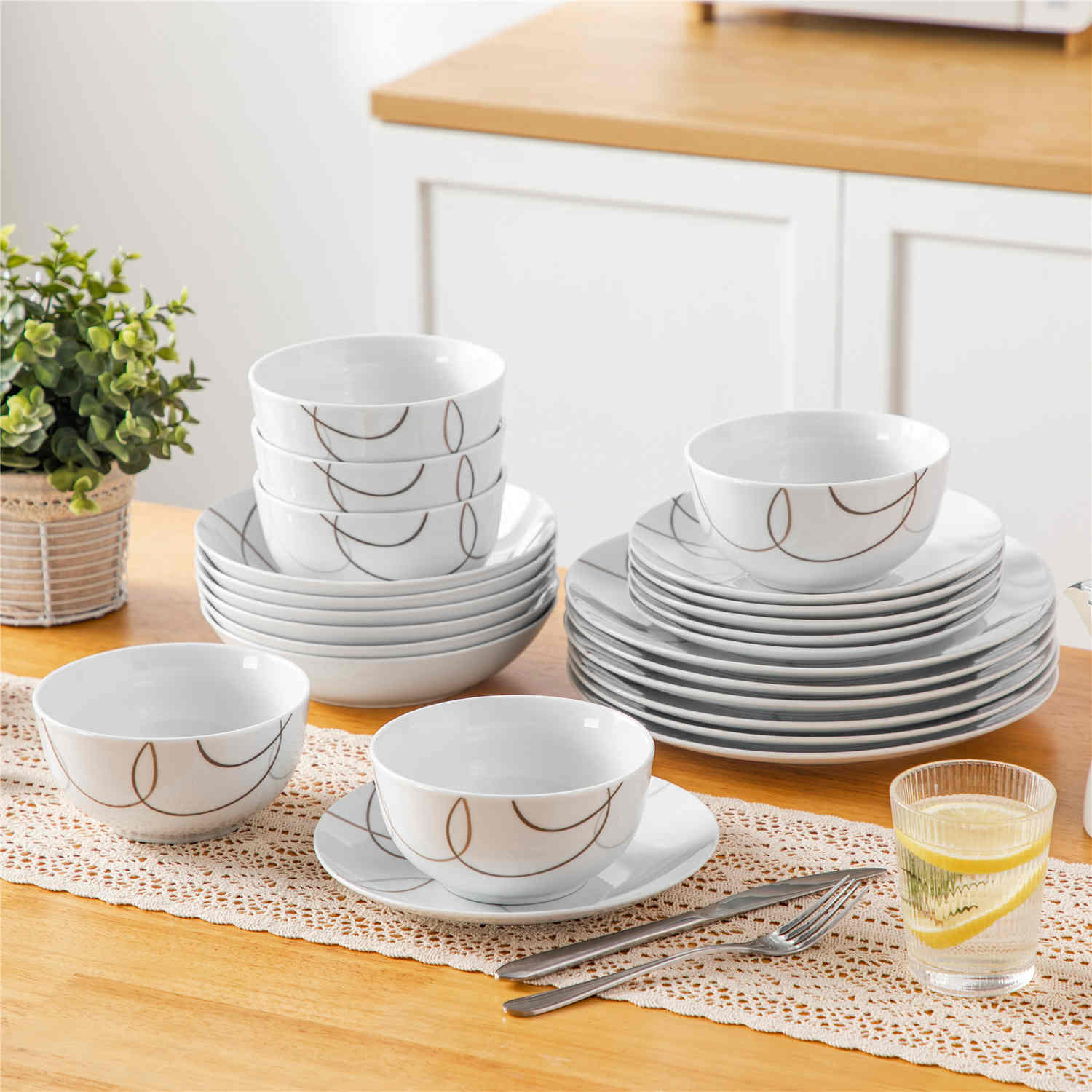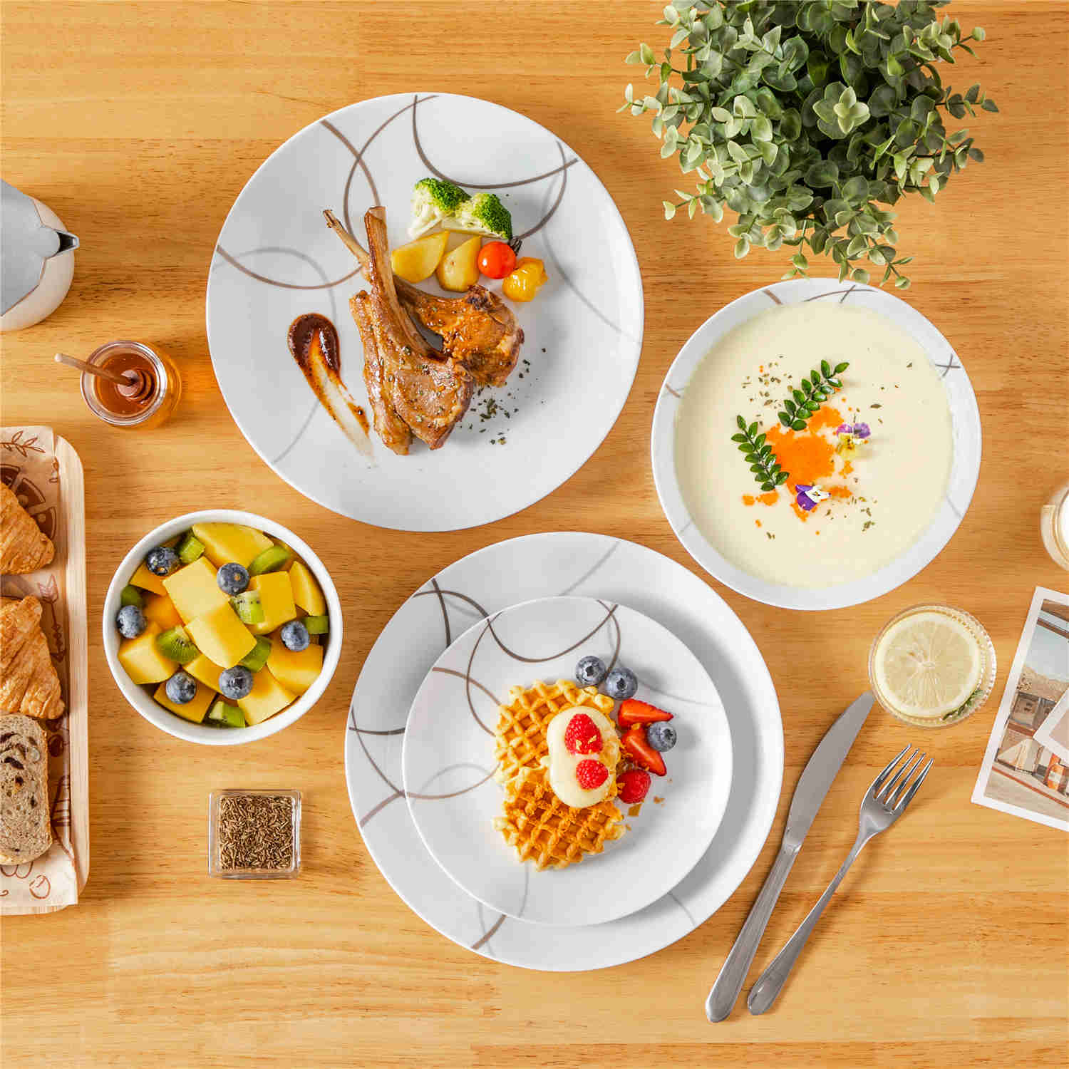 The Nikita 24-Piece Dinnerware Set combines classic charm with modern sophistication. Crafted from premium porcelain, its round shape and off-white glaze with delicate clay-hued lines bring a rustic yet refined touch to any dining setting. Designed for six, this set includes 6 dinner plates, 6 salad plates, 6 cereal bowls, and 6 soup plates—ideal for family meals or entertaining. Stackable for space-saving storage, it features a non-porous, oil-resistant finish and is microwave, oven, and dishwasher safe, making it perfect for both everyday use and special occasions.