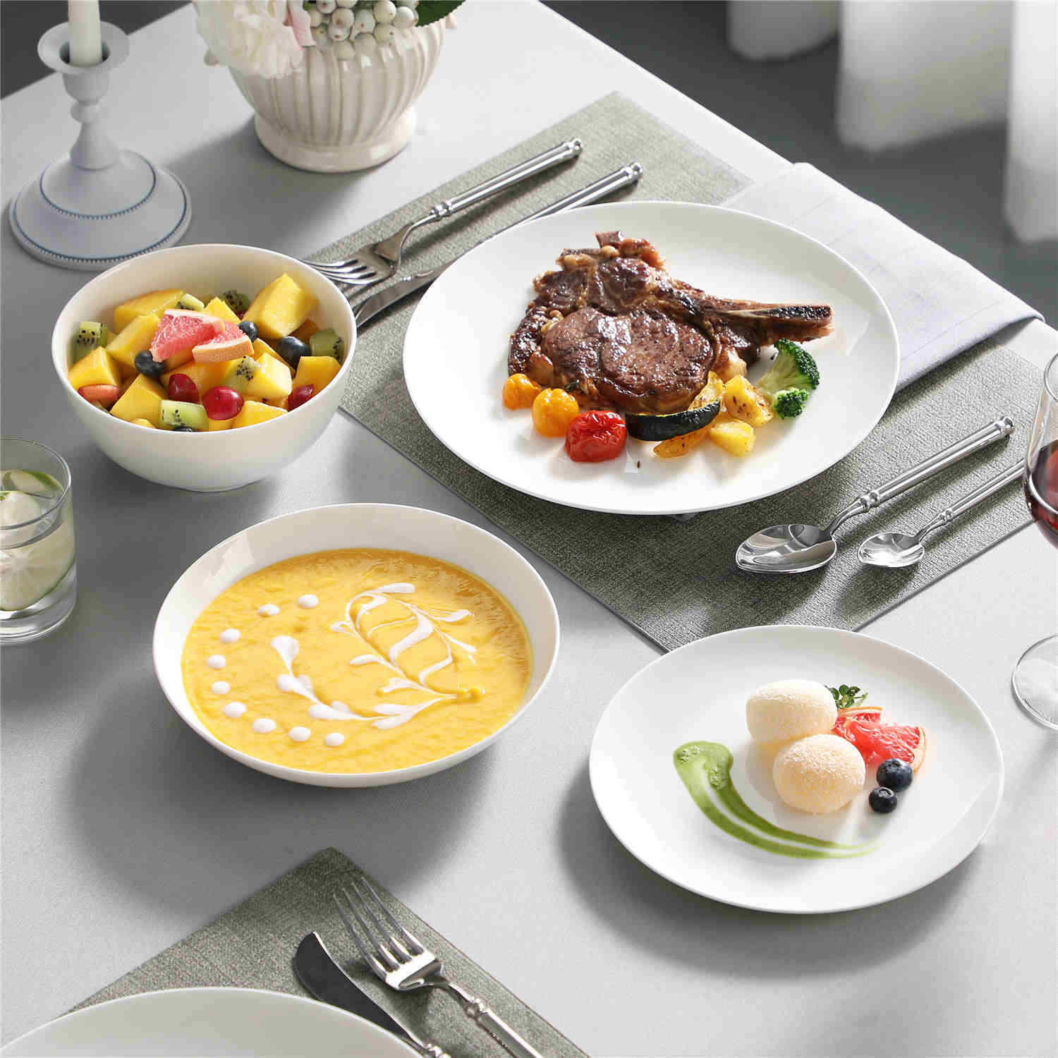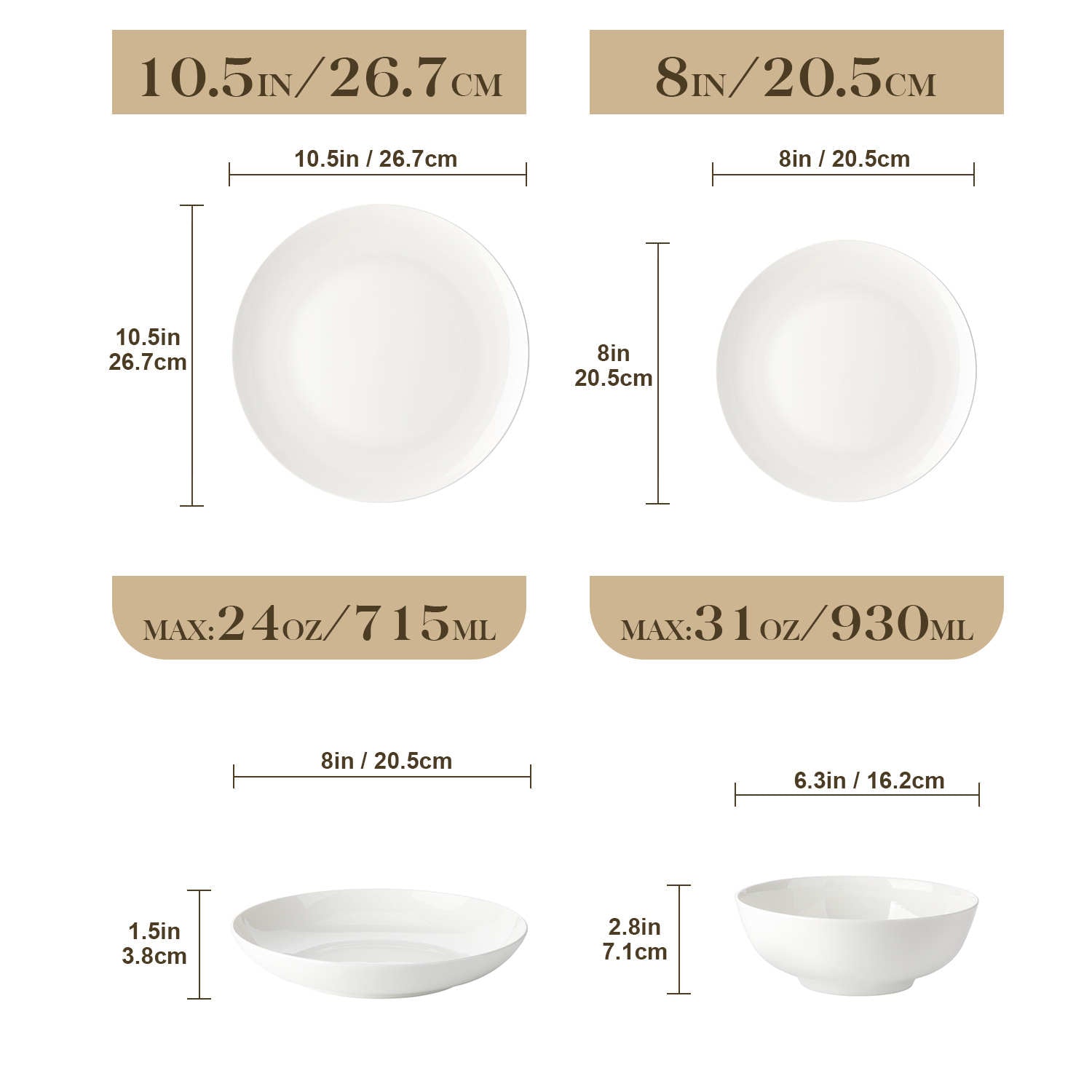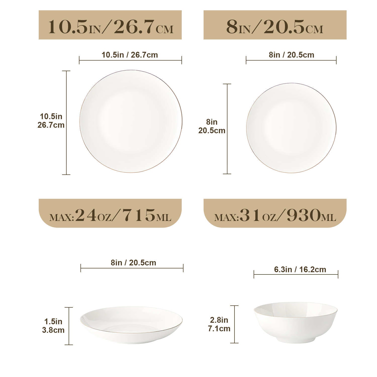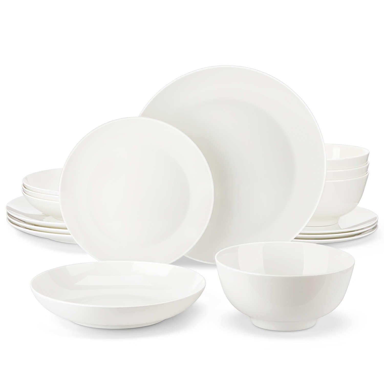 - Fine bone china round dinnerware set, service for 4