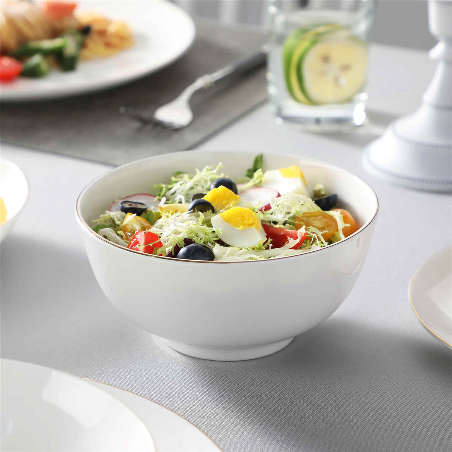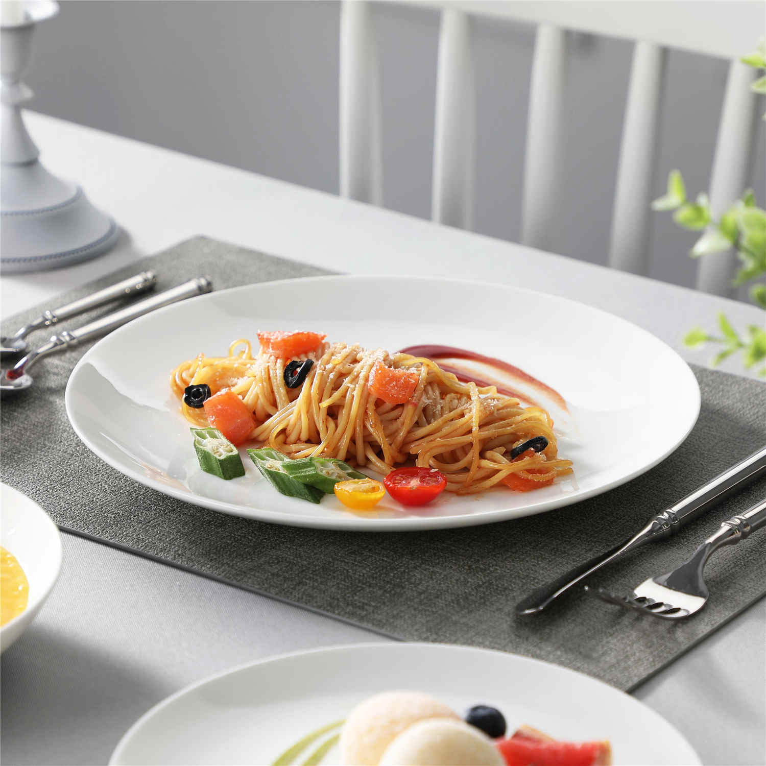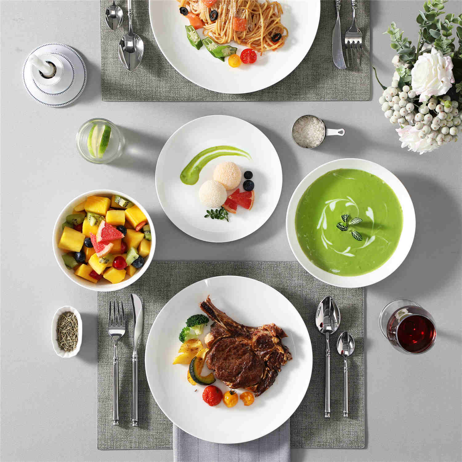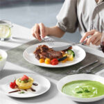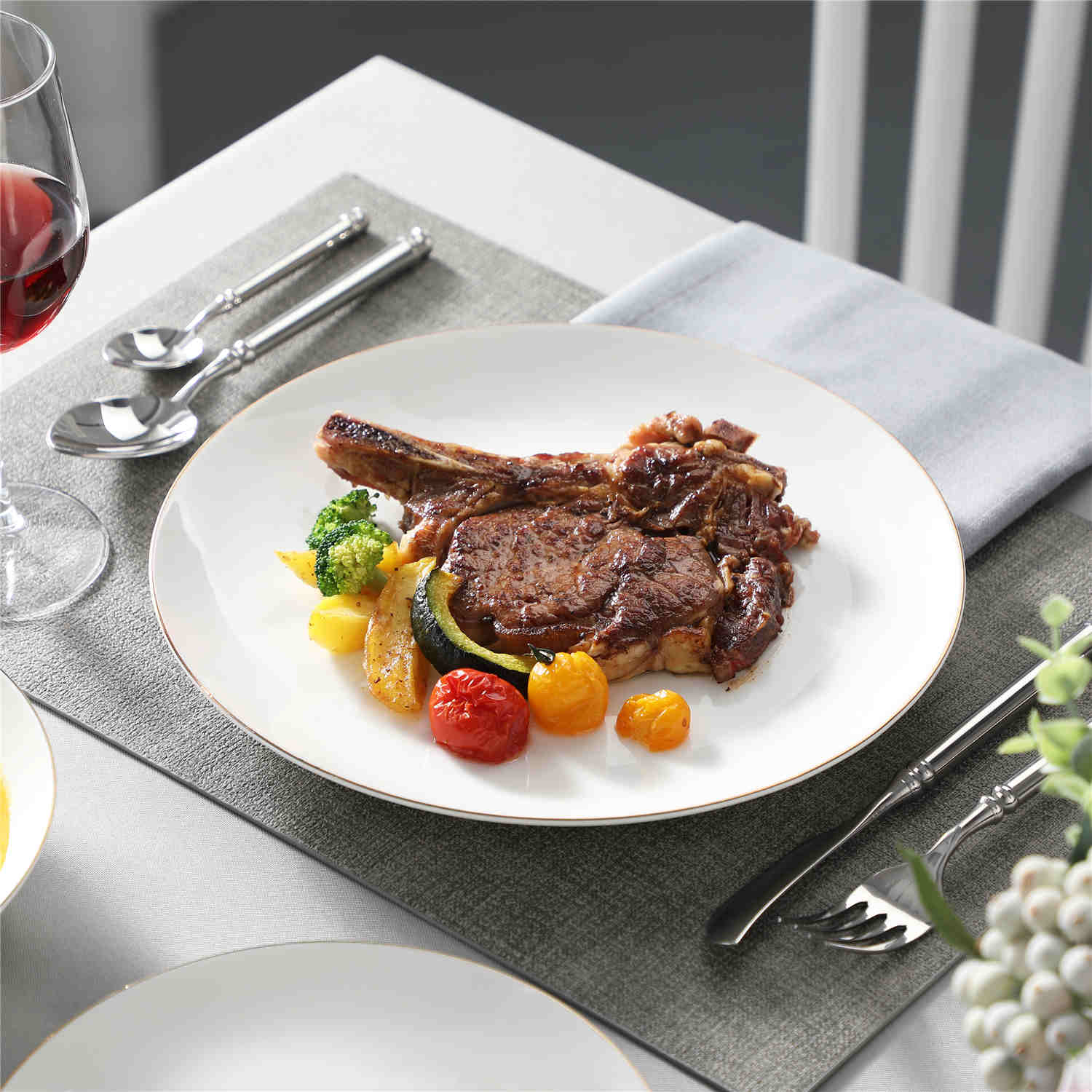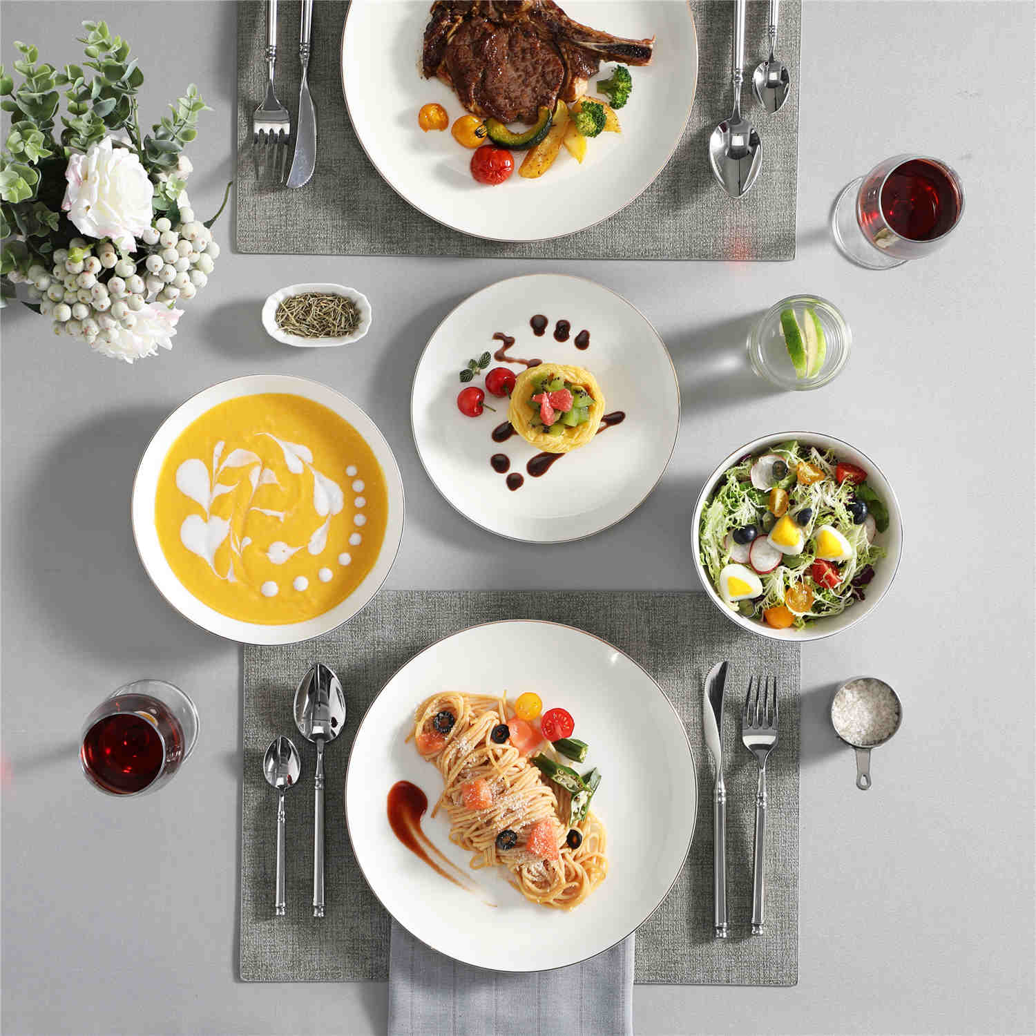 - Fine bone china round dinnerware set, service for 4