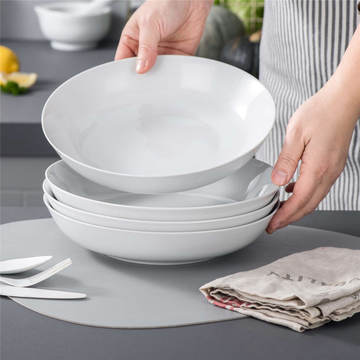 This set of four 40 oz off-white pasta bowls, with their low, wide design, is perfect for serving dishes like spaghetti, fettuccine, and salads. The modern look enhances any meal, whether for family dinners or entertaining. Made from non-toxic porcelain, they are microwave, oven, and dishwasher safe for easy cleaning. Ideal for both everyday use and special occasions.