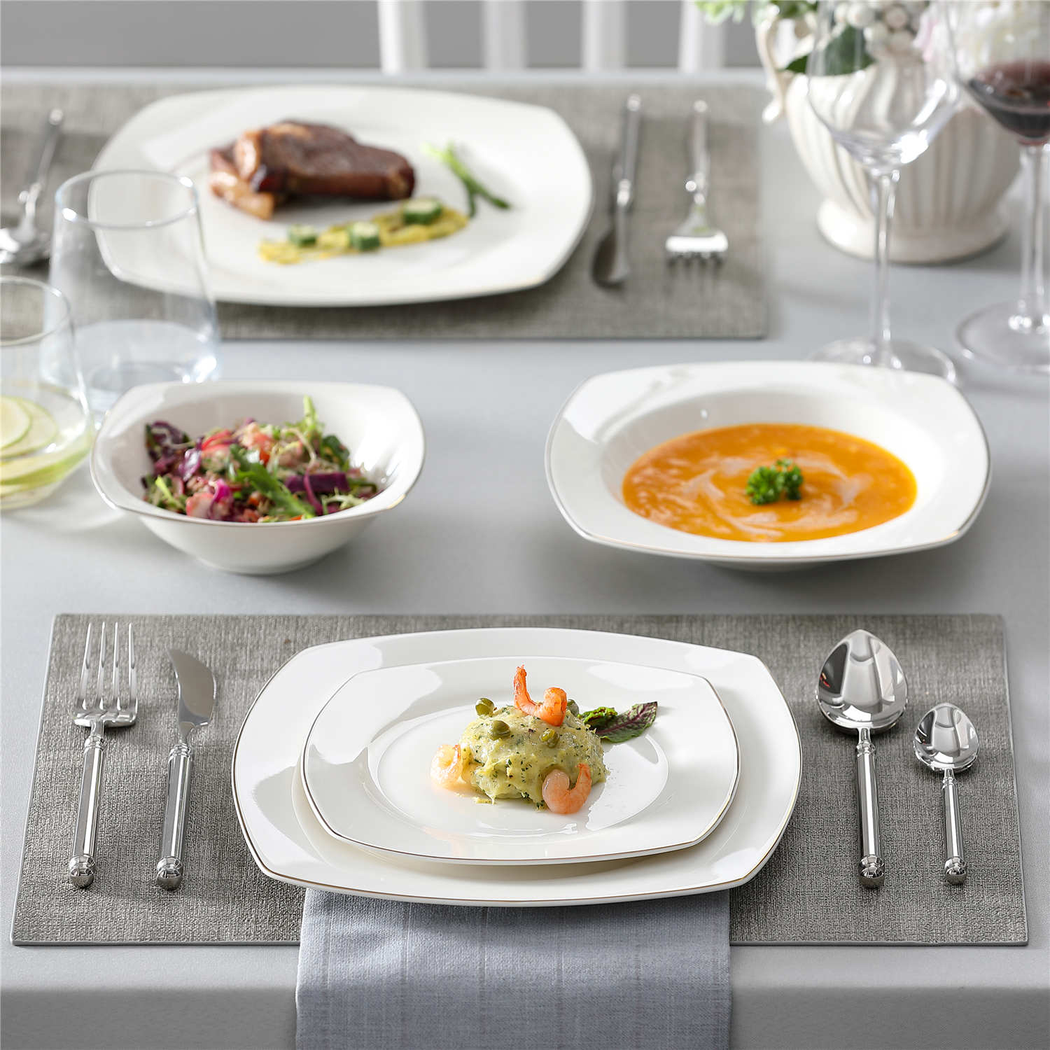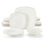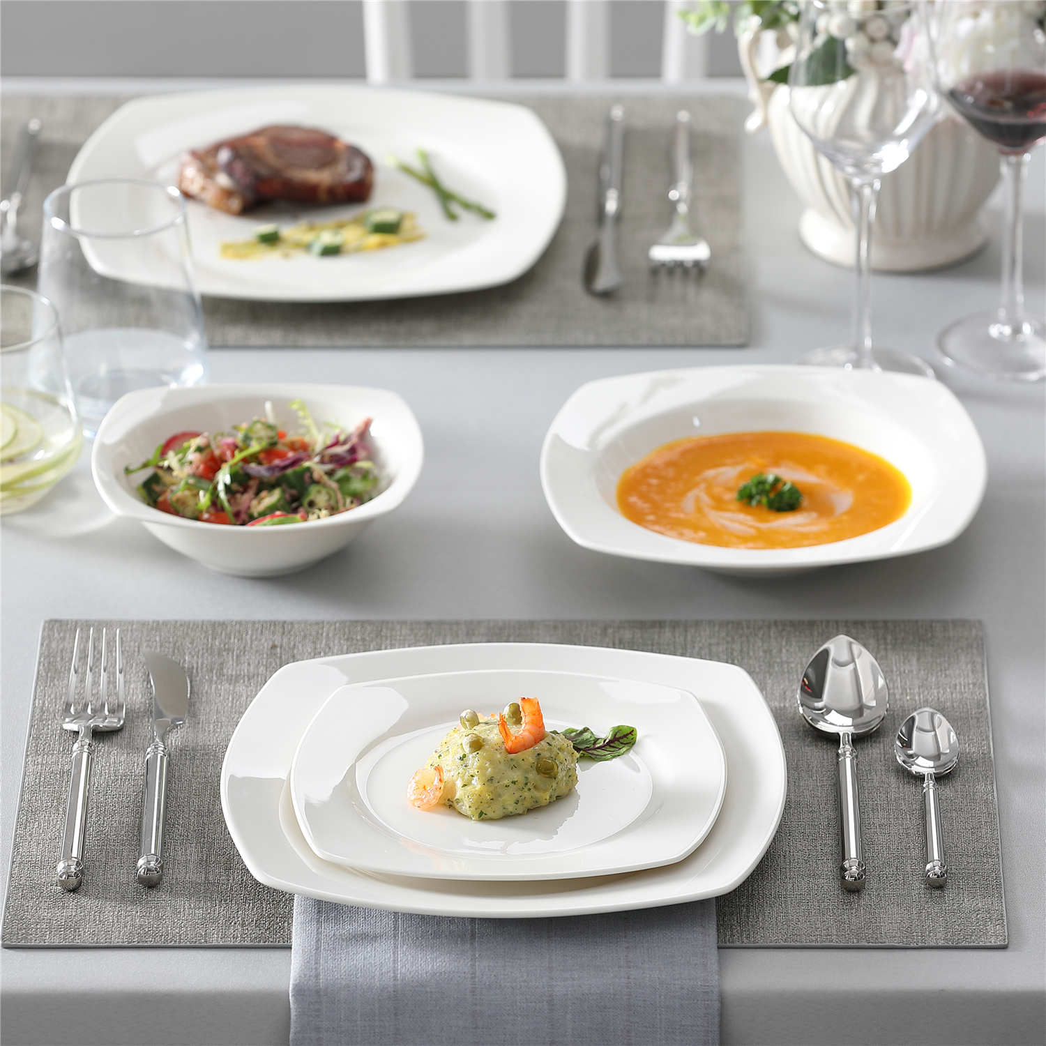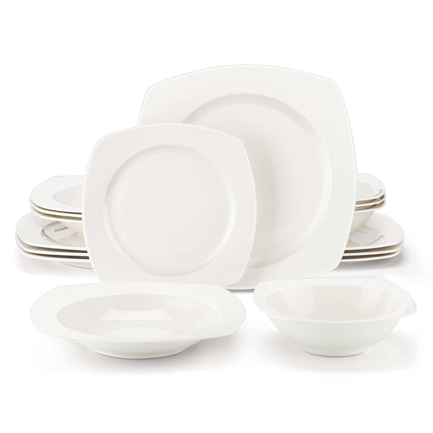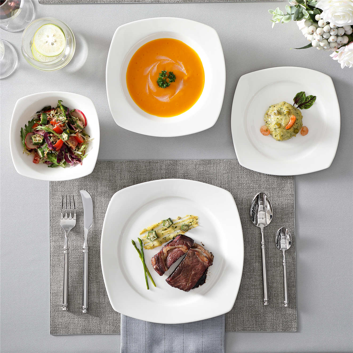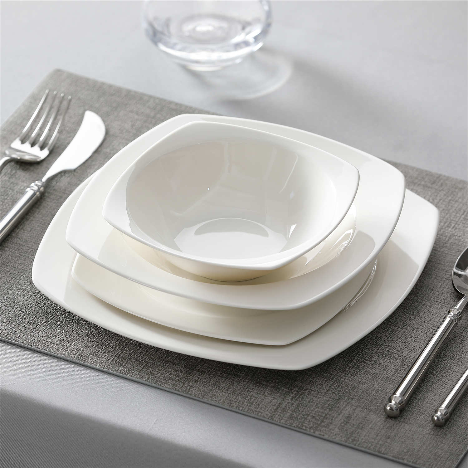 - Bone china square dinnerware set, service for 4