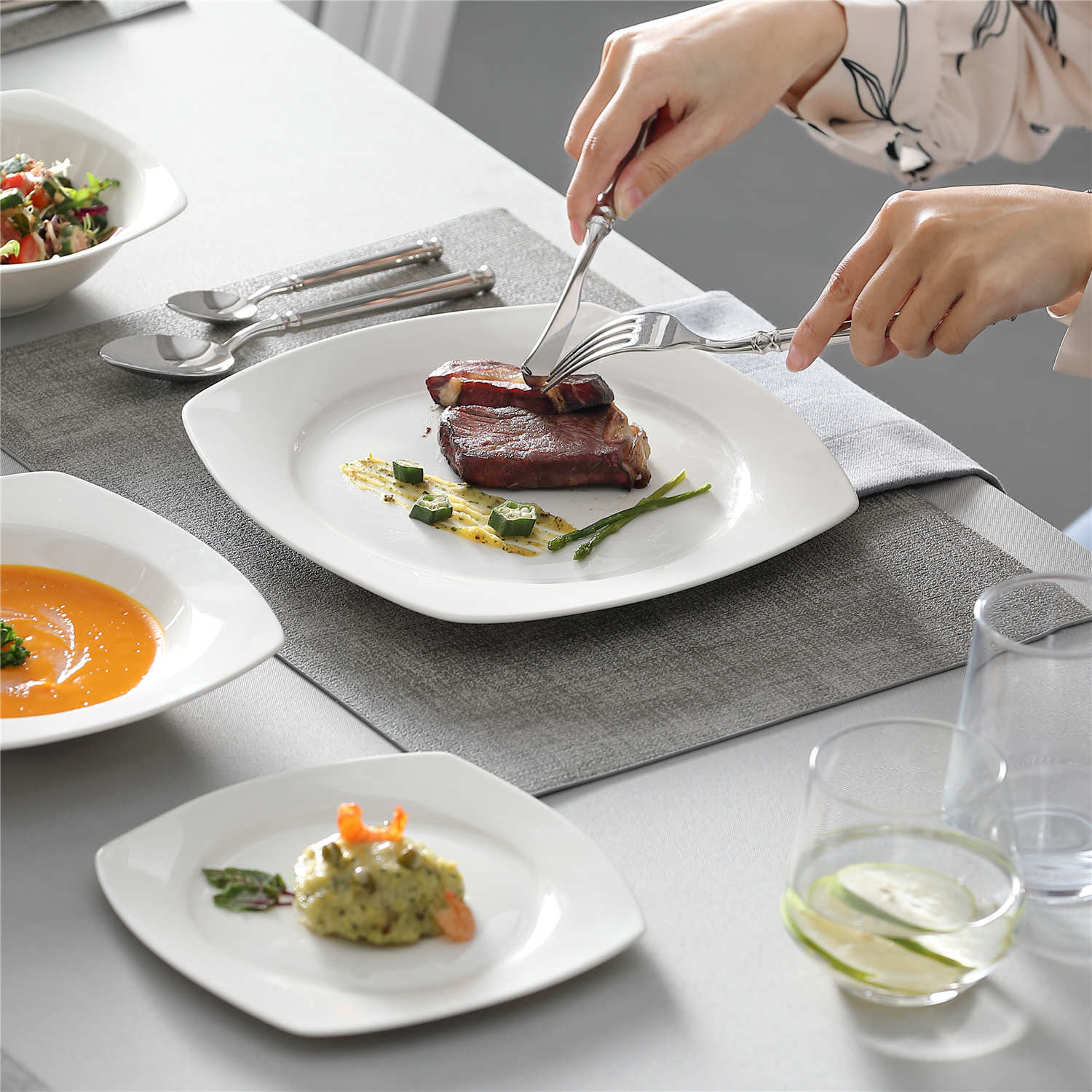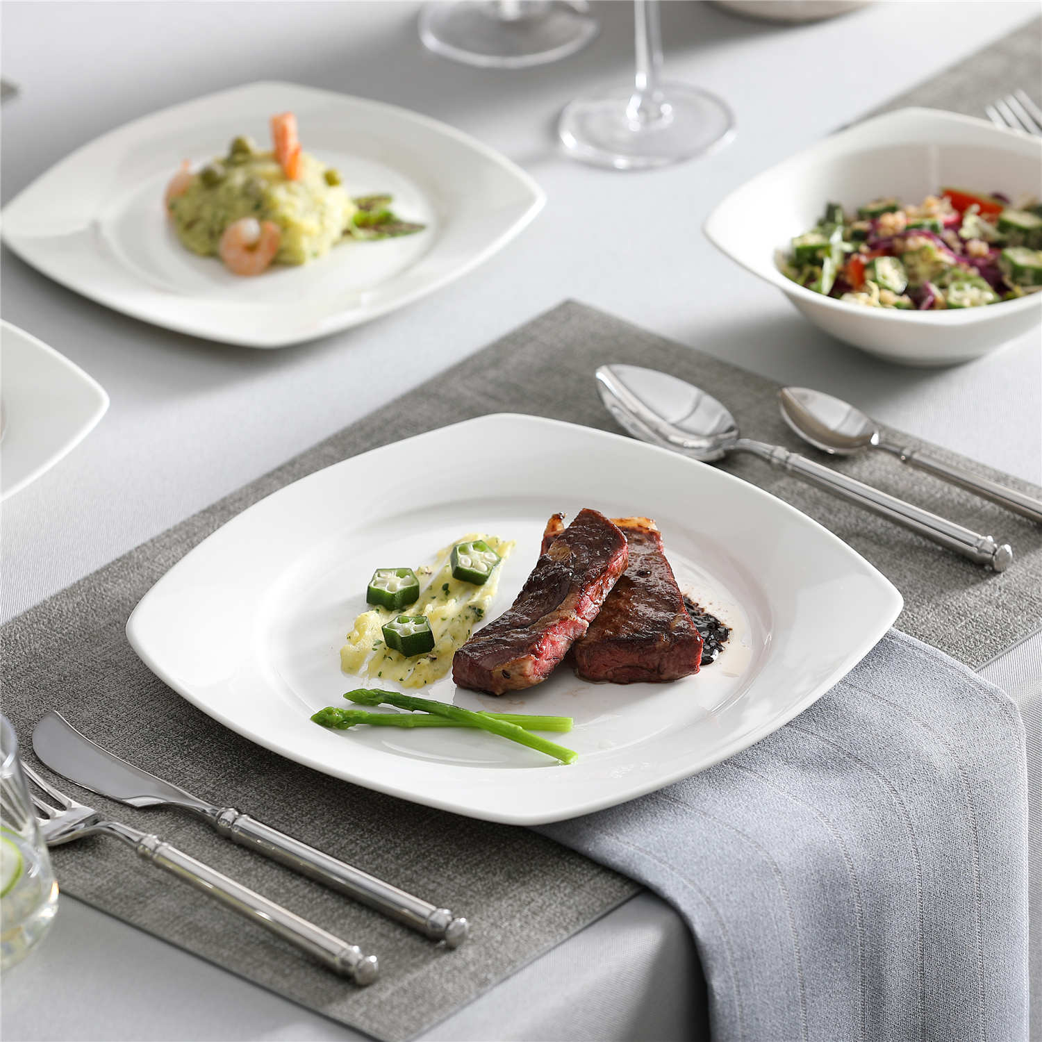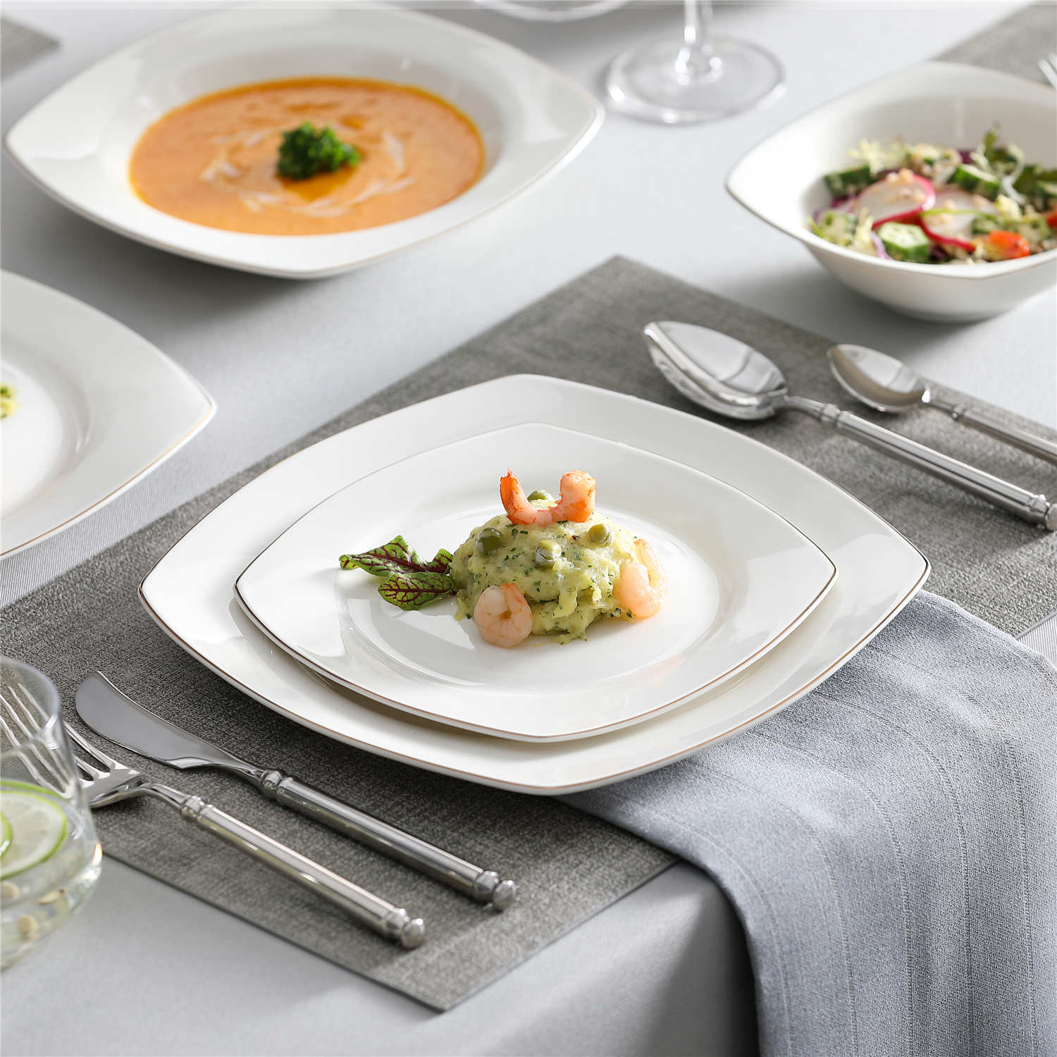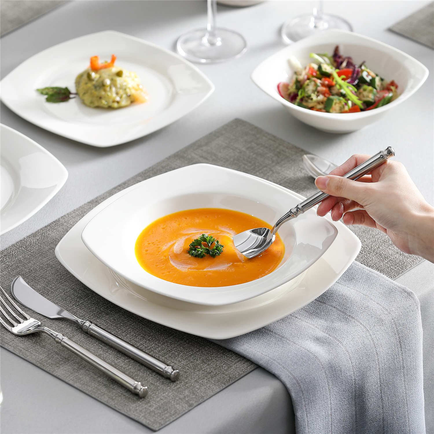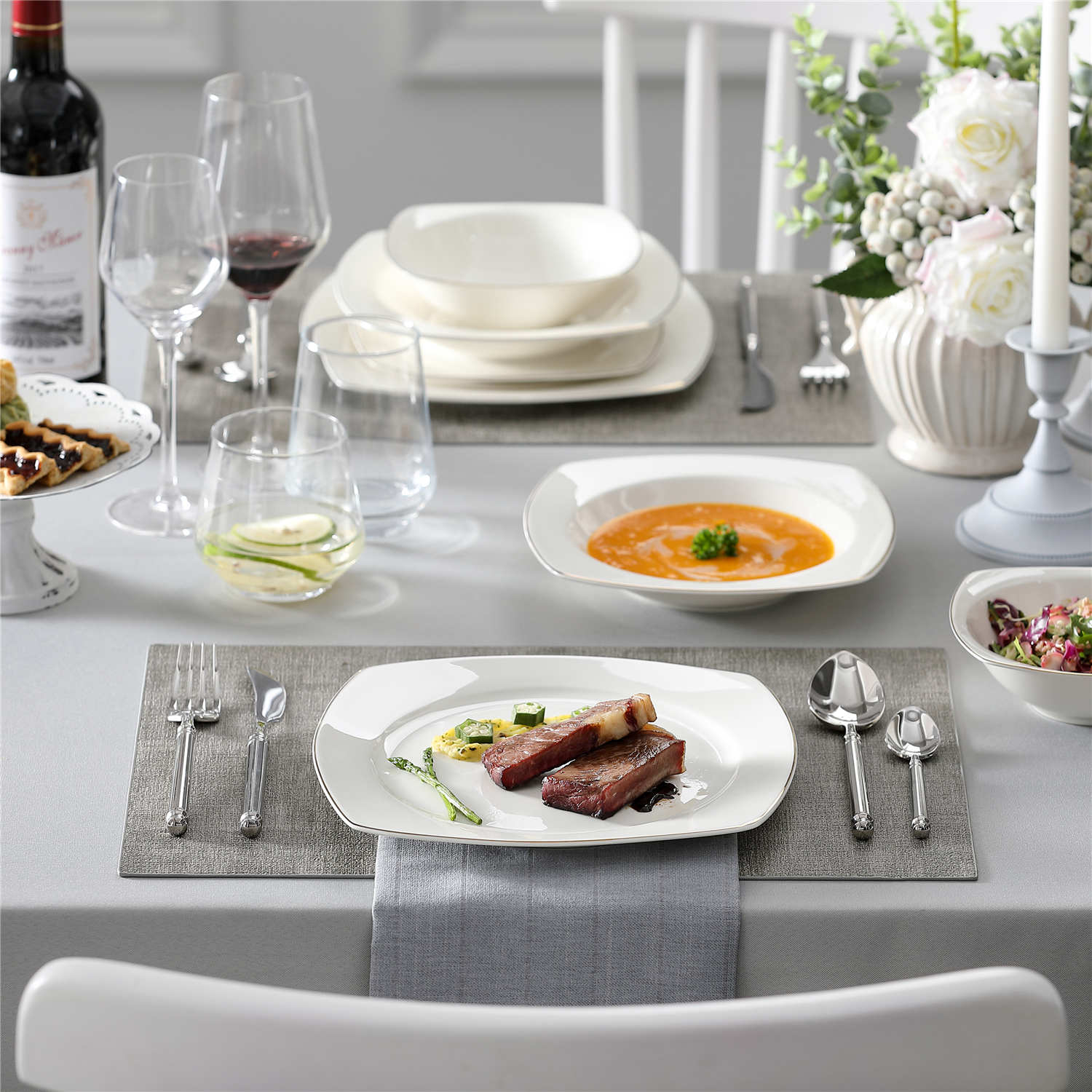 - Bone china square dinnerware set, service for 4