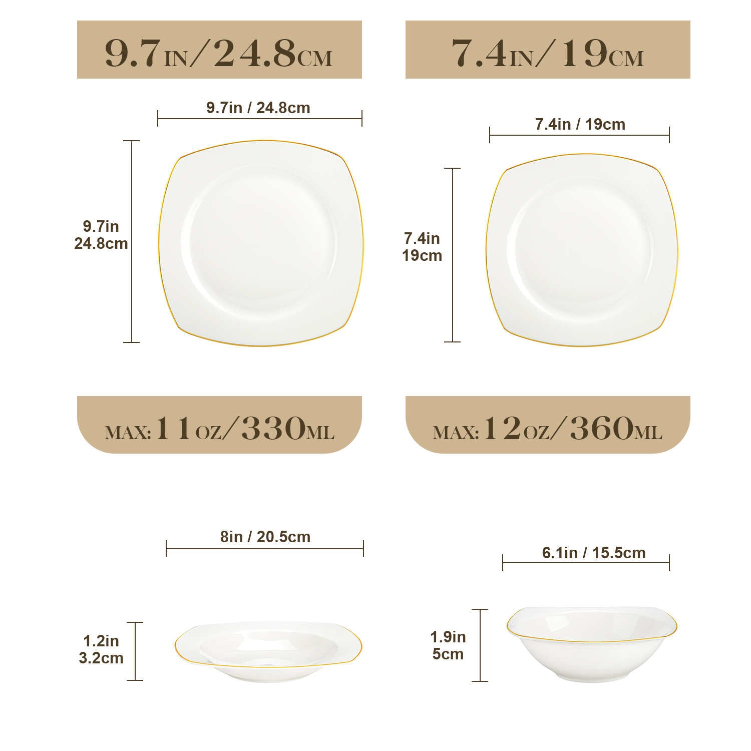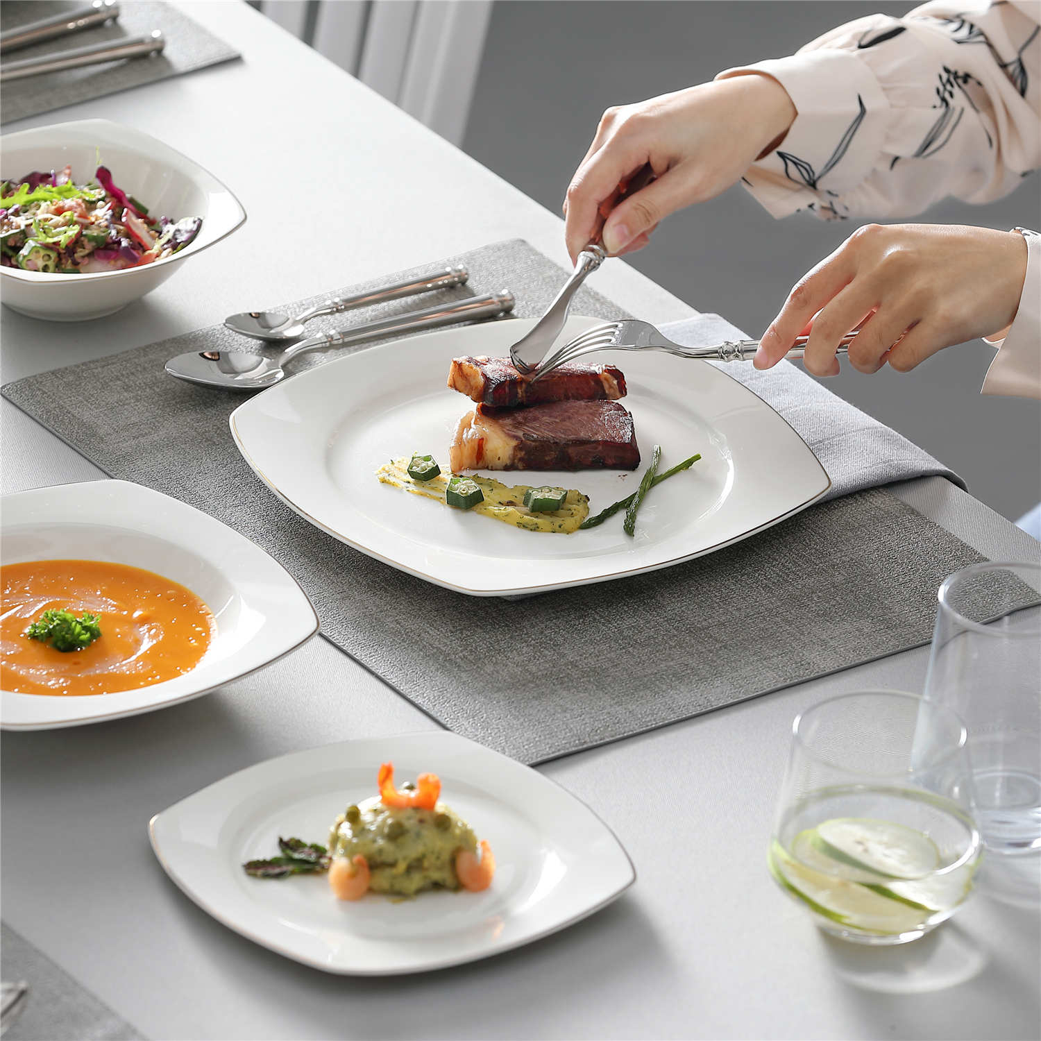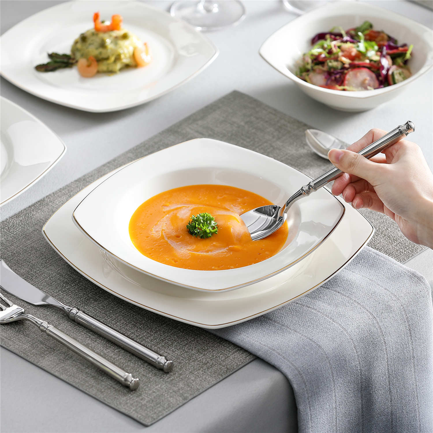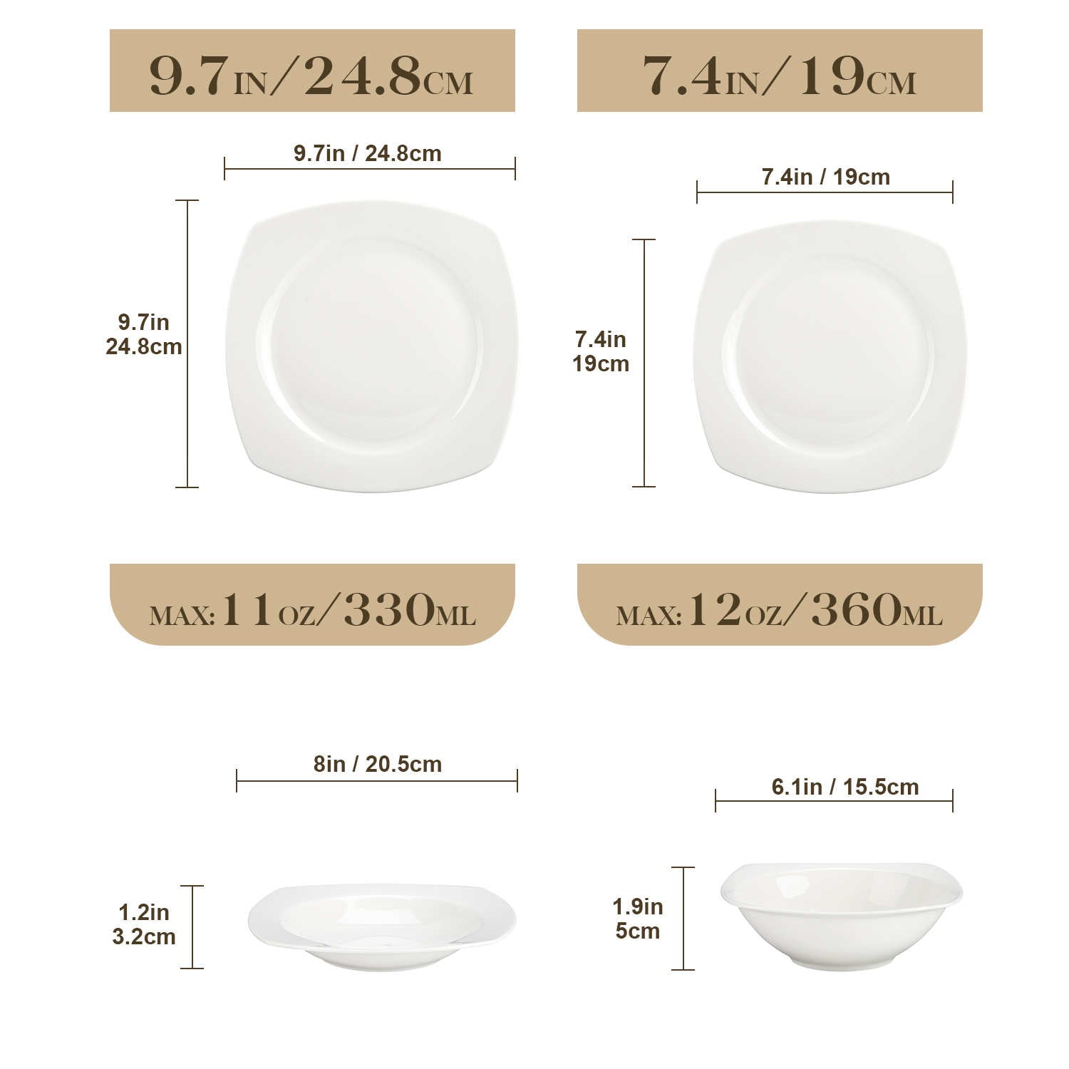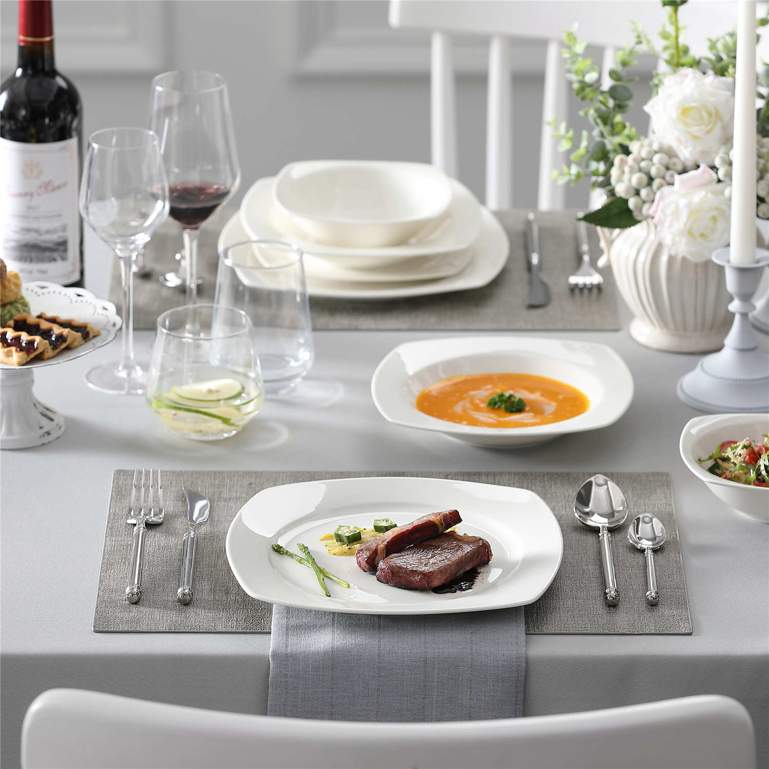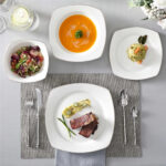 - Bone china square dinnerware set, service for 4