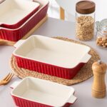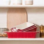 Bold and festive, this red porcelain baking set is made to stand out—perfect for holiday feasts, family gatherings, or any dish that deserves a little drama. The vivid red exterior contrasts beautifully with the creamy interior, making your meals look as delicious as they taste. From bubbling baked pasta to roast chicken and hearty vegetables, these four stackable trays (14.7″ to 9.4″) bring both style and versatility to your kitchen. The fluted edges and wavy handles add character, while the scratch- and chip-resistant finish ensures lasting use in the oven, microwave, or dishwasher.