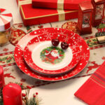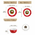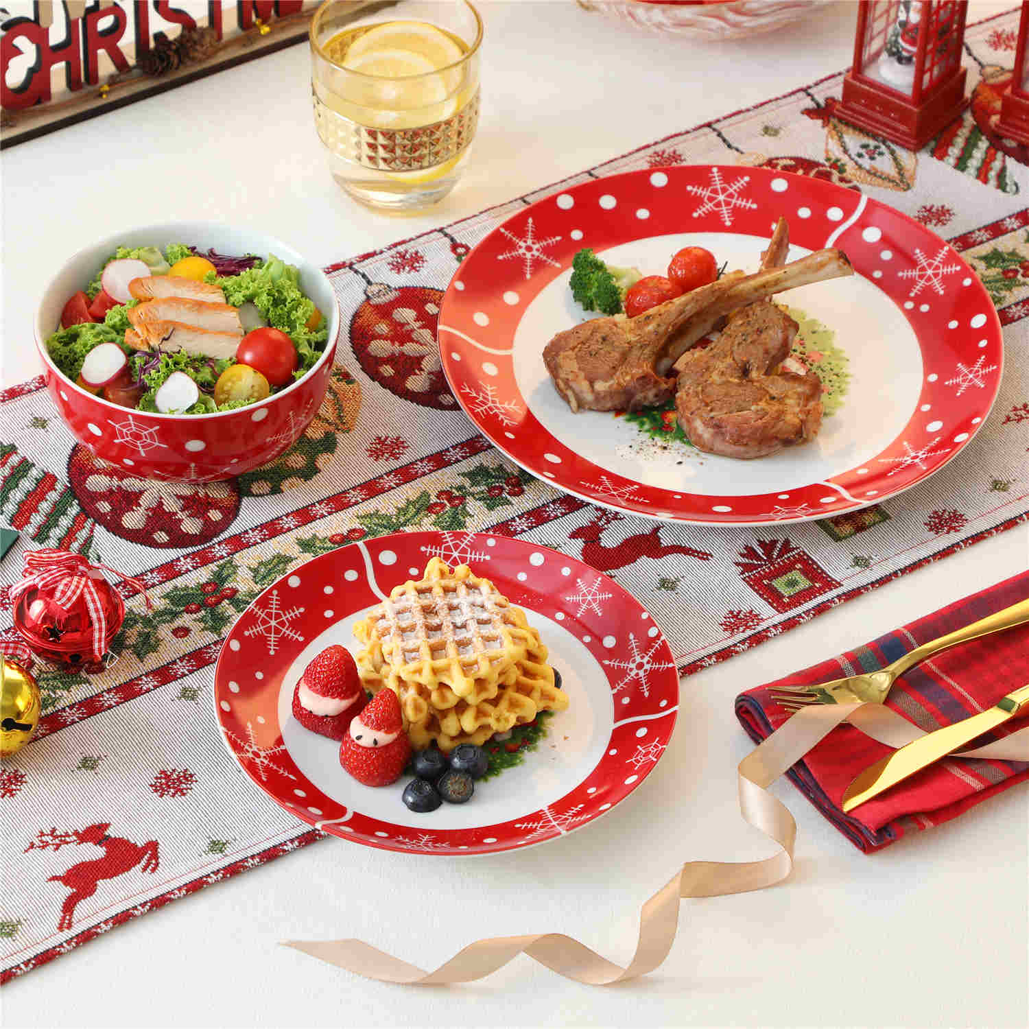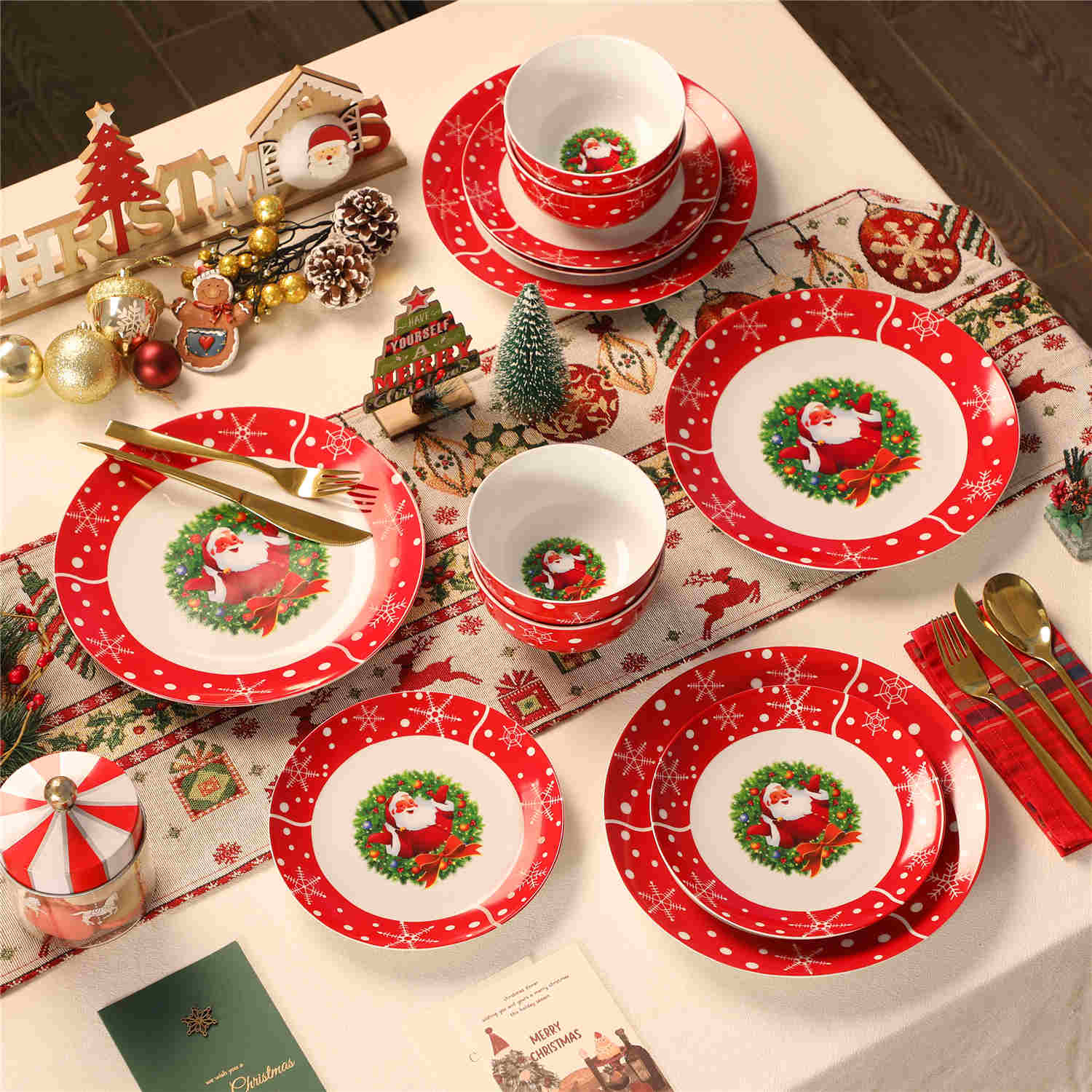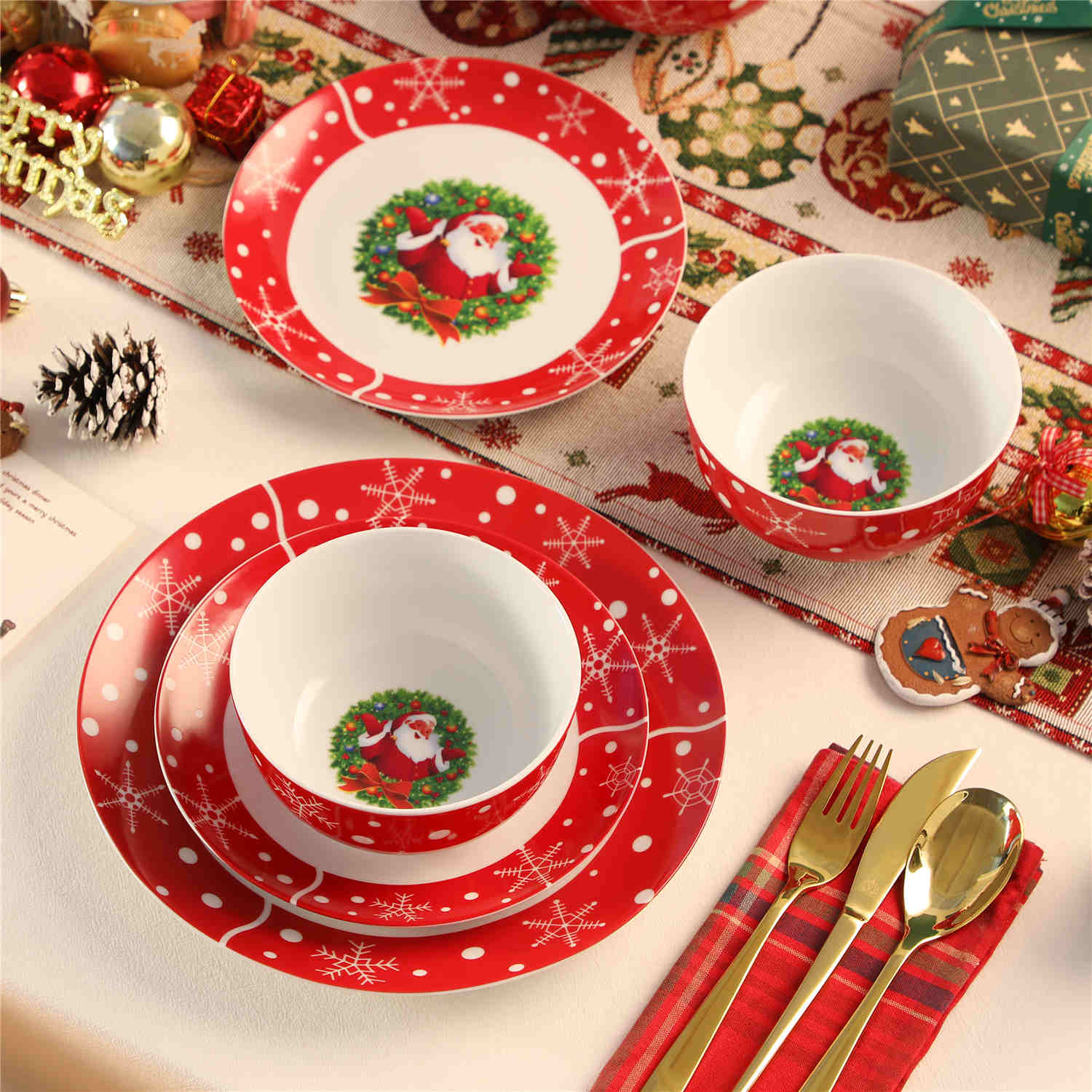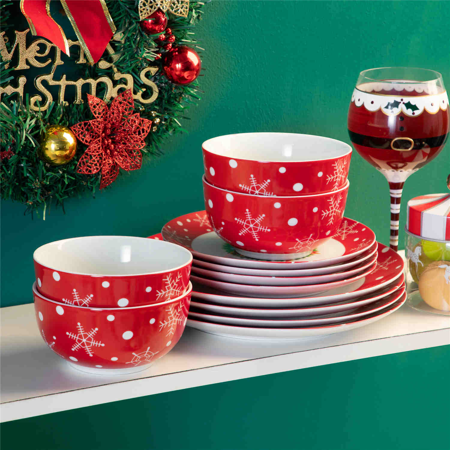 Bring holiday cheer to your table with this festive 12-piece dinnerware set, featuring a joyful Santa Claus surrounded by playful snowflakes and polka dots. The set includes dinner plates, salad plates, and cereal bowls, serving four in style. Made from durable porcelain, it’s perfect for holiday meals and safe for the dishwasher, microwave, and oven. Its space-saving design makes storage easy, making it the perfect addition to your Christmas celebrations.