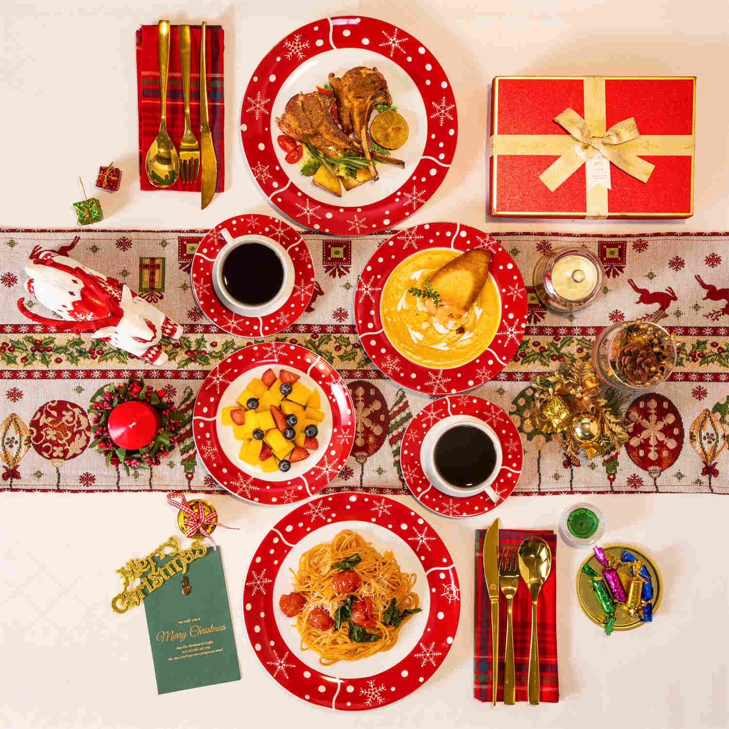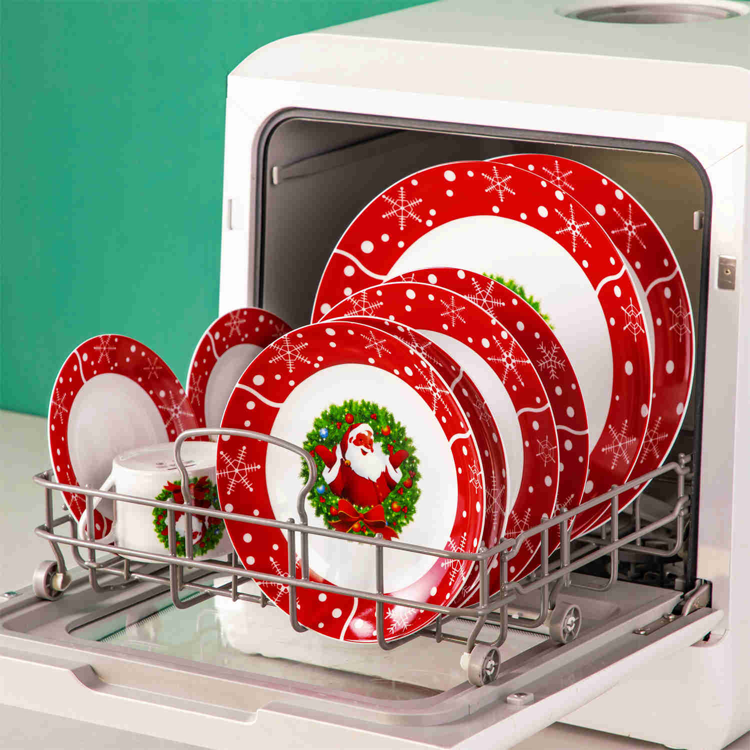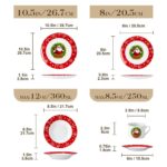 Celebrate the season with this 30-piece dinnerware set, featuring a cheerful Santa Claus surrounded by snowflakes and polka dots. The set includes dinner plates, salad plates, soup plates, cups, and saucers, serving six guests. Made from durable porcelain, it’s perfect for holiday meals and safe for the dishwasher, microwave, and oven. With a space-saving design, it’s easy to store and the perfect addition to your Christmas celebrations.
