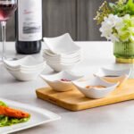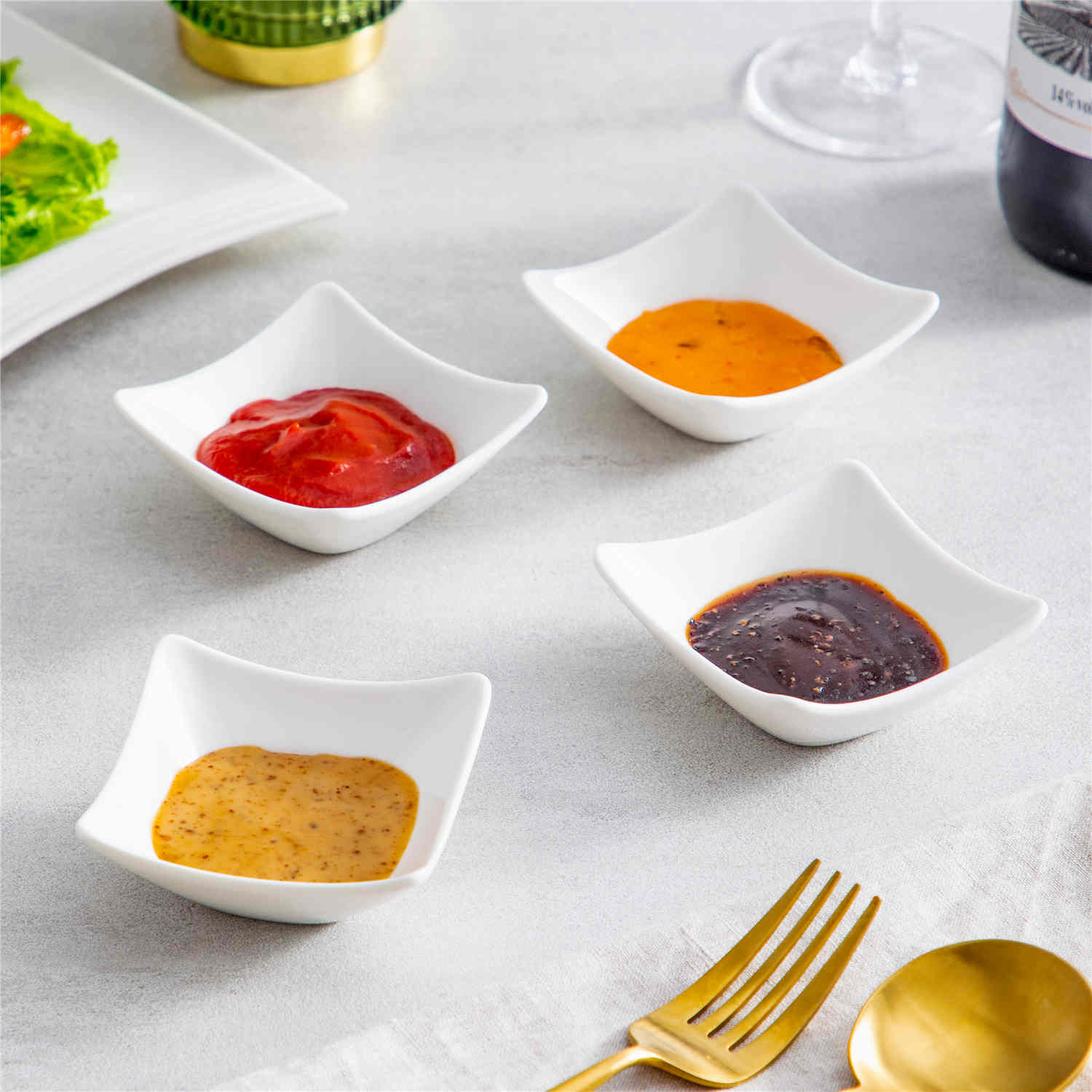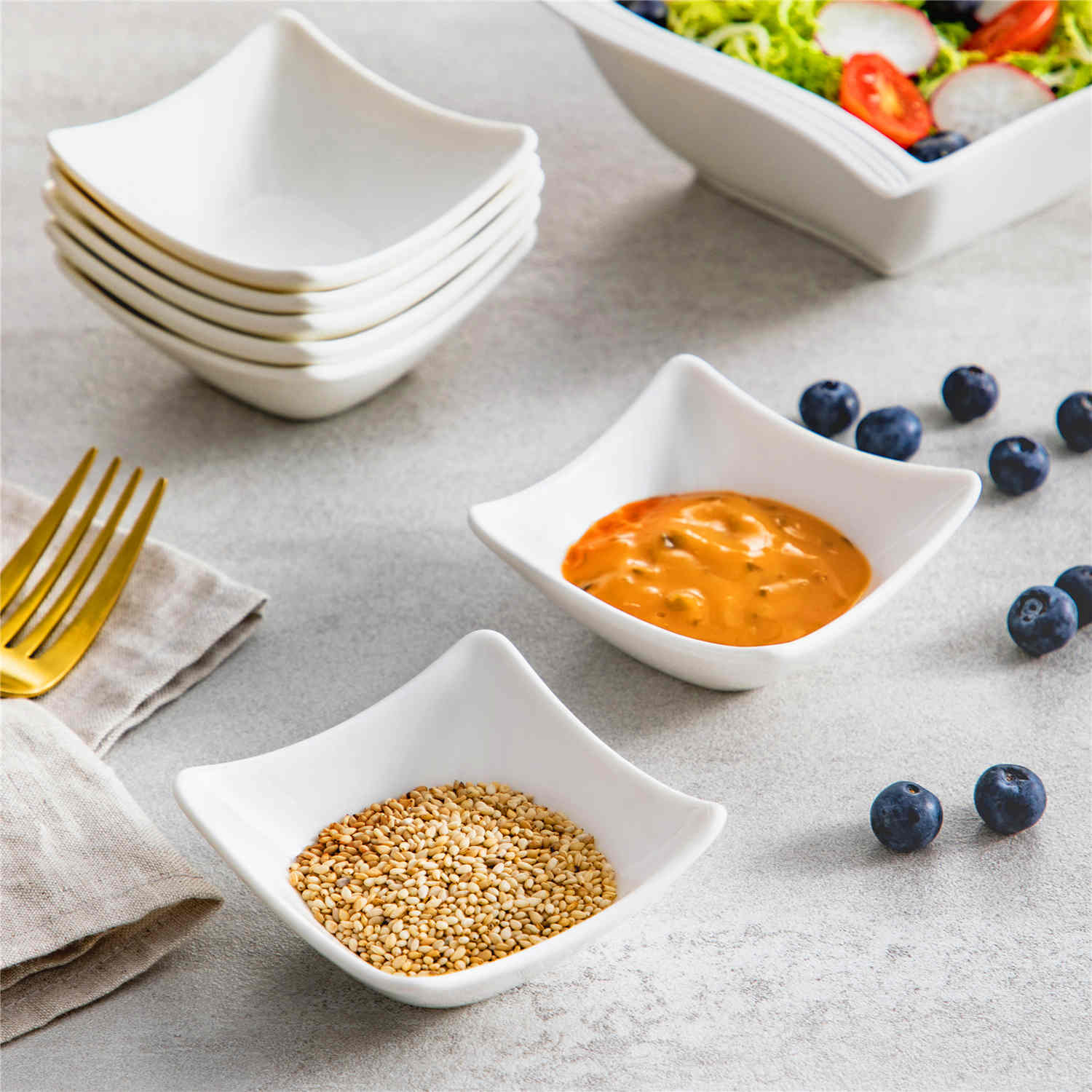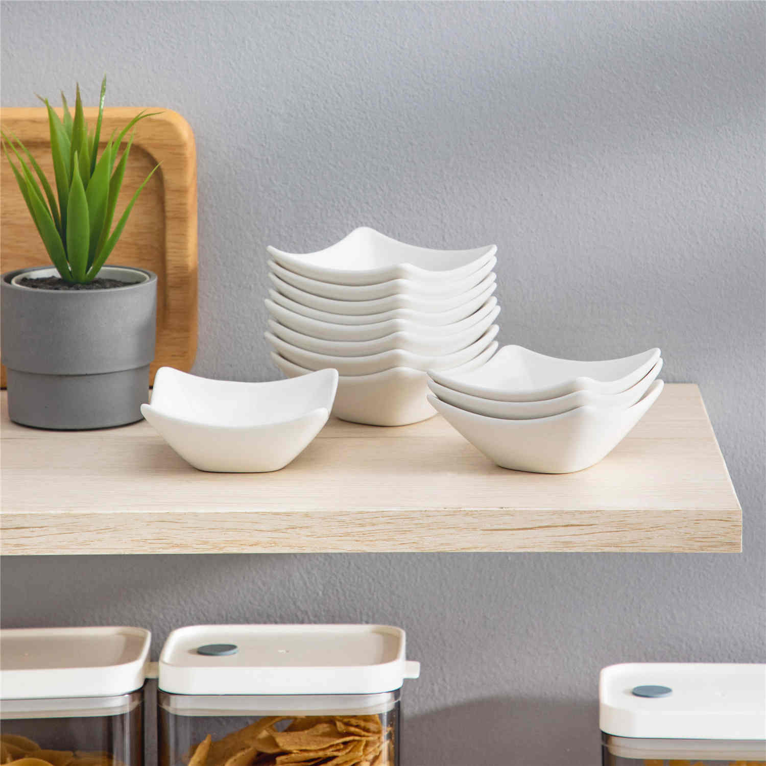 The MALACASA 2oz dip dish set features a chic, angular design in ivory white porcelain. Each square sauce dish adds an artful touch for serving sauces, dips, and condiments with a modern twist. Perfect for presenting soy sauce with dumplings, tangy salsa with tortilla chips, or rich chocolate sauce with fresh strawberries, these dishes elevate your culinary presentation with refined style and precise functionality.