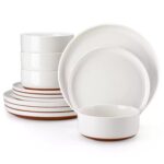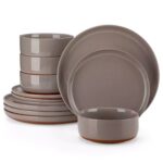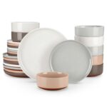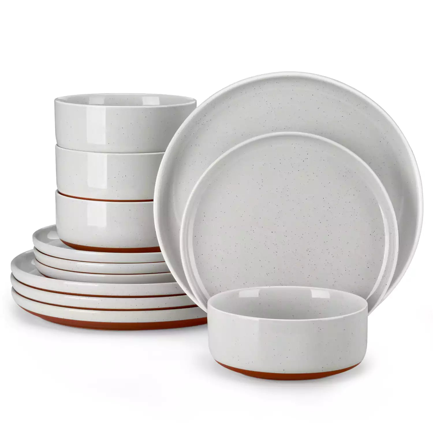 Blending rustic charm with modern simplicity, this 12-piece stoneware dinnerware set is perfect for everyday meals and special occasions. Designed for four, it includes dinner plates, salad plates, and cereal bowls—each with a refined lipped edge, speckled glaze, and a matte clay-colored base for added texture. Available in ivory white, blush pink, cool gray, earthy brown, and a vibrant multicolor option, it adds personality to any table. Enhanced with Glidecoat technology, it resists scratches, grease, and heat. Microwave, oven, and dishwasher safe.