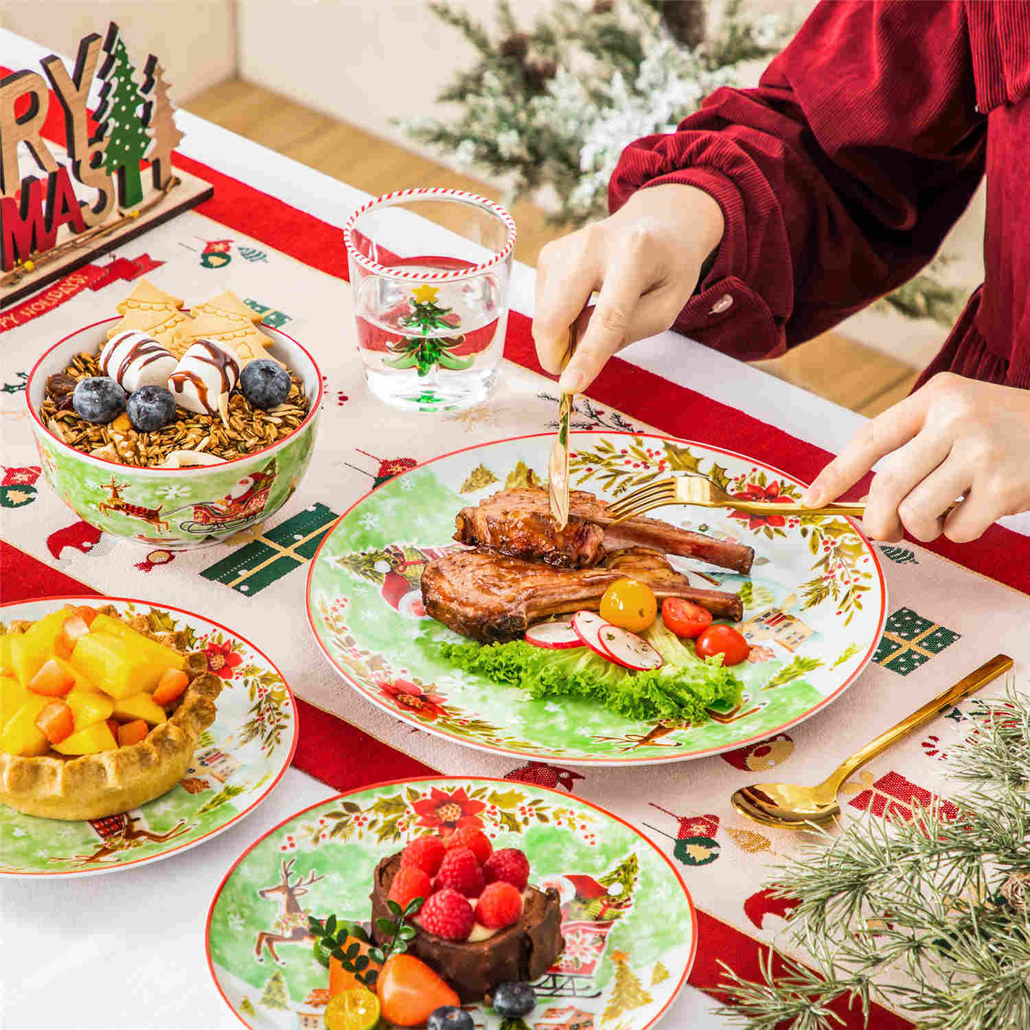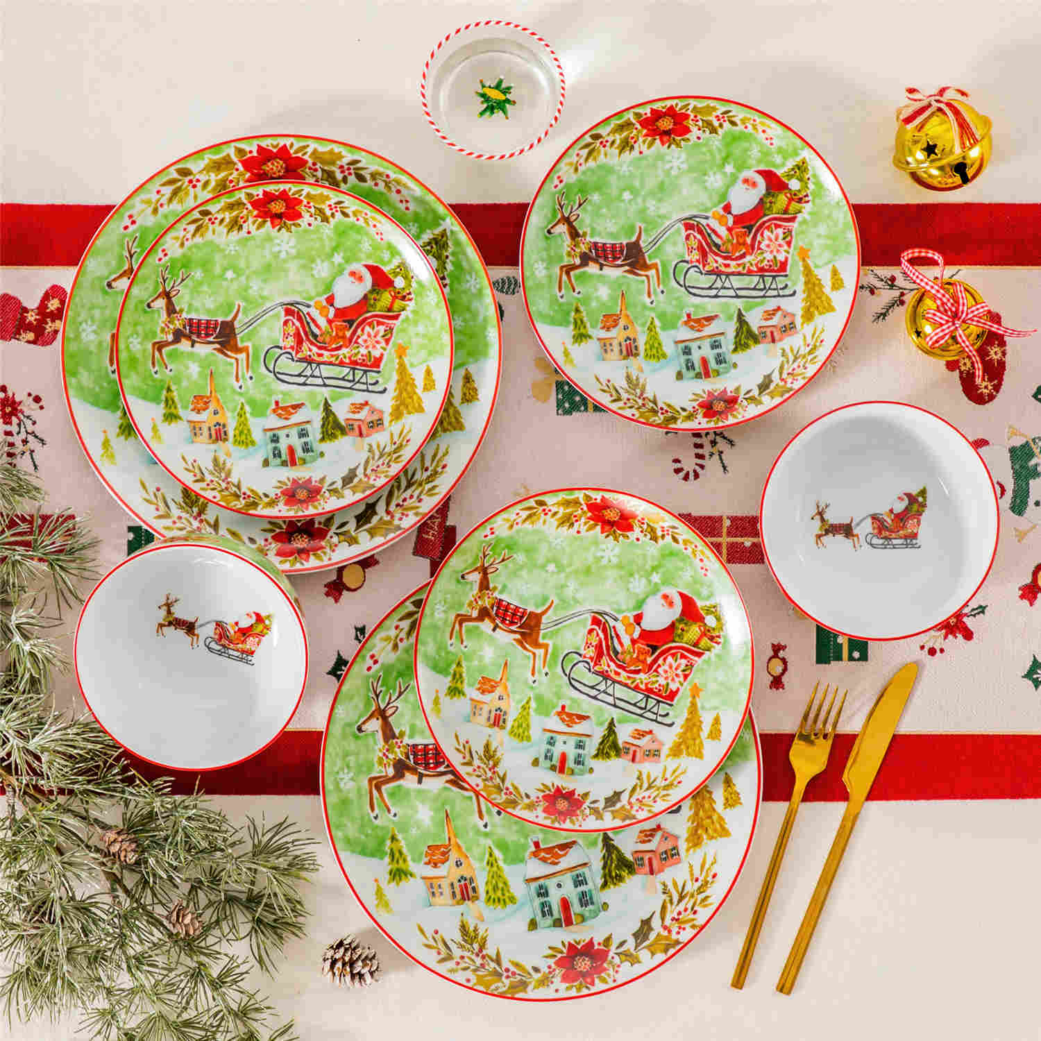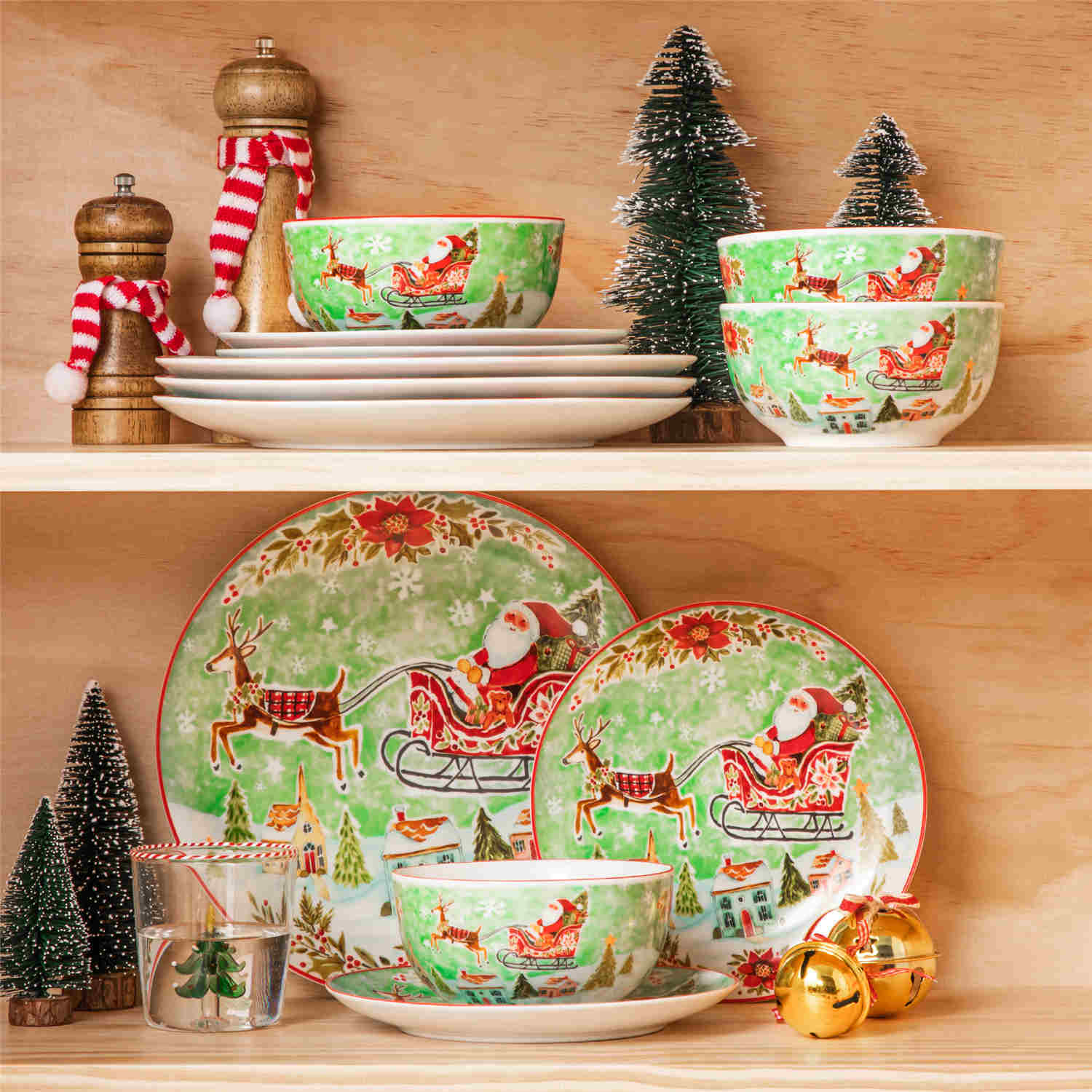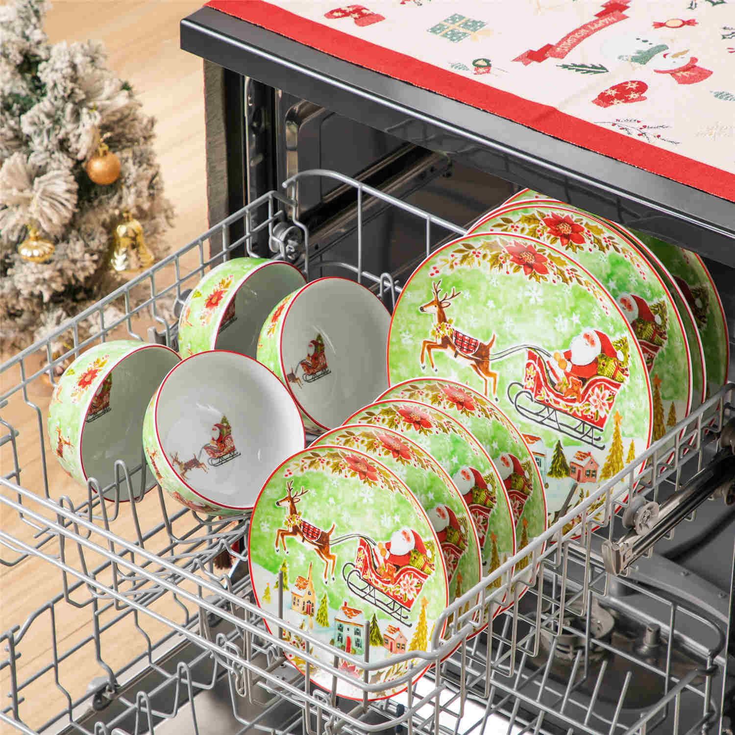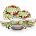 Celebrate the holidays with this 12-piece dinnerware set, featuring Santa and reindeer designs. The set includes dinner plates, salad plates, and cereal bowls for four, all crafted from durable porcelain. Microwave and dishwasher safe, it’s perfect for joyful family meals and festive gatherings, bringing warmth and holiday cheer to your table.