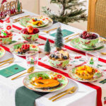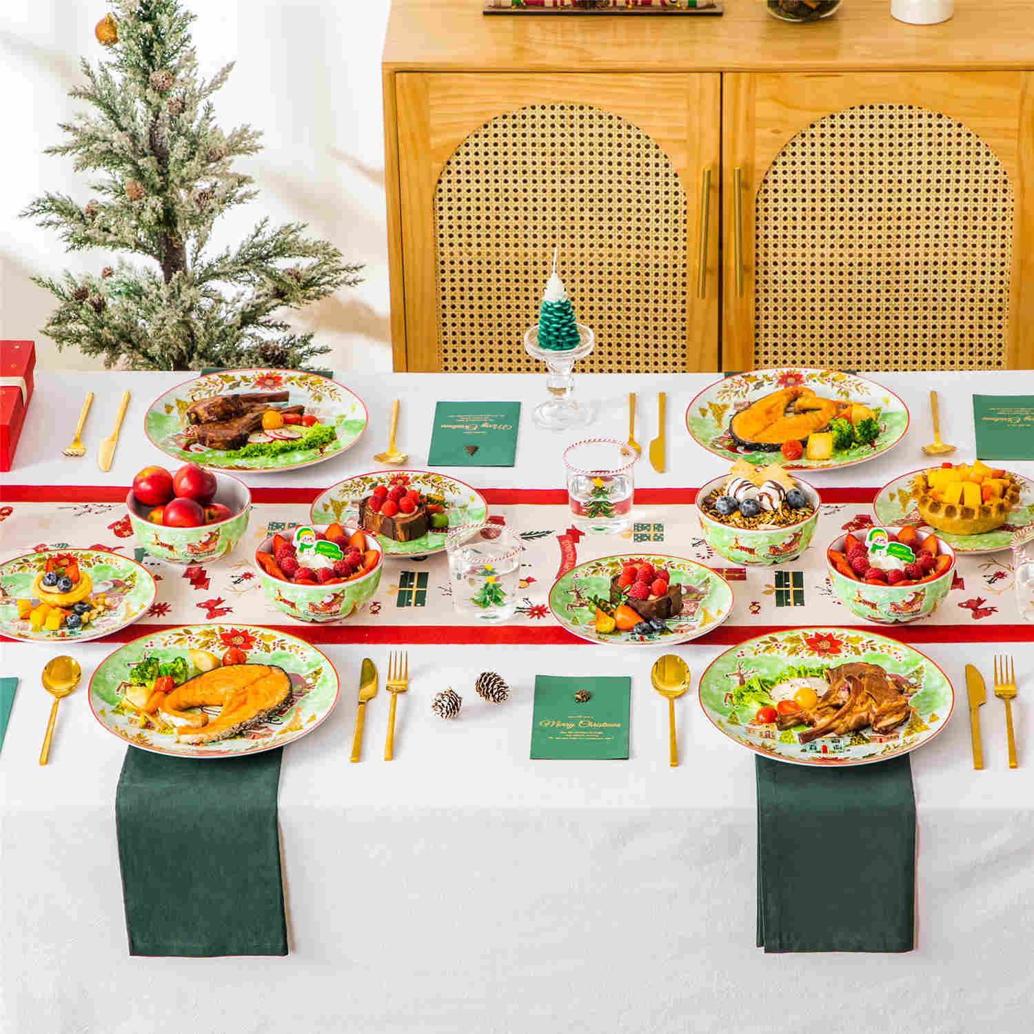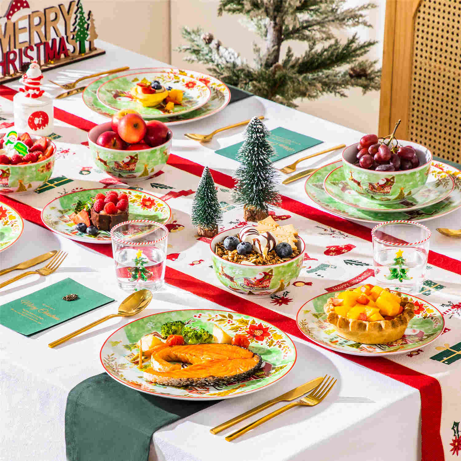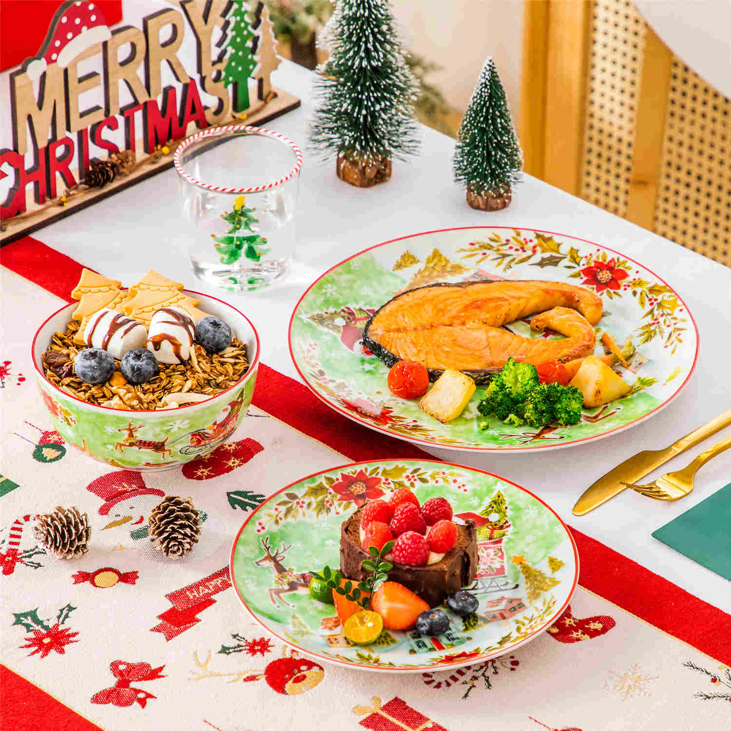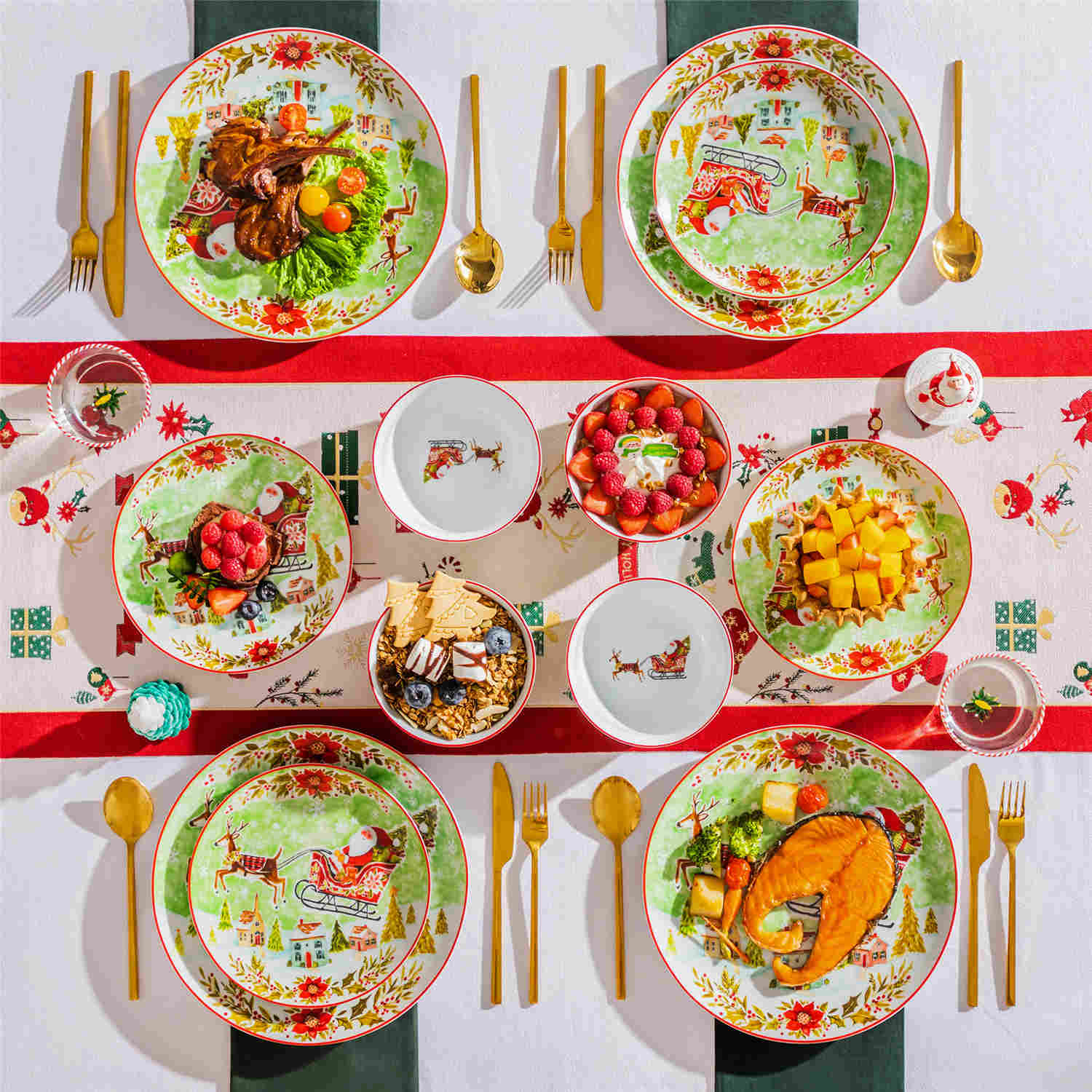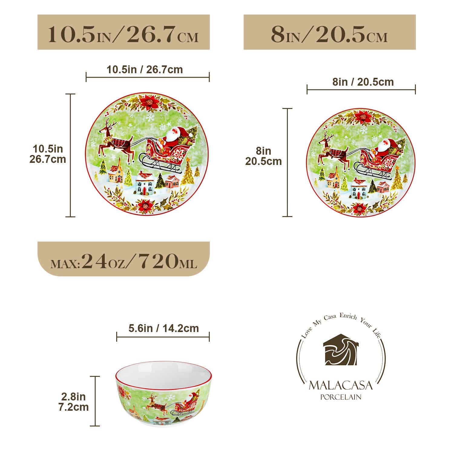 Celebrate the holidays with this 12-piece dinnerware set, featuring Santa and reindeer designs. The set includes dinner plates, salad plates, and cereal bowls for four, all crafted from durable porcelain. Microwave and dishwasher safe, it’s perfect for joyful family meals and festive gatherings, bringing warmth and holiday cheer to your table.