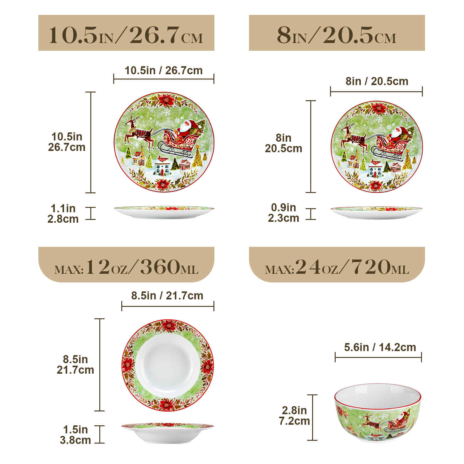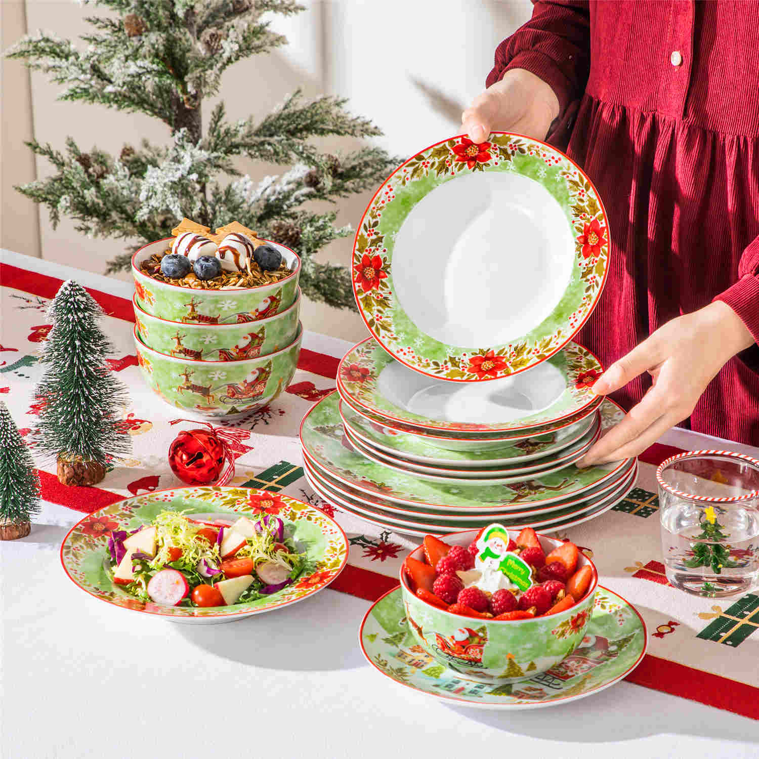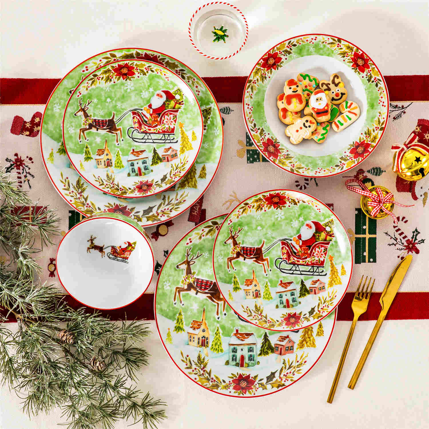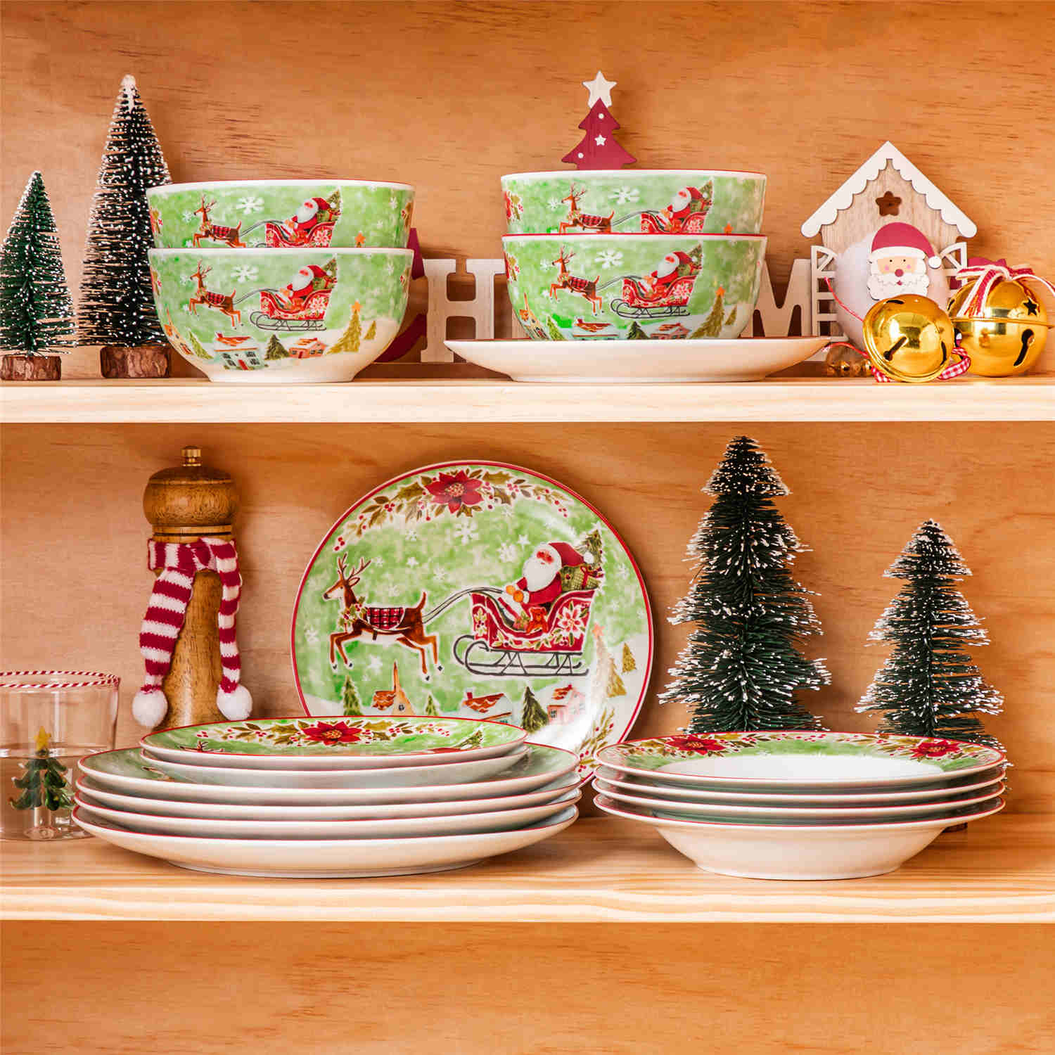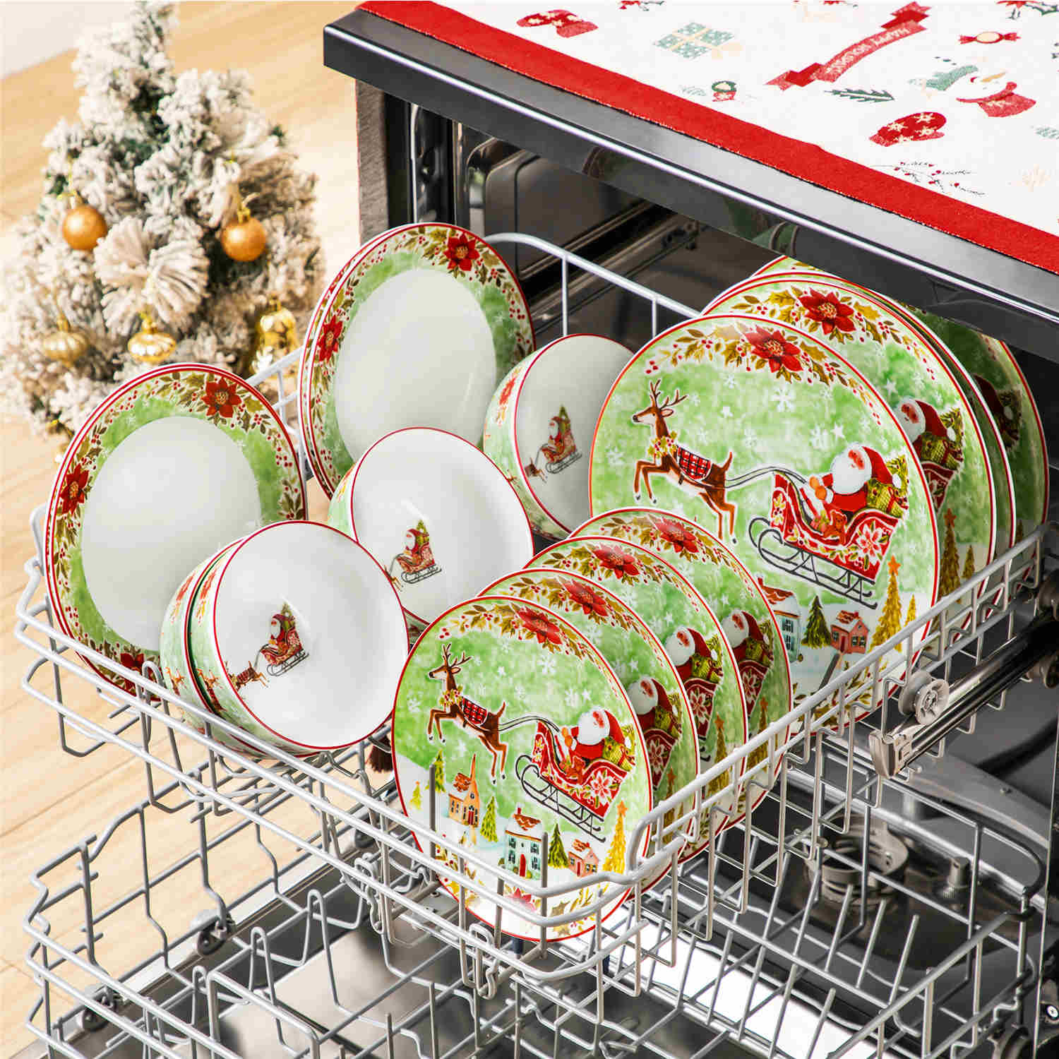 Celebrate the season with this 16-piece porcelain dinnerware set, featuring Santa, reindeer, and vibrant poinsettias. The set includes dinner plates, salad plates, soup plates, and cereal bowls for four. Stackable and non-toxic, it’s microwave, dishwasher, and oven safe, perfect for holiday meals and family gatherings. Bring festive charm to your table and create lasting holiday memories!